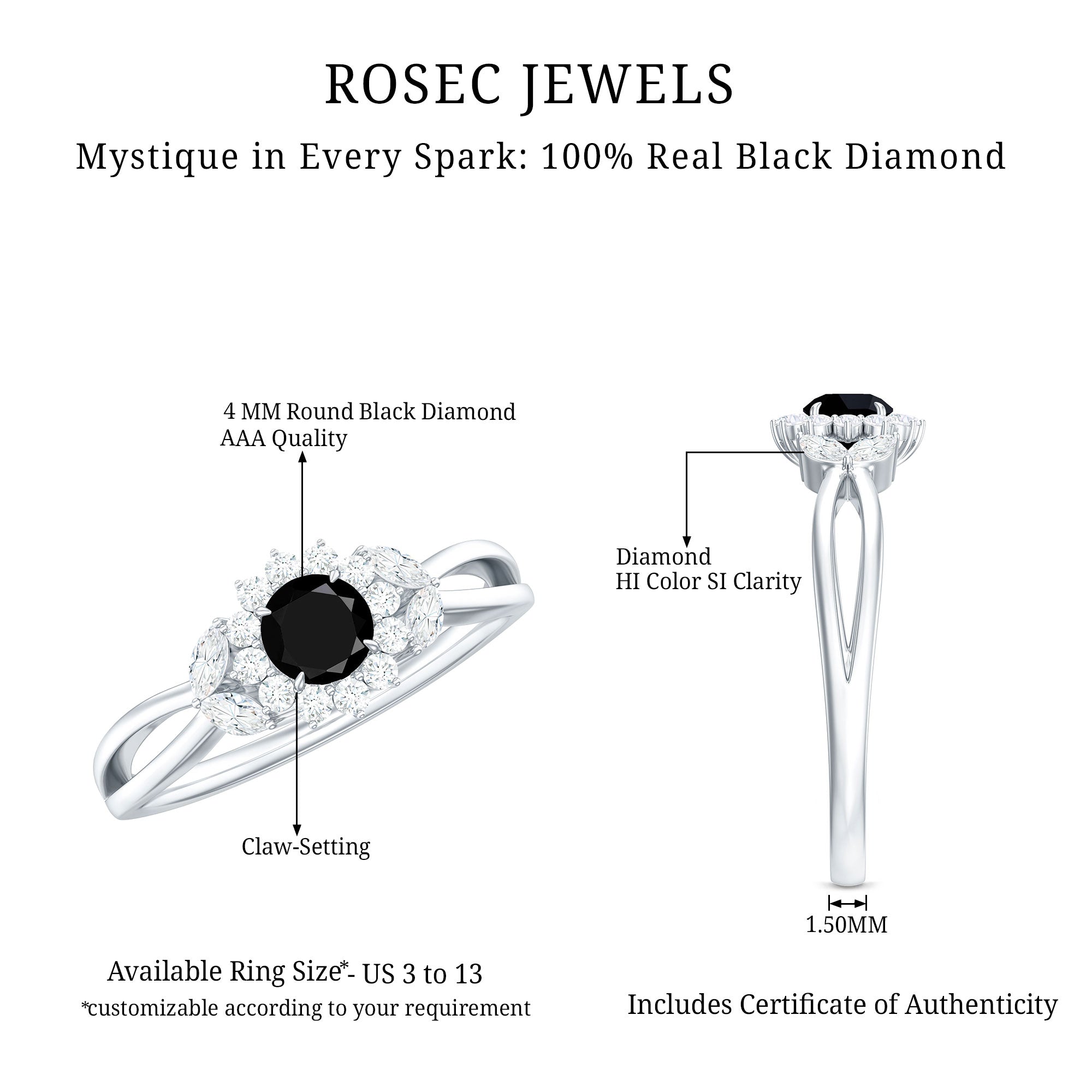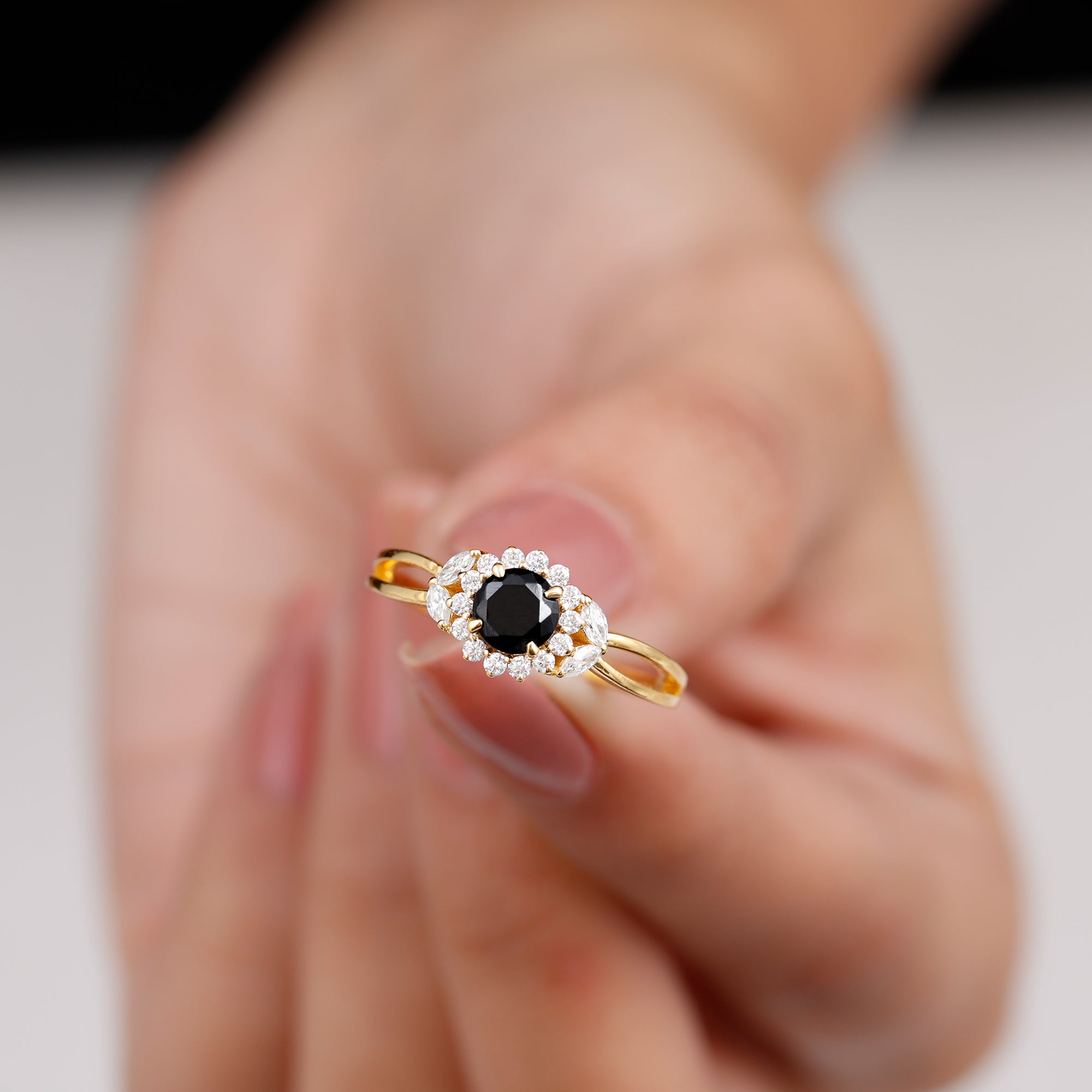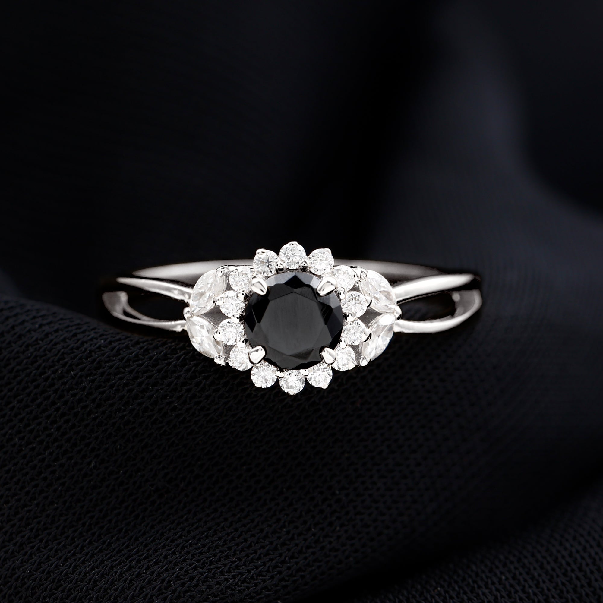 This Flower Ring is embellished with Round Shape Black Diamond secured in Claw Setting while Marquise and Round Shape Diamond giving it an elegant look. The Black Diamond Ring is composed of Hallmarked Metal that will enhance your style and fill your day with compliments. Flaunt this Black Diamond Ring on days when you feel like adding a little sparkly touch to your looks. Get this Floral Ring for your special one and make her feel special.