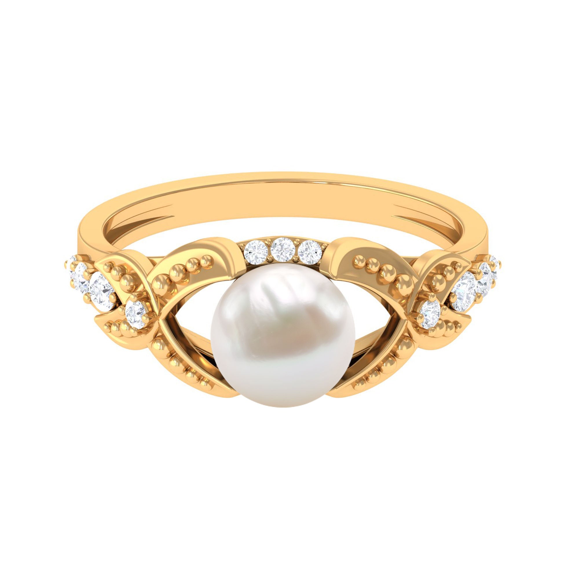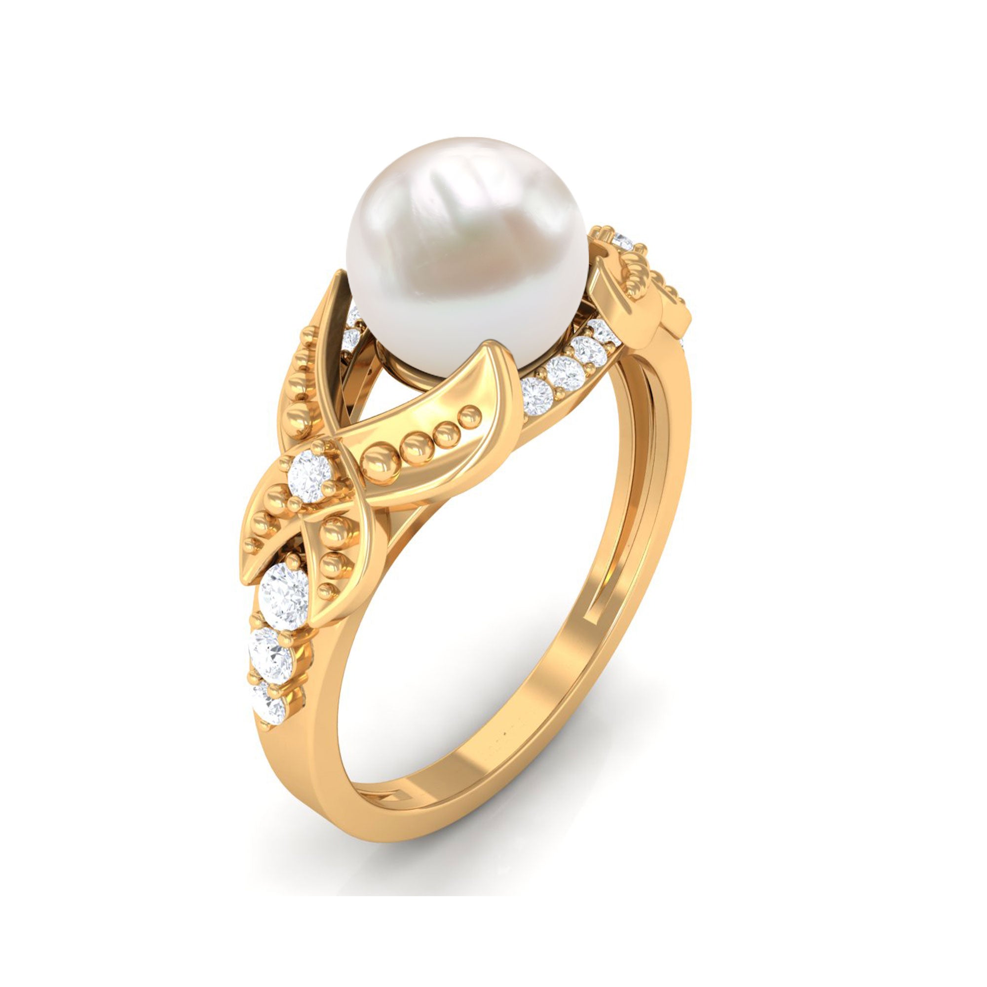 Present this captivating Solitaire Engagement Ring to your lady love. Embellished with elegant Round Shape Freshwater Pearl in bead setting while Round Diamonds studded on its intriguing shank. The Freshwater Pearl Ring will shine forever and her jewelry collection wont be complete without including this Solitaire Ring.