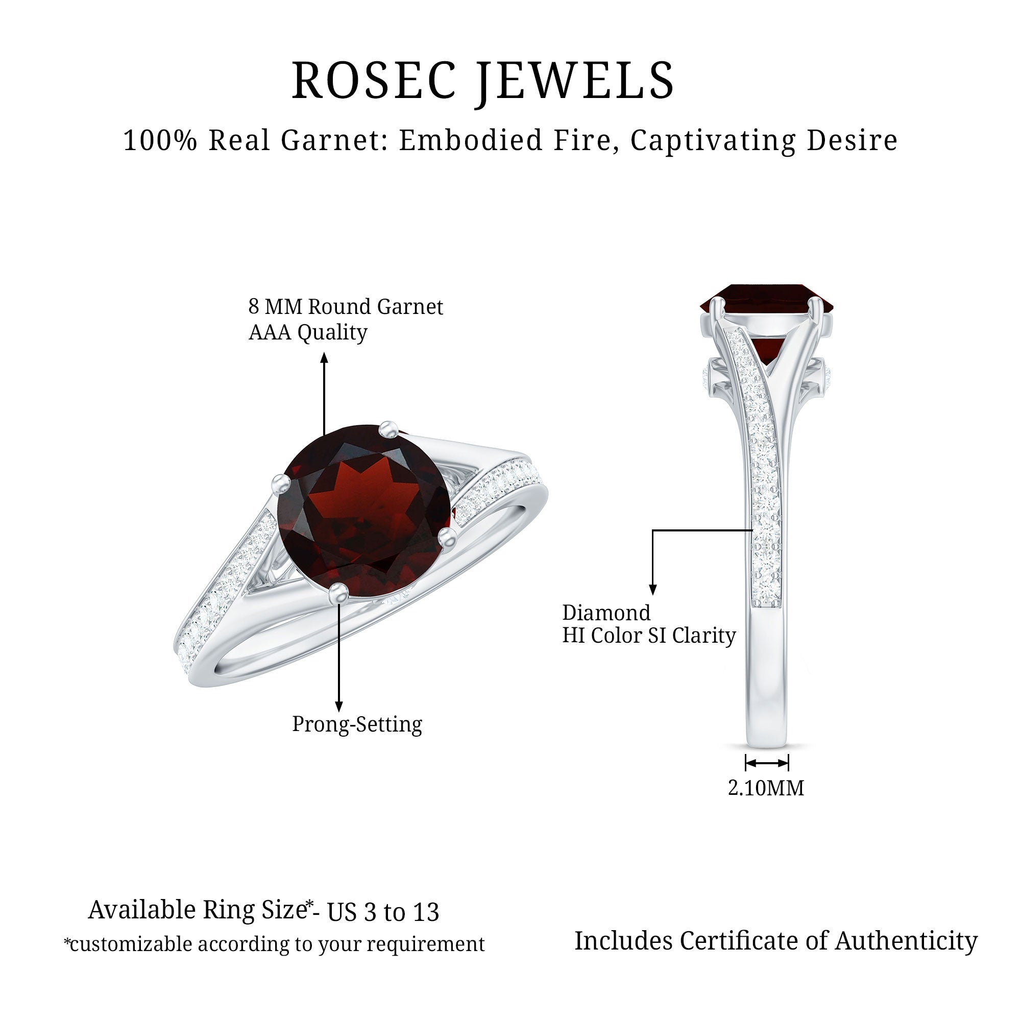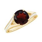 Introducing an accessory that embodies your strength and individuality, our Solitaire Engagement Ring boasts a bold Round Shape Garnet Solitaire, elegantly showcased in a Prong Setting with Diamond accent. The Gold Band with a Split Shank adds the finishing touch to this eccentric engagement ring, making it an ideal gift to reignite the love between you and your significant other.