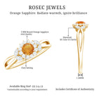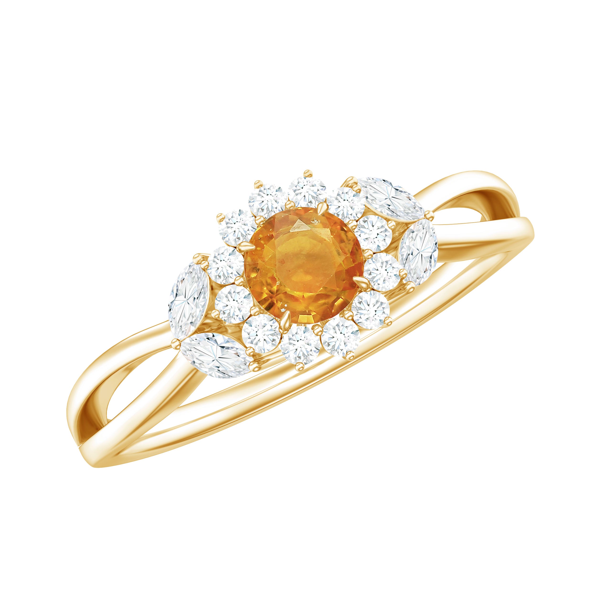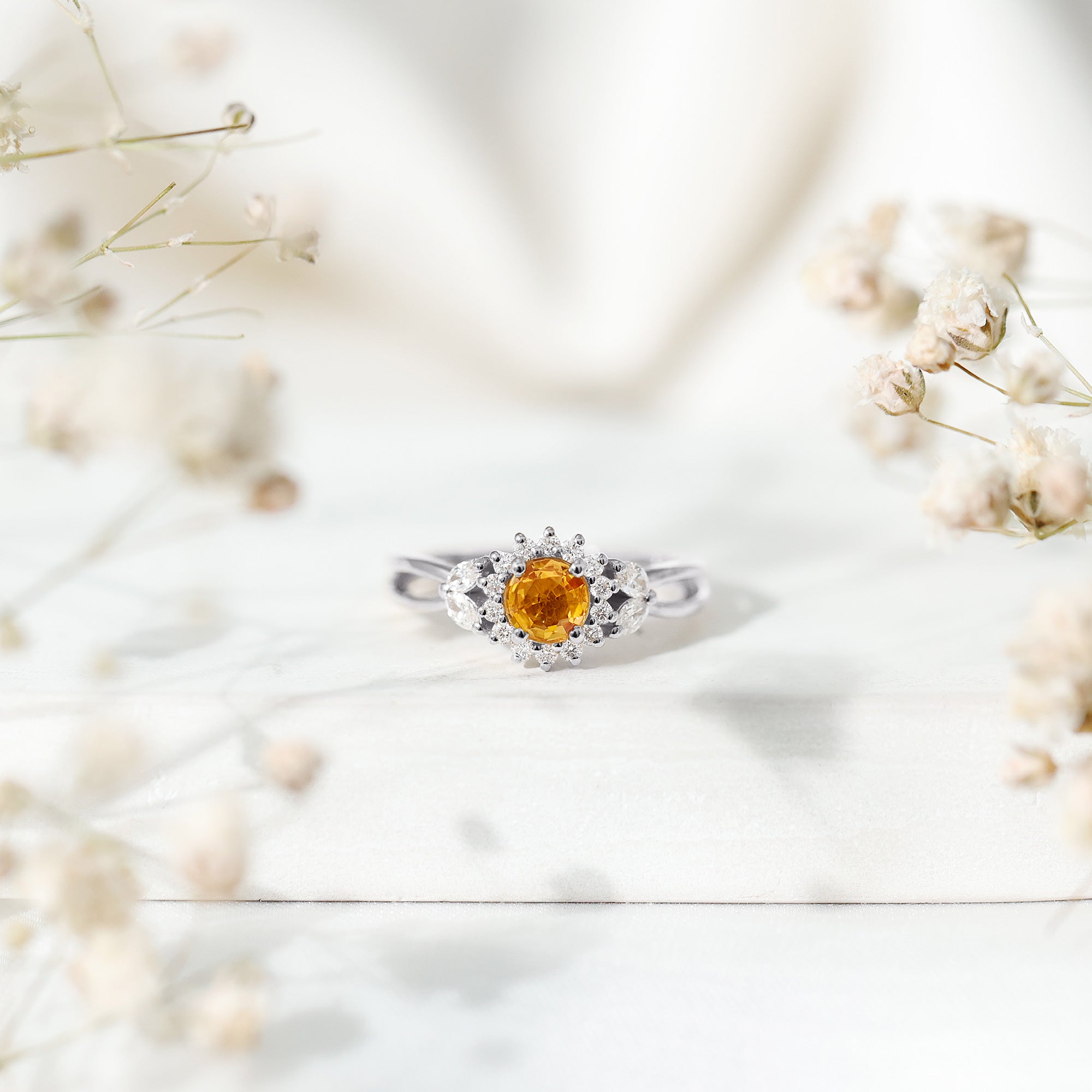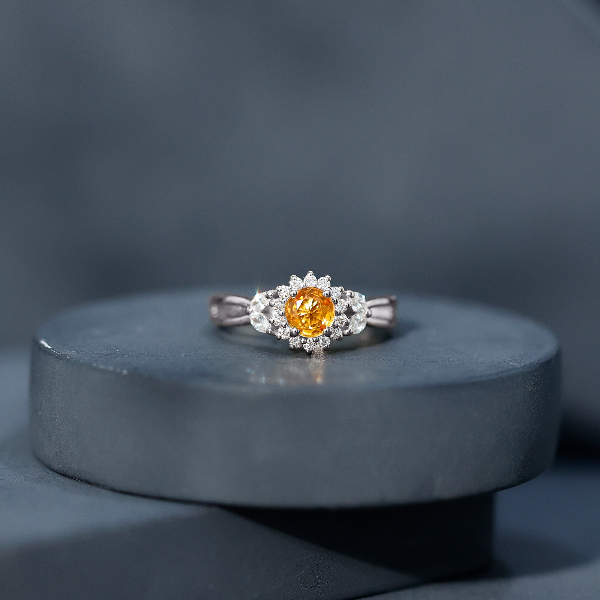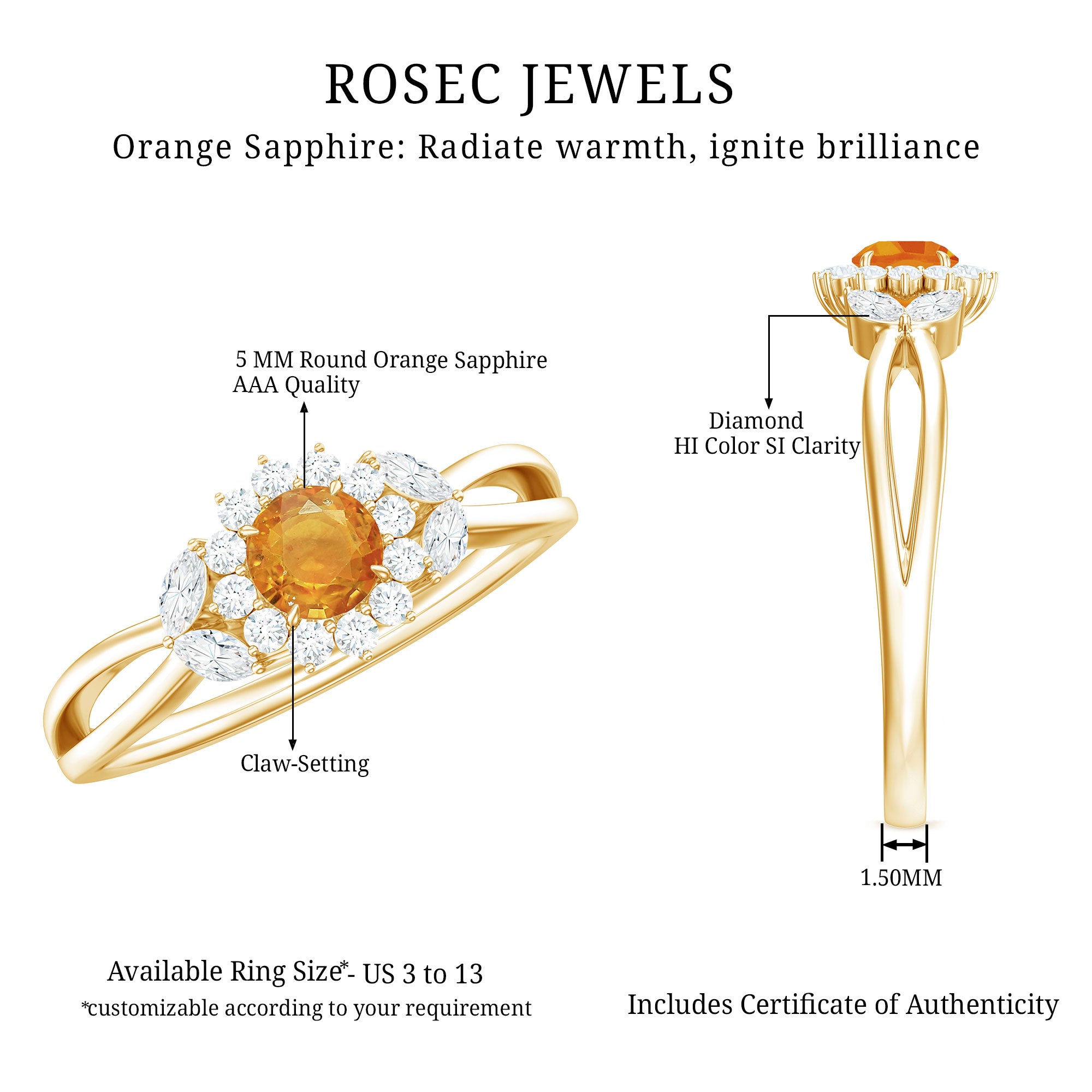 This Engagement Ring in the shape of a flower, boasts a sparkling round-cut orange sapphire at its center surrounded by Diamond accents. Its split shank design adds to its classic beauty.
