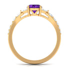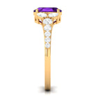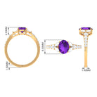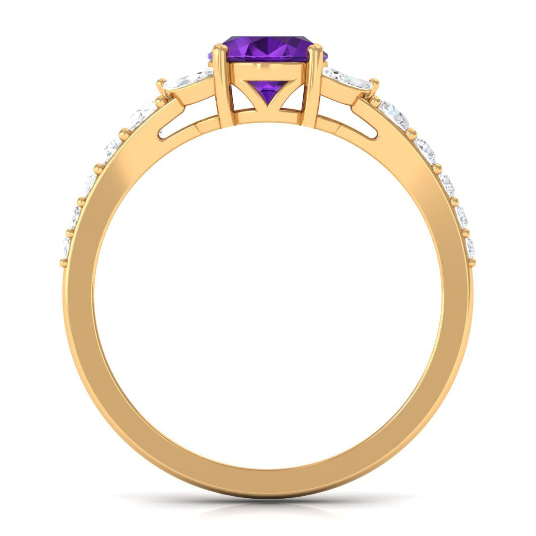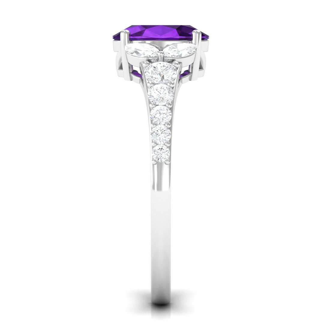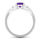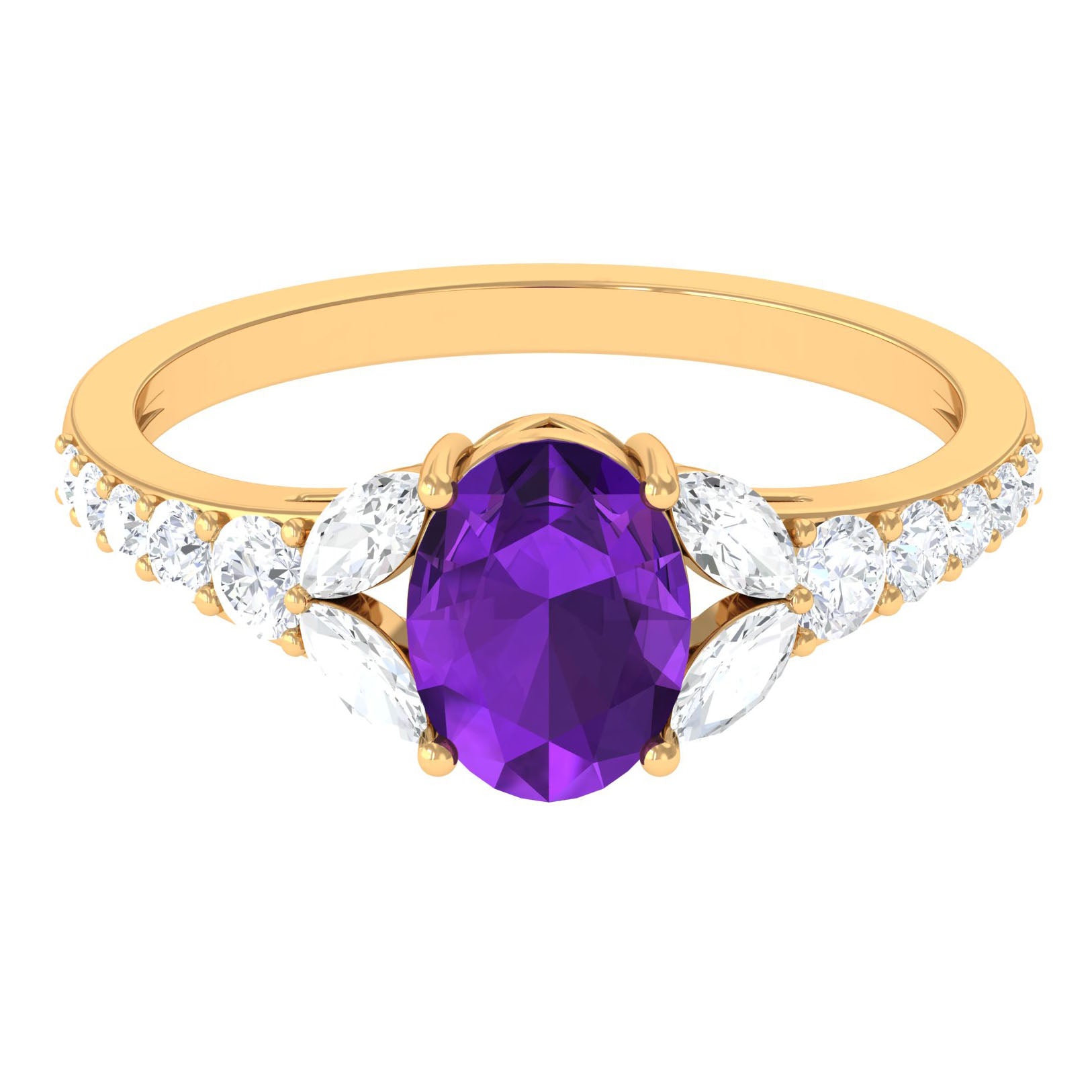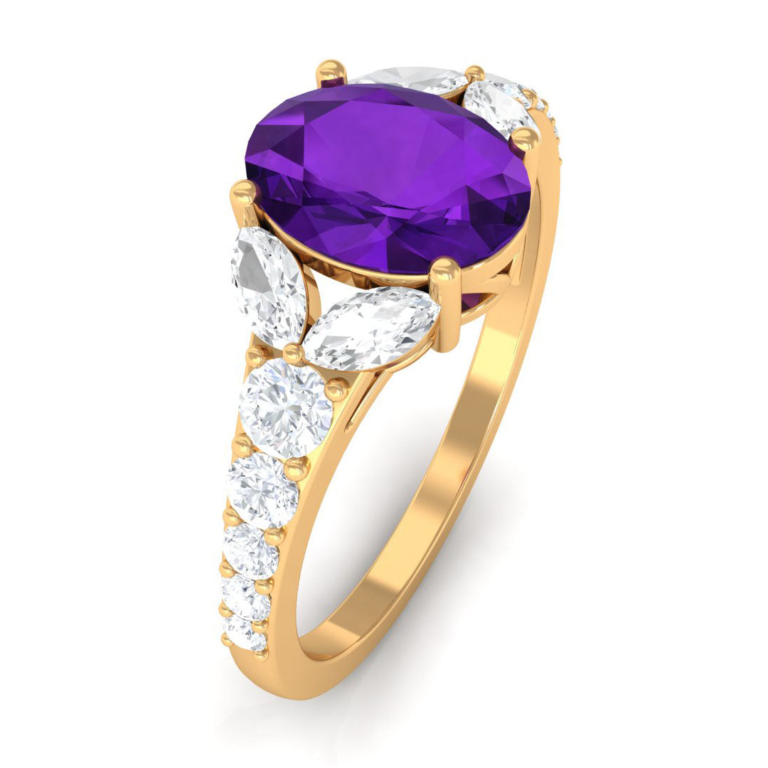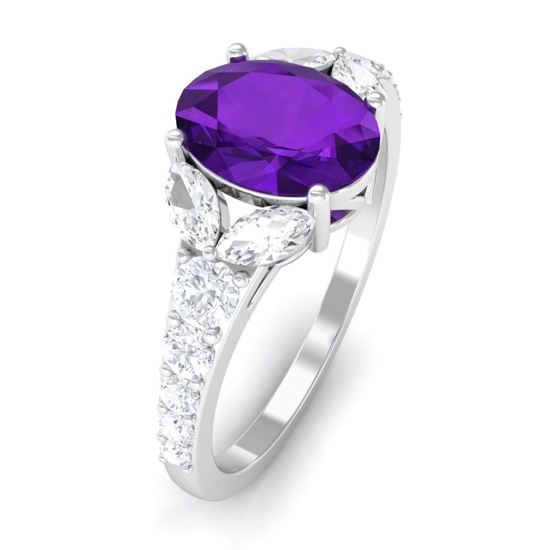 Embrace the allure of this Purple Engagement Ring that showcases a 6X8 MM Oval Shape Amethyst gemstone set in Prong Setting, which commands attention with its elegance and charm. The split shank band adorned with Marquise and Round Shape Moissanite gemstones adds a touch of modernity to the classic design. This ring is a captivating fusion of sophistication and brilliance, making it an ideal symbol of your love and style.