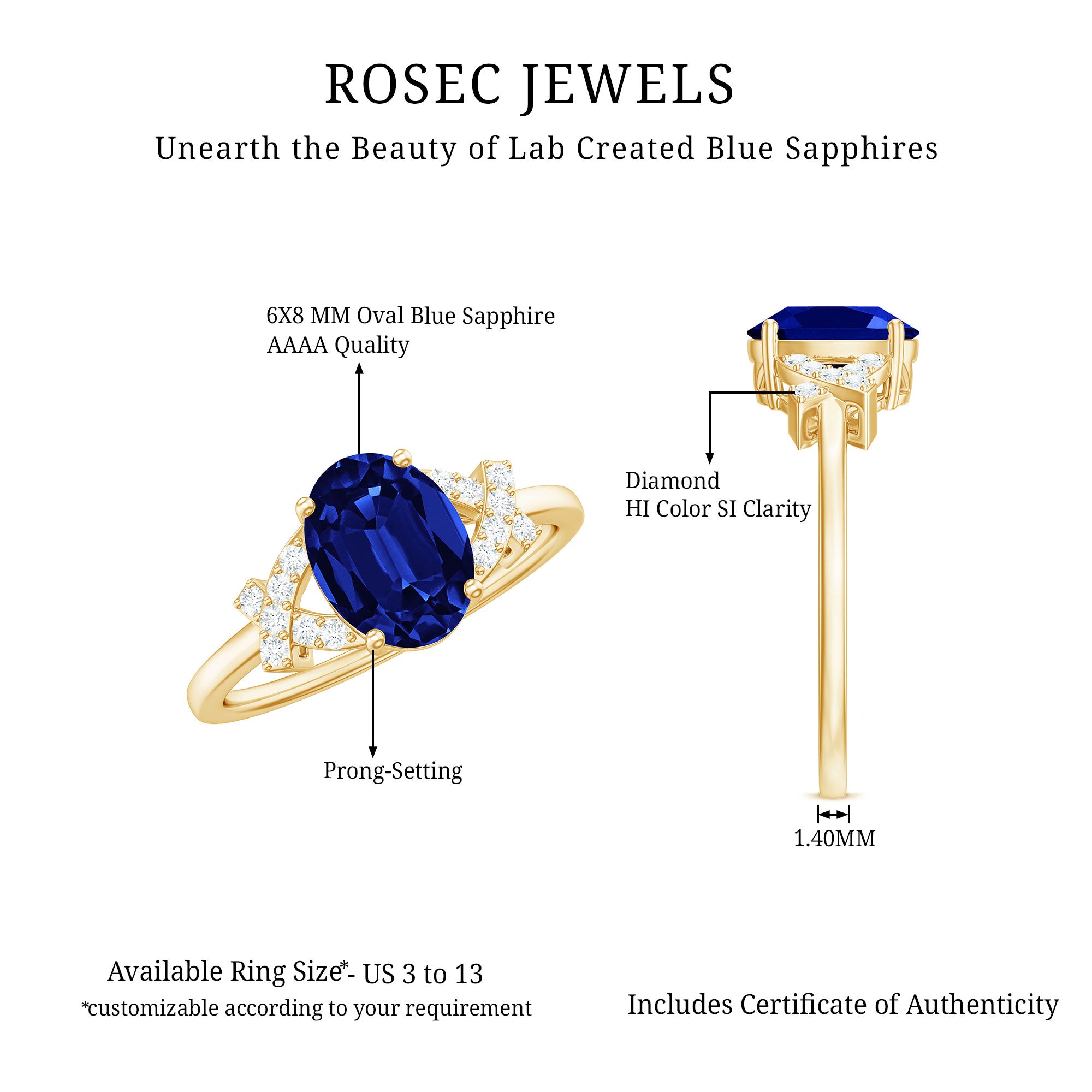Propose with this stunning Created Blue Sapphire Engagement Ring and be ready for a flood of compliments. The 6X8 MM oval cut Created Blue Sapphire in a prong setting, paired with round Diamond accent on the solitaire engagement ring, symbolizes your commitment for a lifetime. This unique oval Created Blue Sapphire solitaire ring will steal her heart.