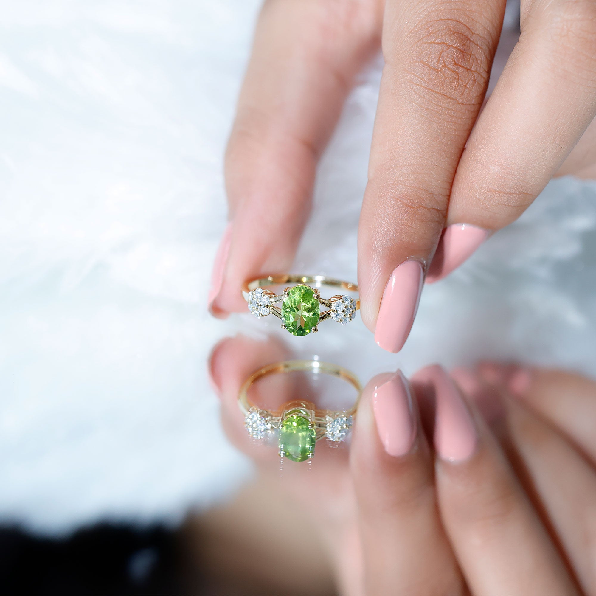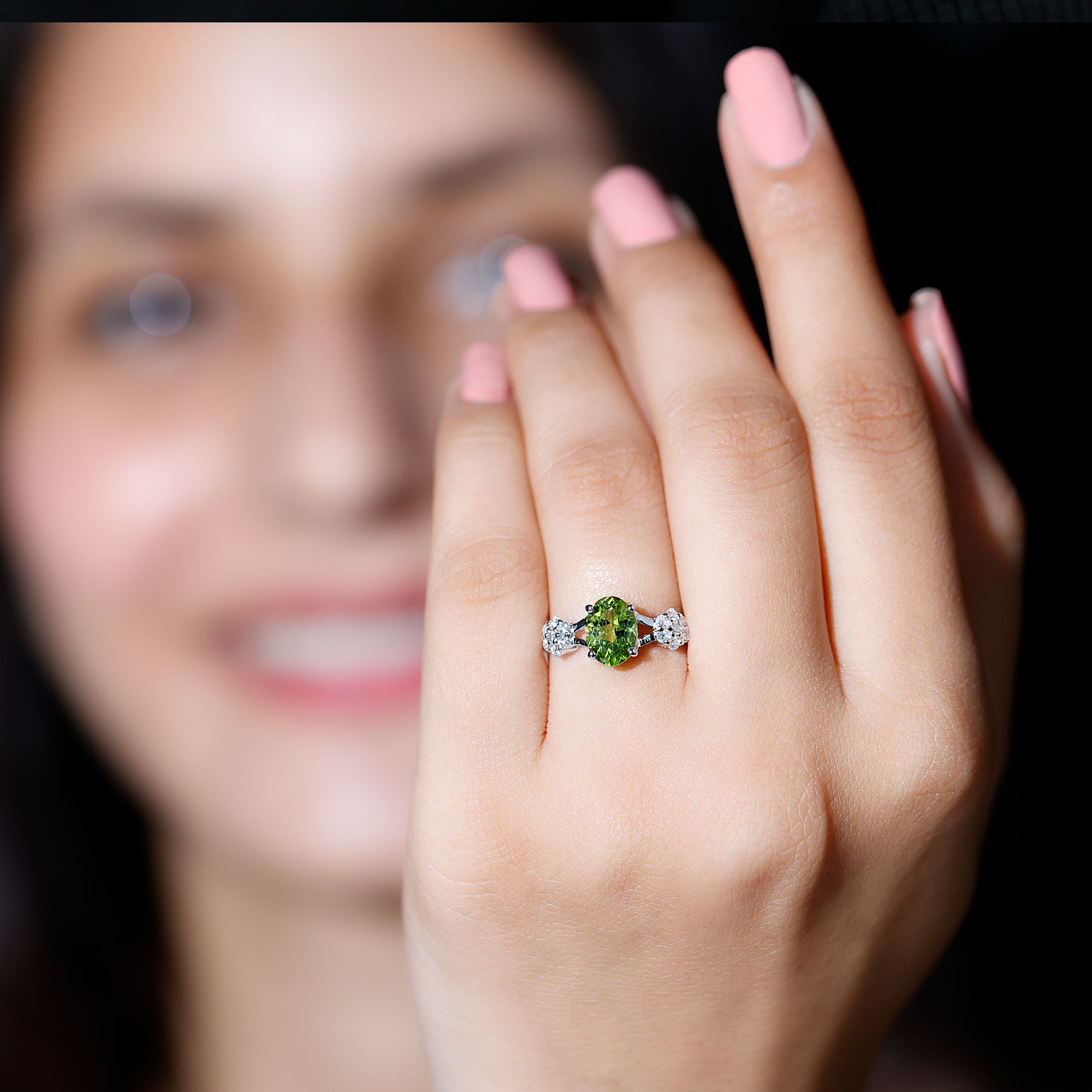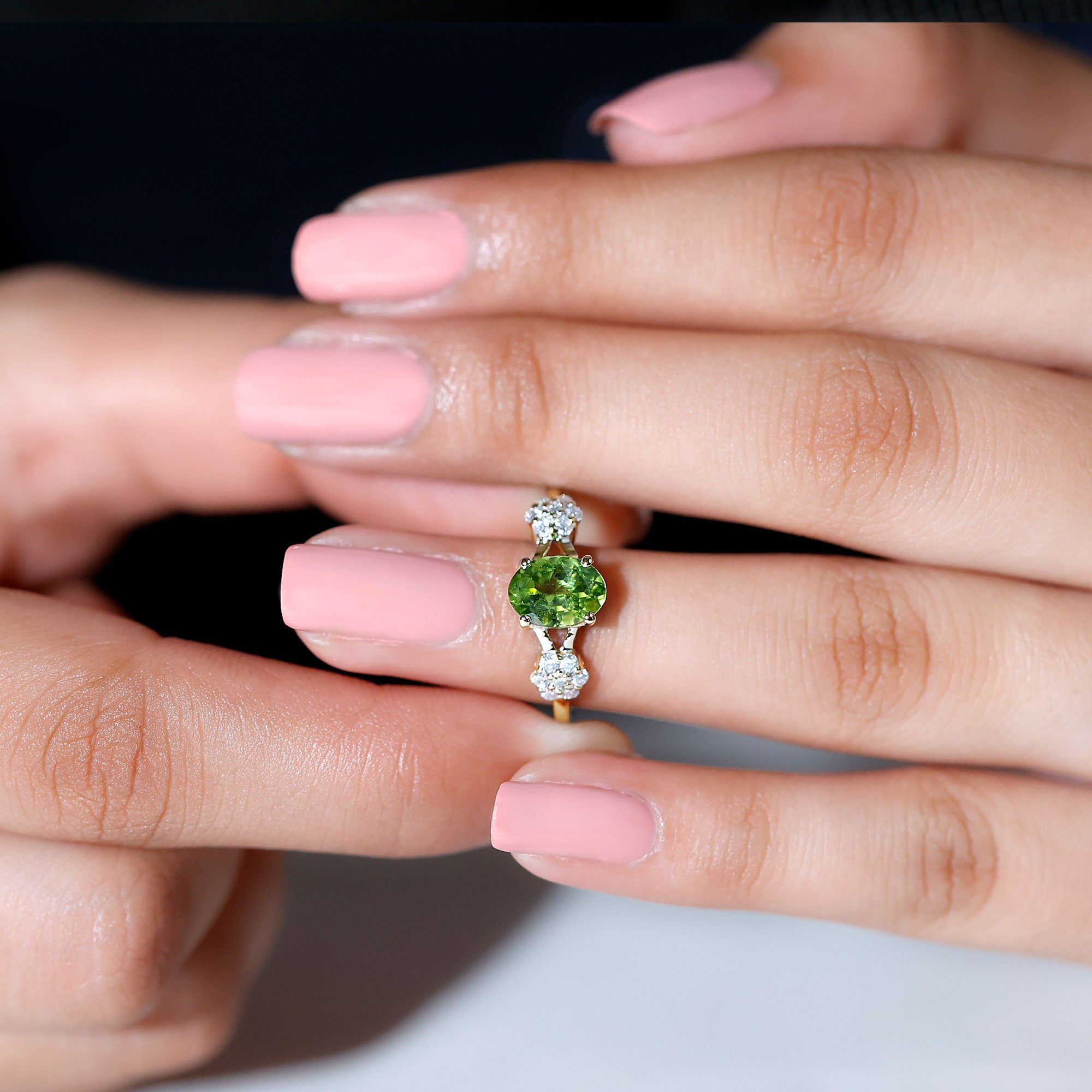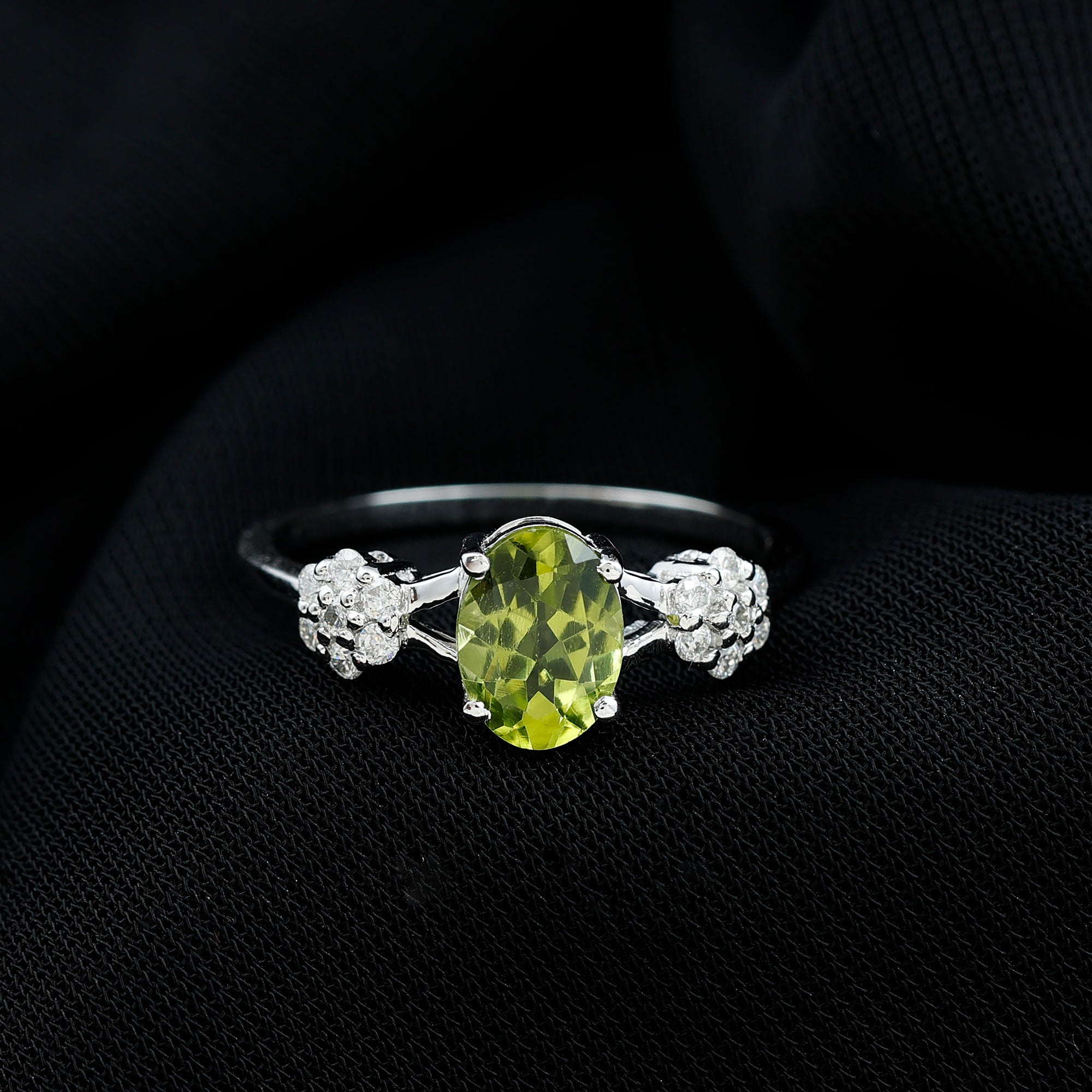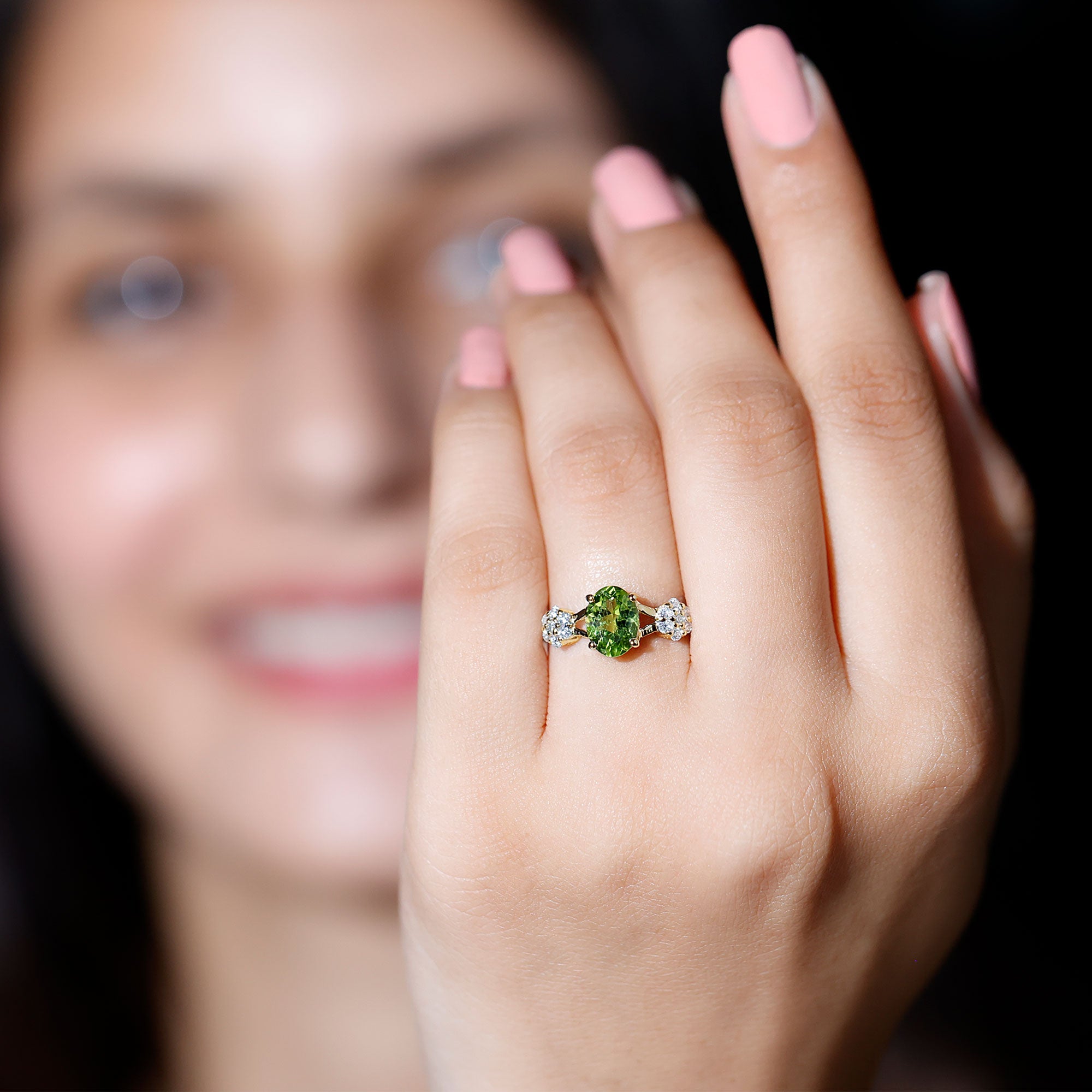 Draw attention to your style with this Cocktail Ring adorned with Oval Cut Peridot in Claw Setting with Round Moissanite Stones set in flower pattern on either side. The Flower Ring is molded in Gold metal and has a unique and luxurious design that is perfect for special occasions. This Split Shank Ring is a perfect statement piece that adds a touch of sophistication and glamour to any outfit.
