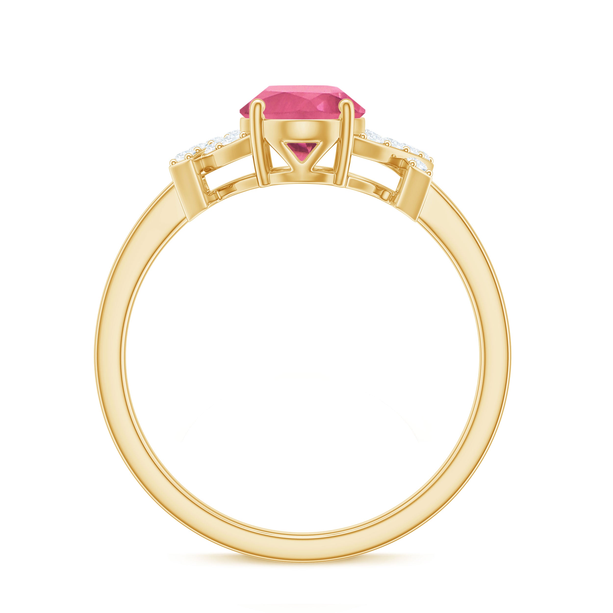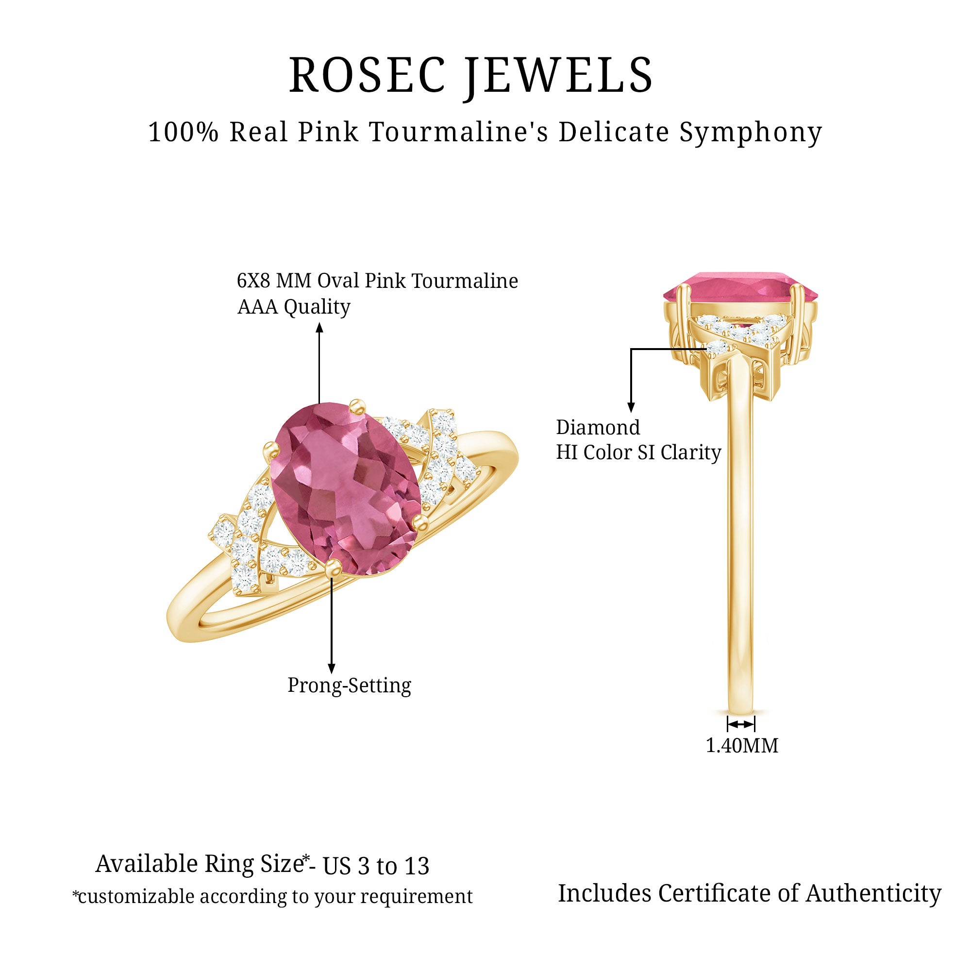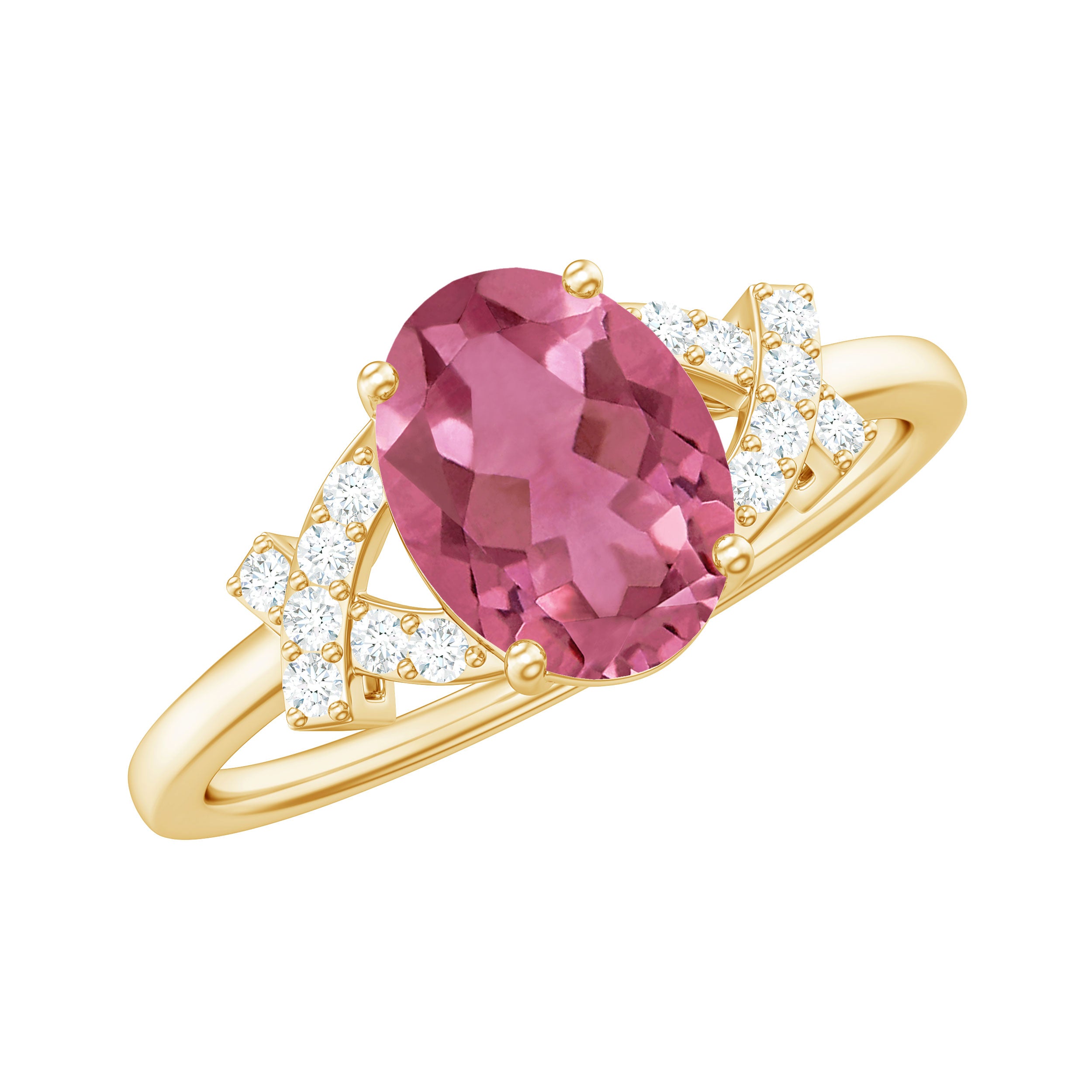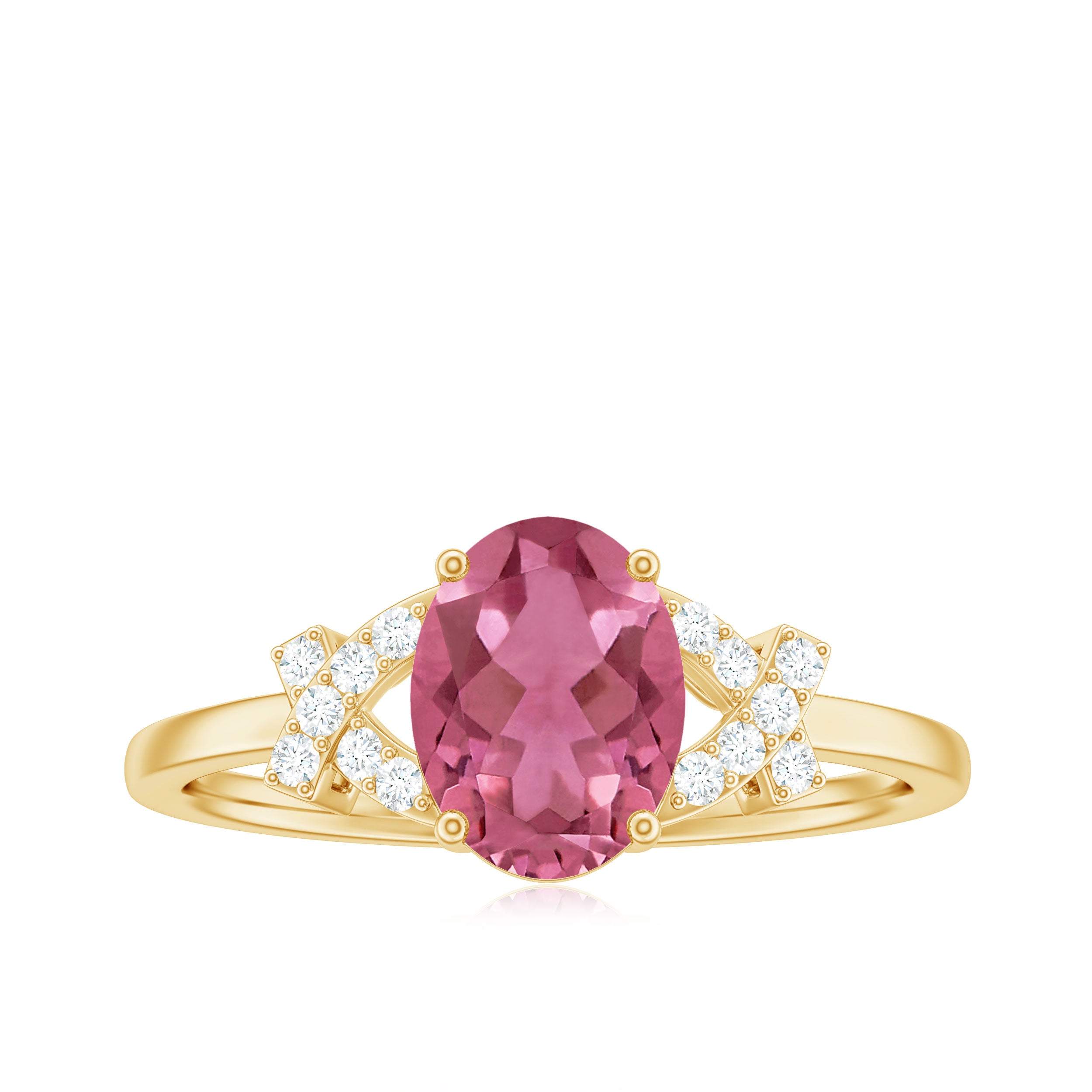 The split shank design separates as it approaches the center stone, creating visual openness and added dimension. This structural detail enhances the oval silhouette while providing balanced support. The solitaire-inspired focus keeps attention on the pink tourmaline, with diamonds complementing rather than overpowering the central gemstone.