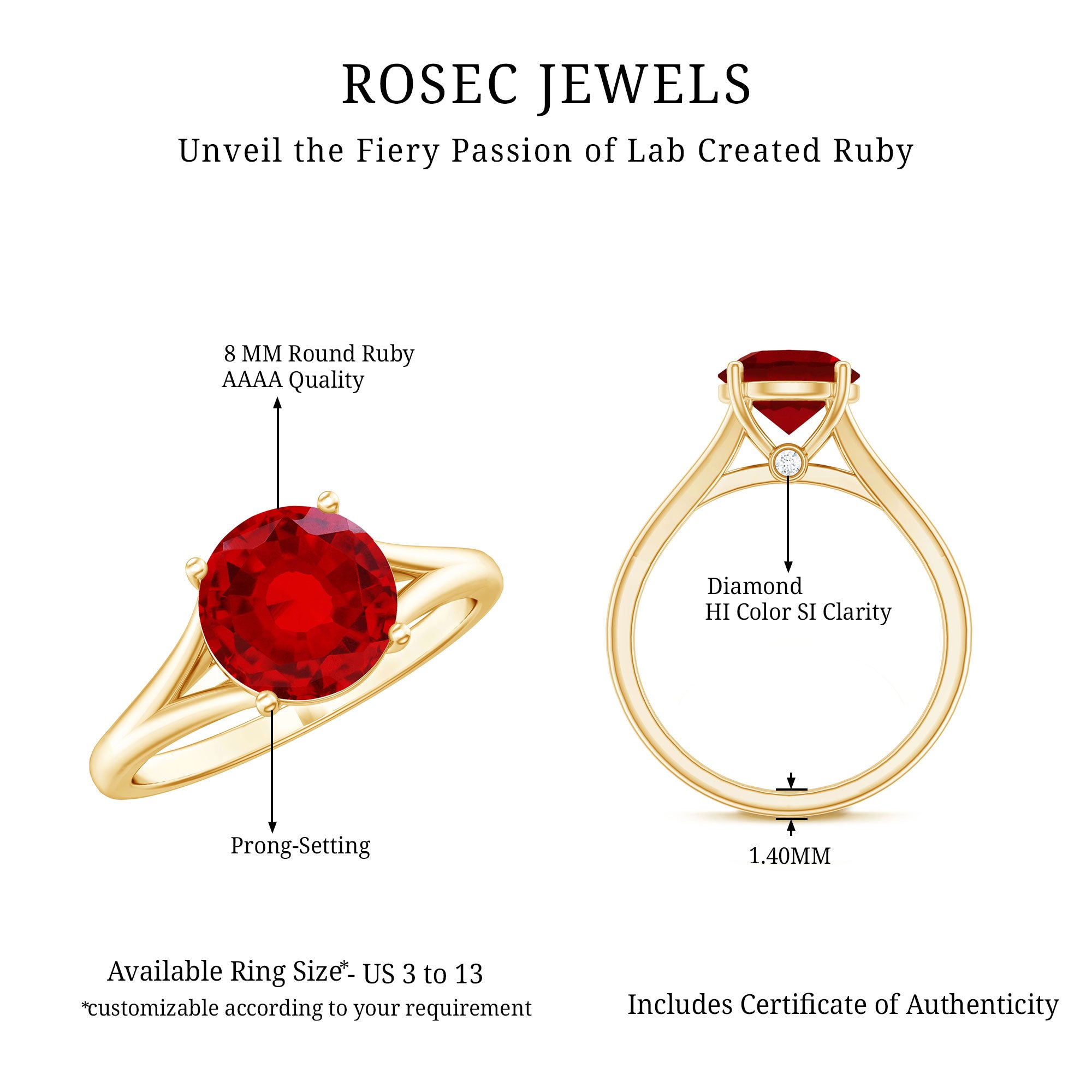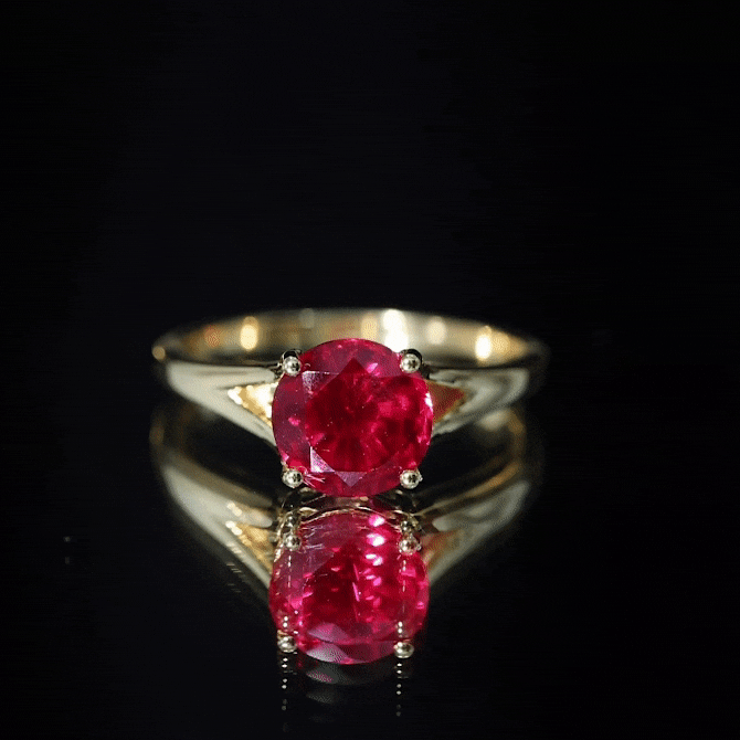 Make a bold, romantic statement with this Round Shape Lab Created Ruby Solitaire Ring. The 4-Prong Setting holds a stunning created ruby, accompanied by a brilliant Diamond. Handcrafted in Solid Gold, this ring is perfect for adding a pop of red to your street style.