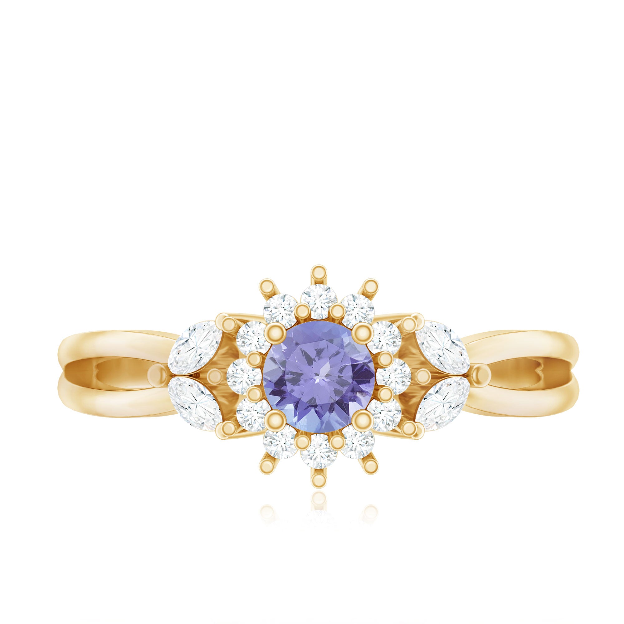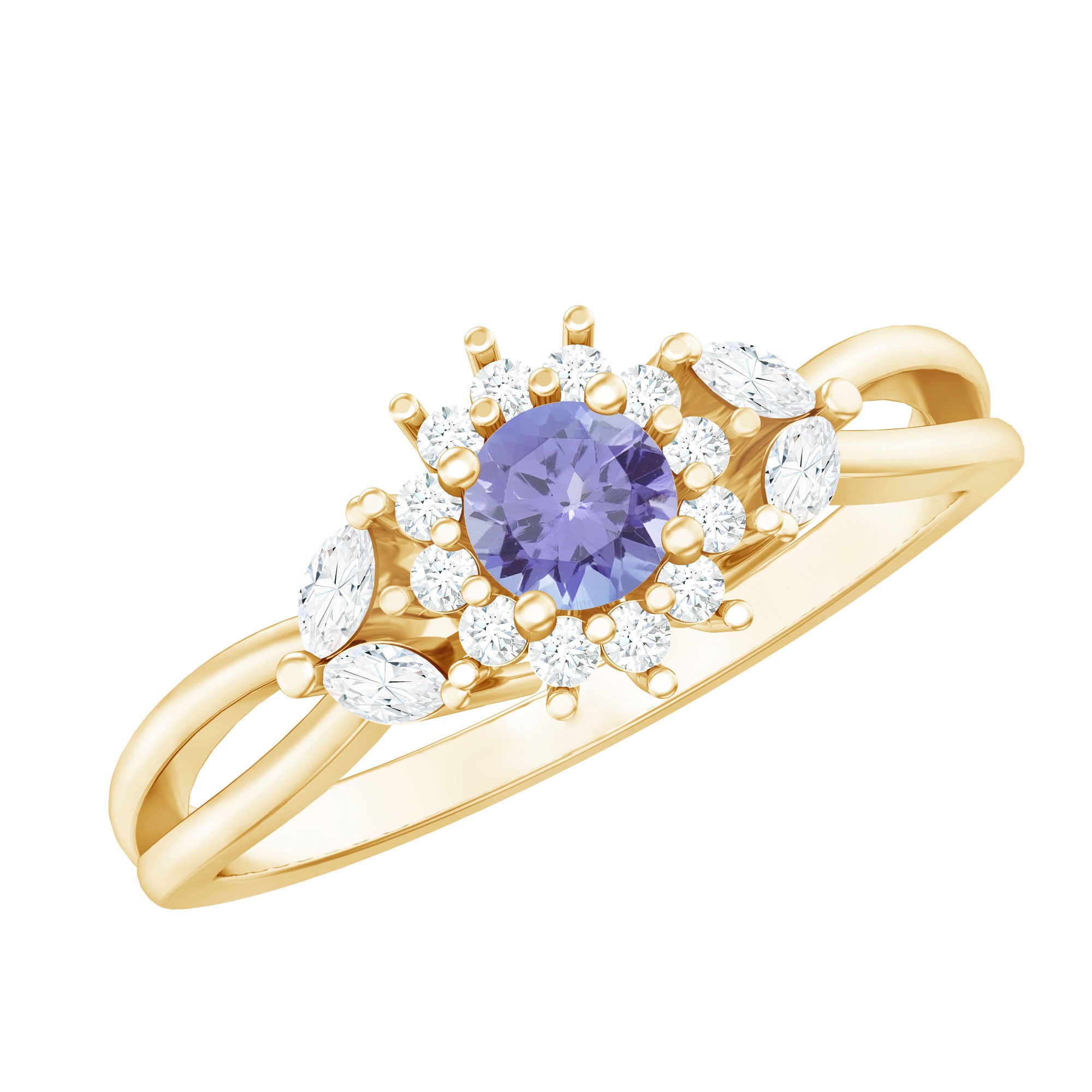 Make a lasting impression with this designer engagement ring. Expertly crafted in gold, this ring features a mesmerizing flower design with a round-cut Tanzanite set in a claw setting, accented by Diamond stones and framed in a split shank. Celebrate your love with this stunning piece of jewelry.