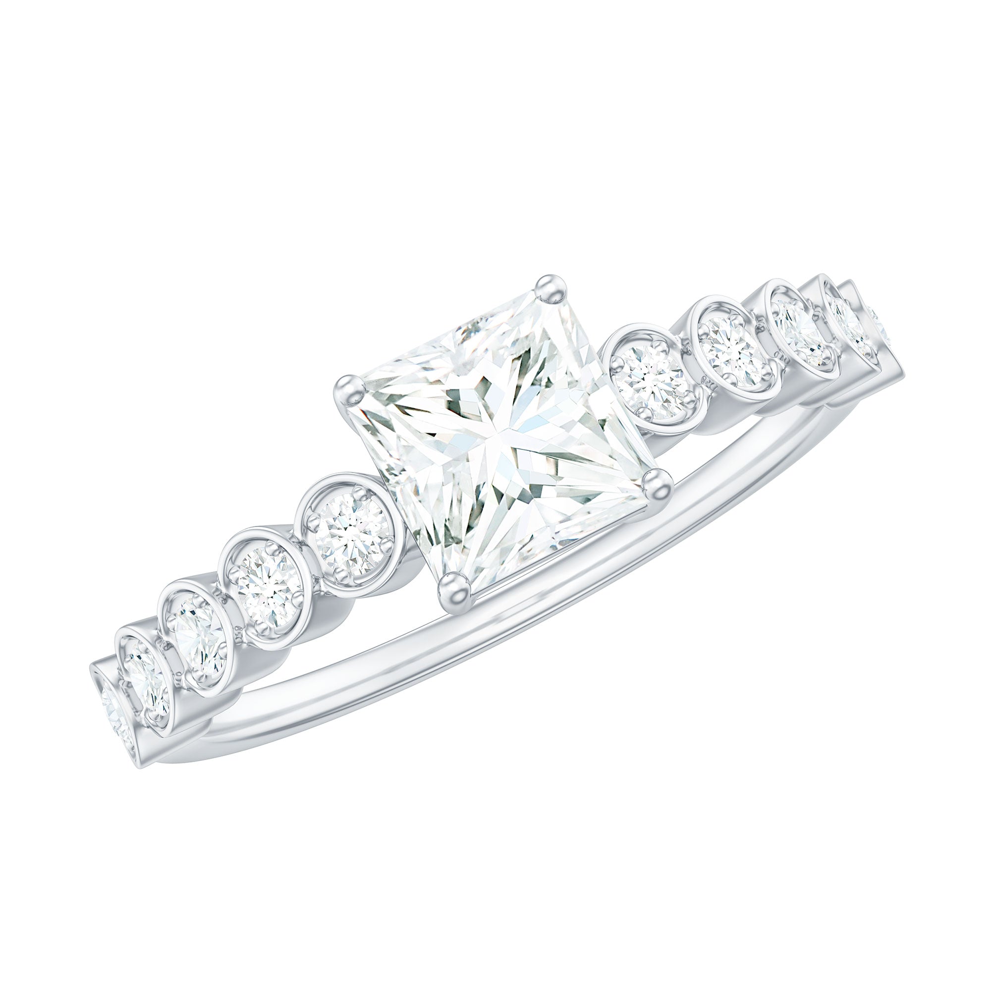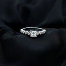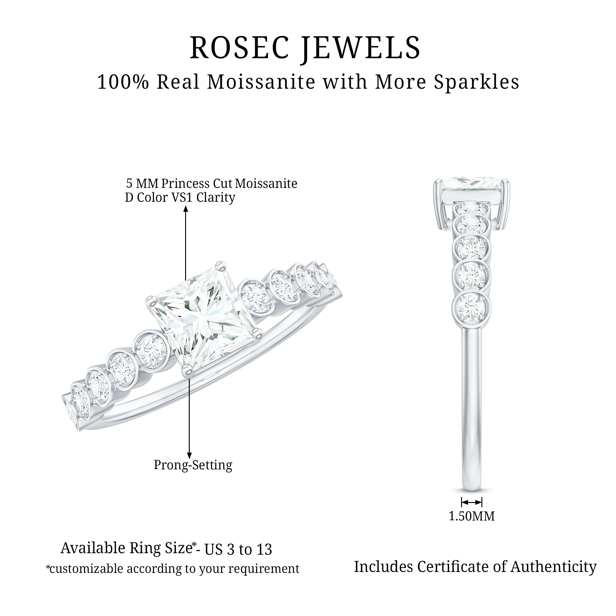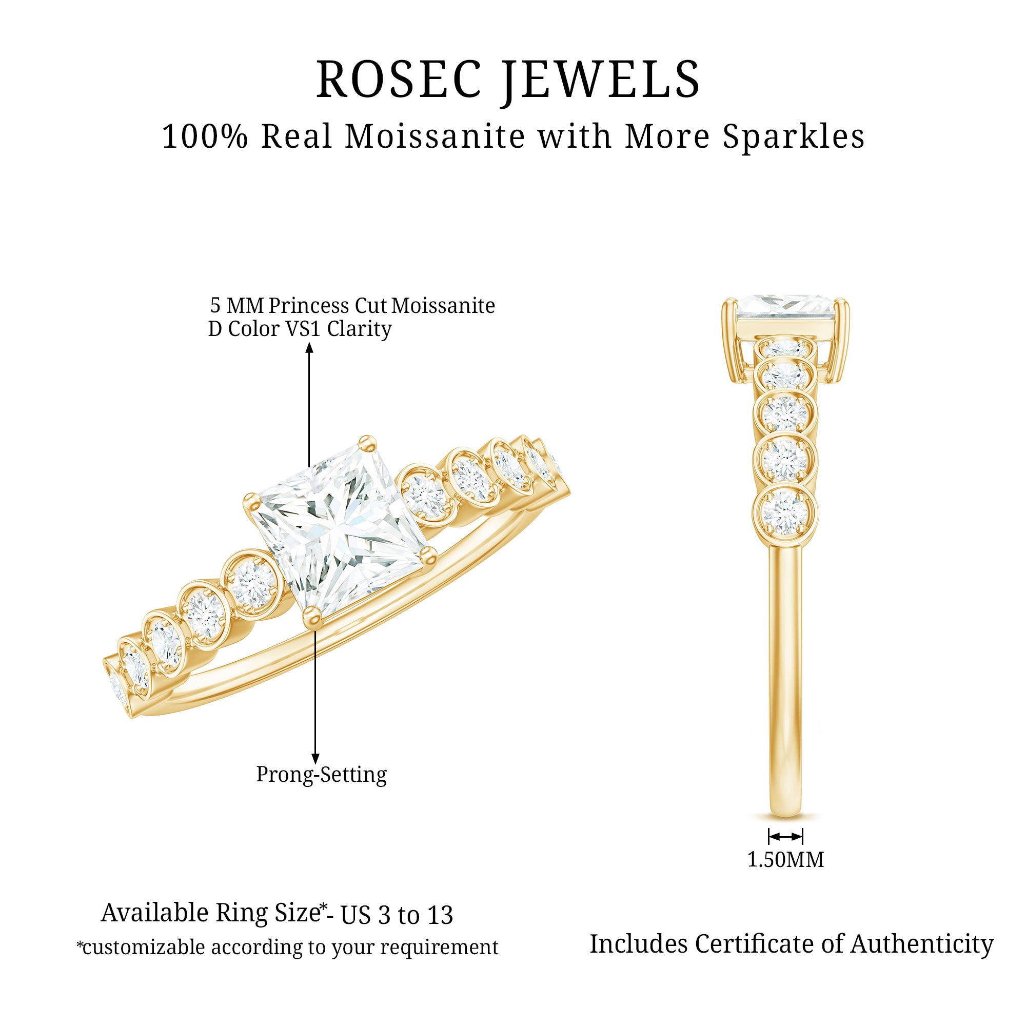 This unique and eye-catching Moissanite Engagement Ring is designed to capture hearts with its brilliant sparkle and meaningful design. At the center, a 5 MM Princess Cut Moissanite sits securely in prong setting. Adding charm to the band, small round moissanite stones are placed inside delicate circular frames along the shank, giving the Square Engagement Ring a playful yet elegant look. These side stones not only boost the ring’s brilliance but also add a unique twist to the overall design. The shimmering D Color VS1 Clarity moissanite offers the same beauty and durability as a diamond, making it a thoughtful and ethical choice. This Princess Cut Engagement Ring tells a story of love, joy, and celebration through its refined craftsmanship and artistic details. The mix of modern sparkle and classic structure makes this Princess Cut Moissanite Ring a perfect symbol of lasting commitment. Carefully crafted with precision, this piece glows from every angle, with every detail working together to highlight the center stone. With its one-of-a-kind design and radiant shine, it reflects the depth of your bond and the beauty of your shared journey. Let this Side Stone Engagement Ring become a lasting reminder of your most meaningful moments together.