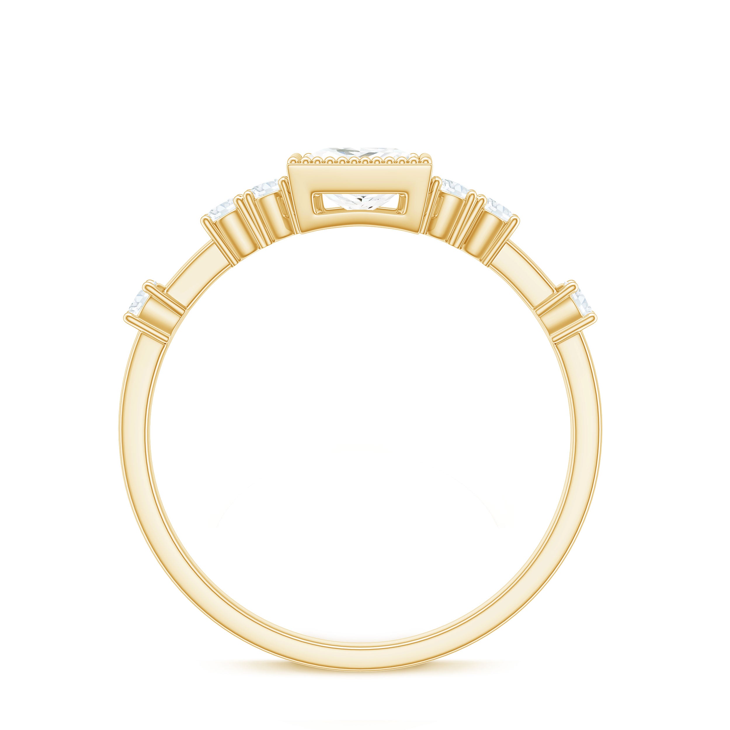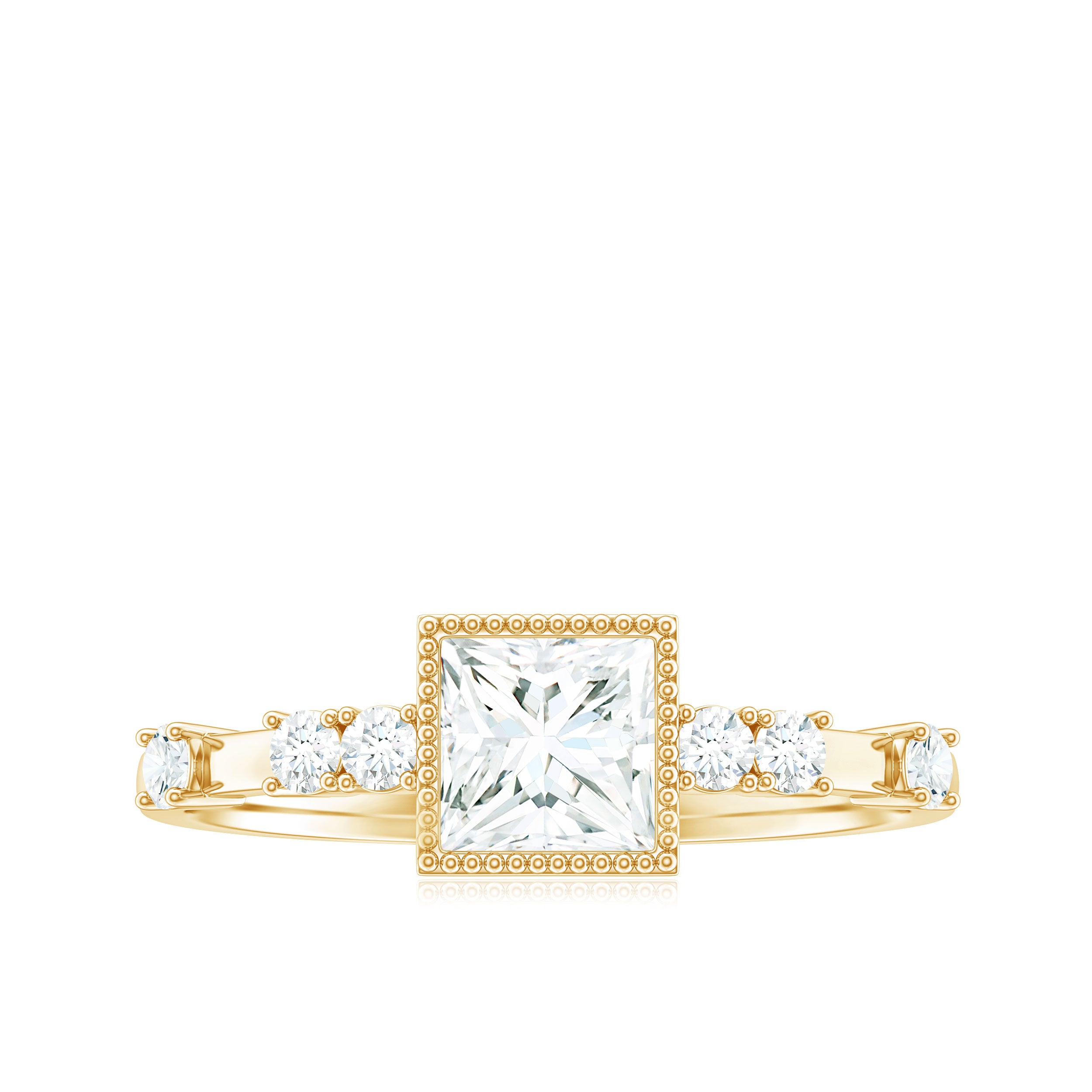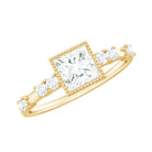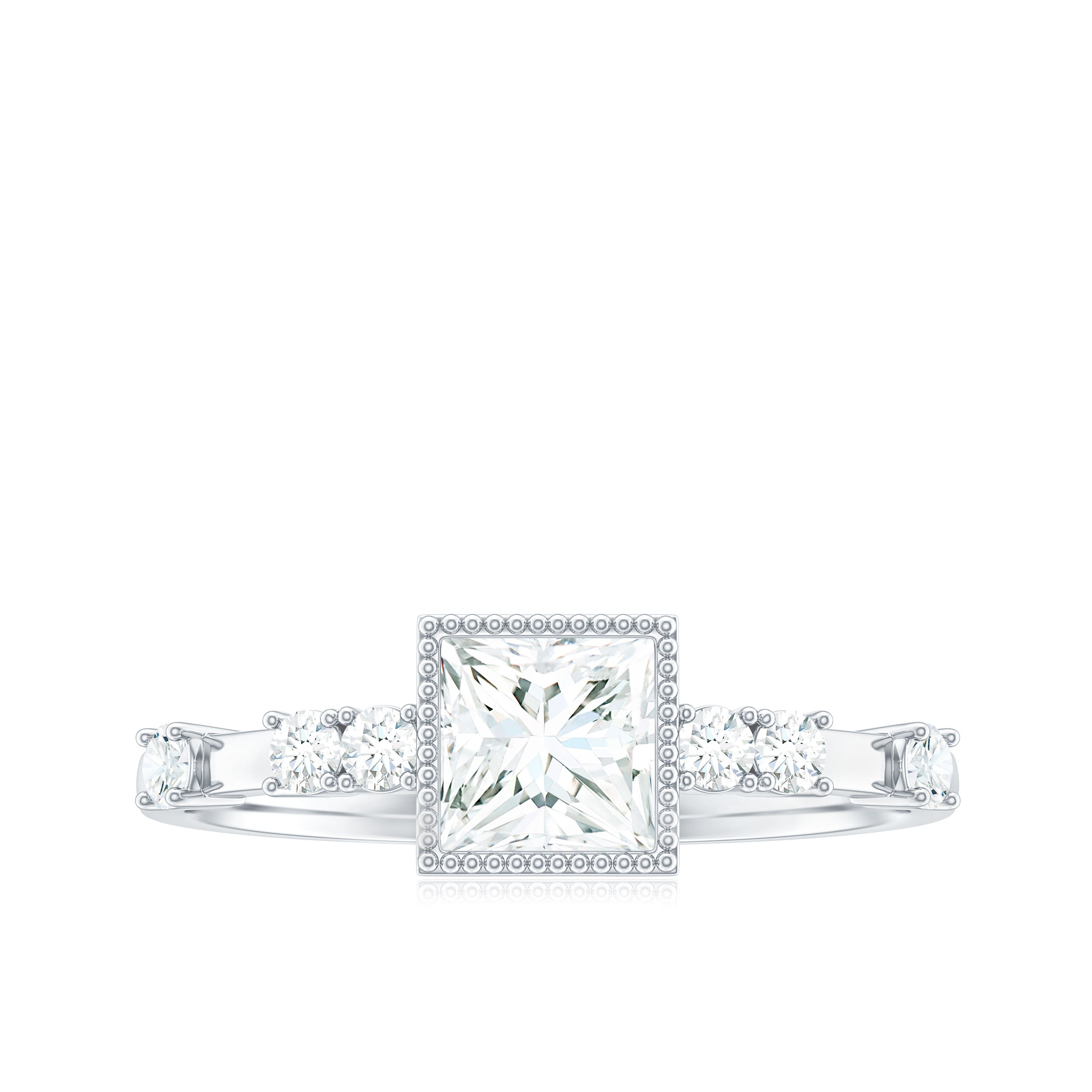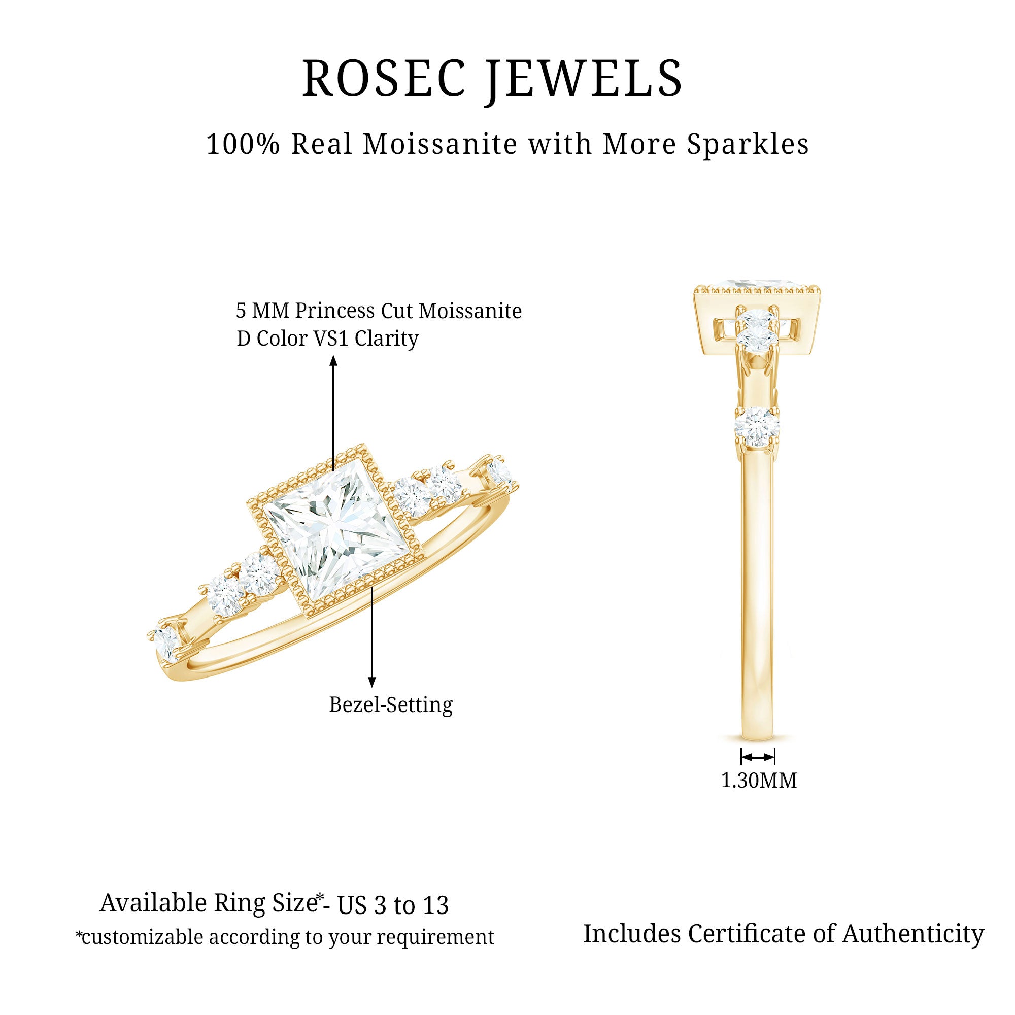 Timeless in charm with a touch of vintage elegance, this Moissanite Engagement Ring is designed to honour love in its most classic form. At the heart of this vintage inspired piece sits a brilliant 5 MM princess cut moissanite in a bezel setting, radiating with exceptional D-VS1 quality fire and clarity. The shank features delicate round shape moissanites, echoing the style of treasured heirlooms passed down through generations. Adding a thoughtful twist, beaded frame is enhancing the sparkle of the center stone, an intimate detail that adds surprise brilliance and sentimental charm, like a whispered promise. Crafted with precision and care, this Princess Cut Moissanite Ring beautifully combines old-world romance with modern brilliance. It is a perfect symbol for those who appreciate timeless design and ethical luxury, as moissanite offers a stunning, eco-conscious alternative to traditional diamonds. Available in US sizes 3 to 13 and thoughtfully presented in a signature jewelry box, this Solitaire Engagement Ring is ready to mark your most meaningful moments.