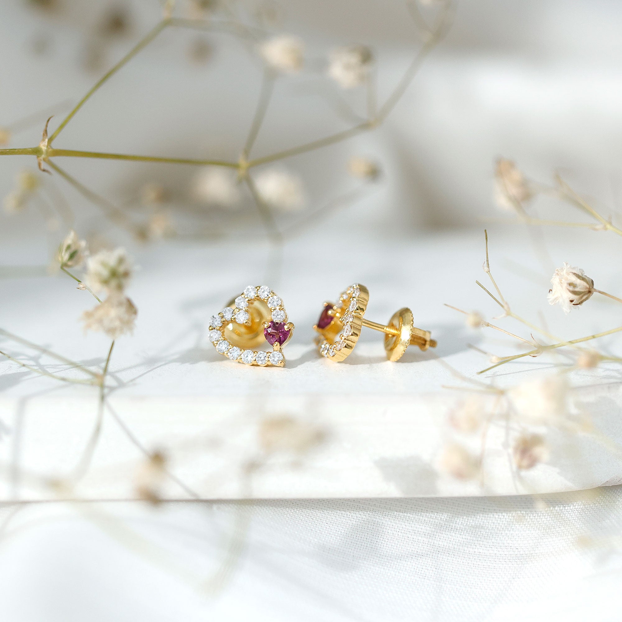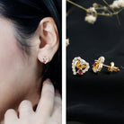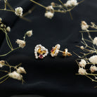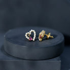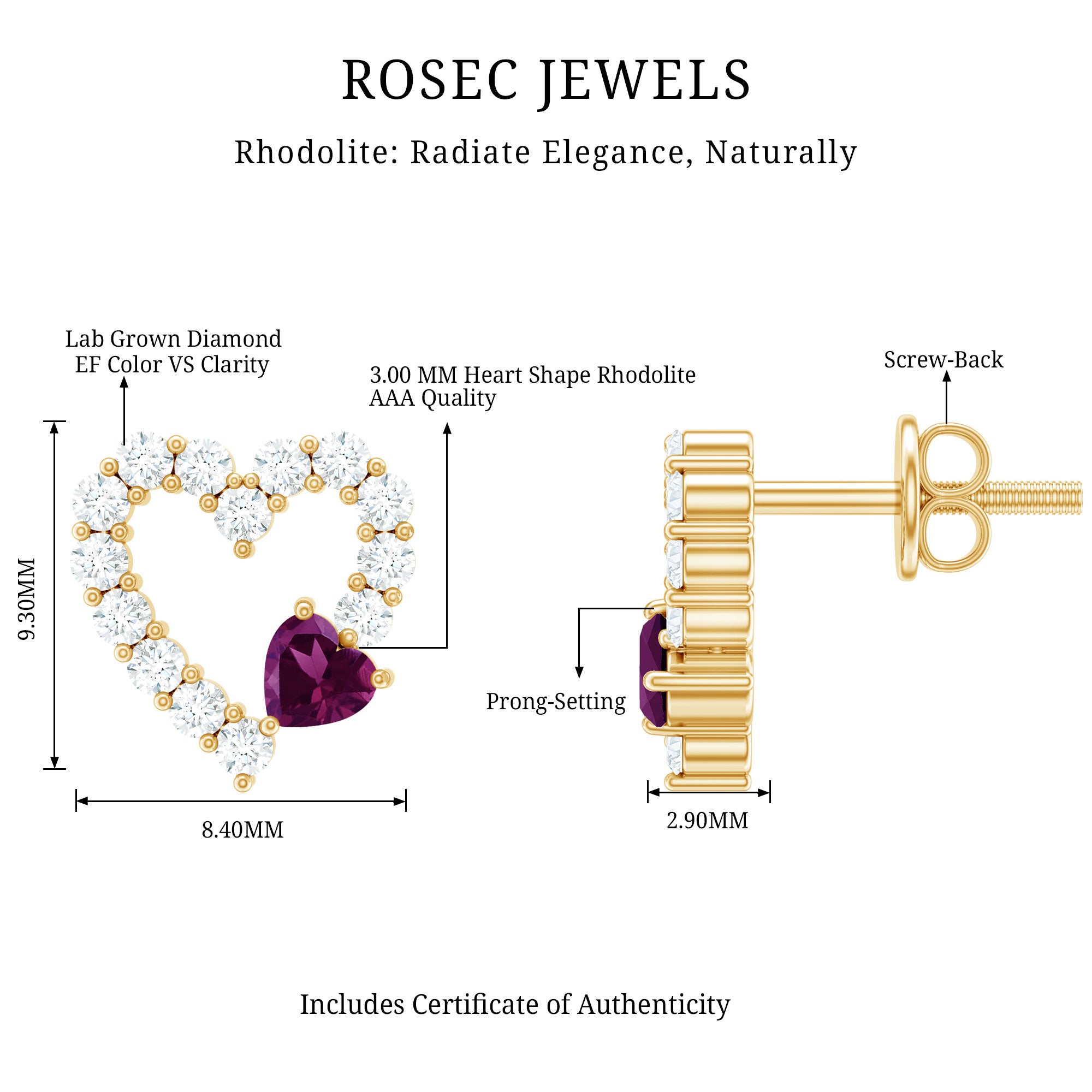 Express your love and style with these Heart Stud Earrings, a perfect blend of romance and modern elegance. The design showcases a beautiful 3 mm Heart Shape Rhodolite gemstone of AAA Quality set in Prong Setting, known for its vibrant red hue that symbolizes passion, love, and emotional healing. The Rhodolite is uniquely set in a slanted position over an Open Heart frame, creating a playful yet sophisticated look. The frame is lined with dazzling EF-VS Quality Lab Grown Diamond stones, adding extra sparkle and brilliance to these charming Rhodolite Earrings. Fashioned in Yellow Gold Plated Sterling Silver, the warm golden tone complements the rich color of the Rhodolite, giving the Heart Studs a luxurious finish. Designed for comfort and security, they feature a Screw Back Closure, ensuring they stay in place all day long. These Heart Silver Earrings are versatile enough to be worn on any special occasion, from romantic dates and weddings to elegant parties or daily wear, making them a perfect gift for someone special or a delightful addition to your jewelry collection. Presented in a signature jewelry box, these Rhodolite Garnet Earrings are ready to gift and treasure. Combining the meaning of love, ethical craftsmanship, and striking design, these Open Heart Earrings make a timeless statement of affection and style.