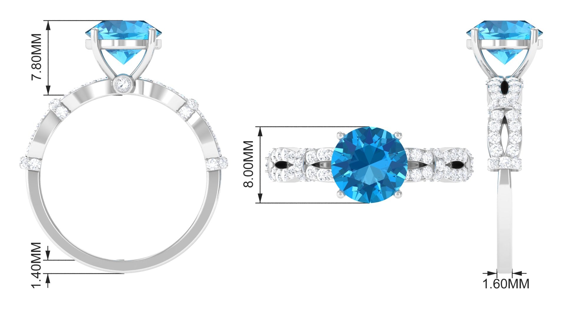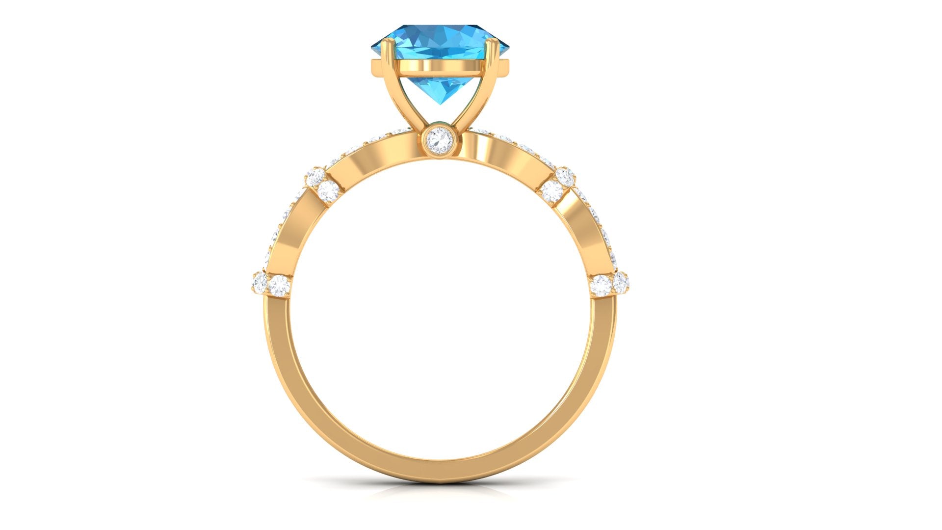 This exquisite Solitaire Engagement Ring showcases an impressive 8 MM Round Shape Swiss Blue Topaz, firmly nestled within a 4-prong setting. To elevate its charm, the Criss Cross Shank is gracefully adorned with Round Diamond stones arranged as accents. The combination of the captivating Swiss Blue Topaz and the intricate design of the shank makes this ring a striking and unique choice for engagement, promising to make a lasting impression and symbolizing the beginning of a beautiful journey together.