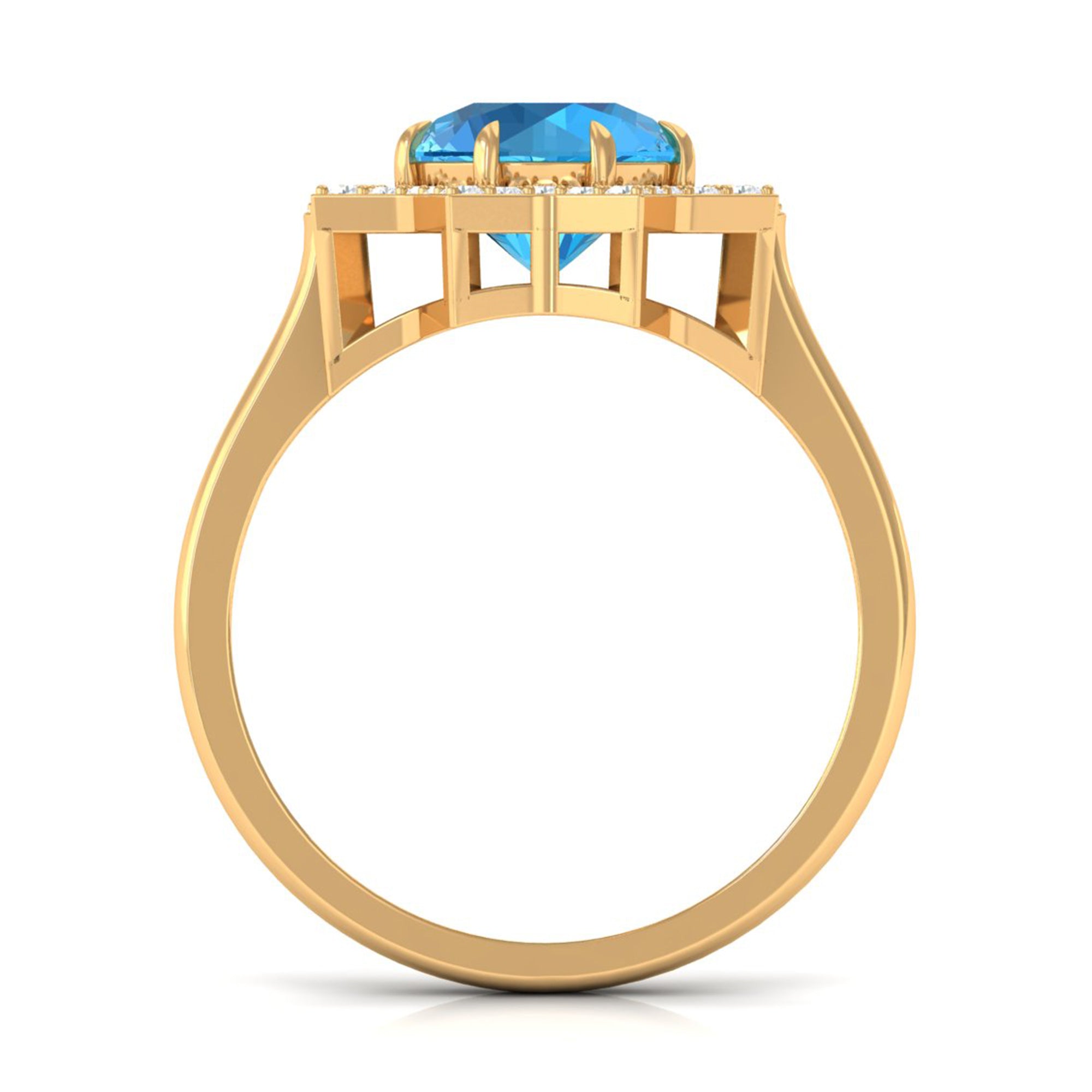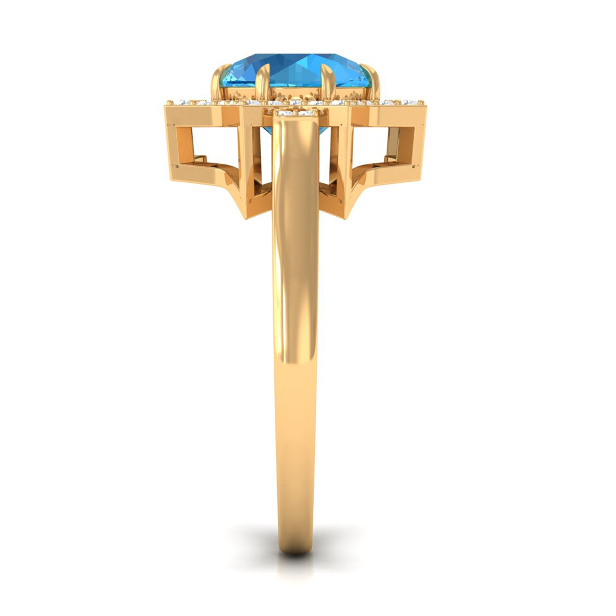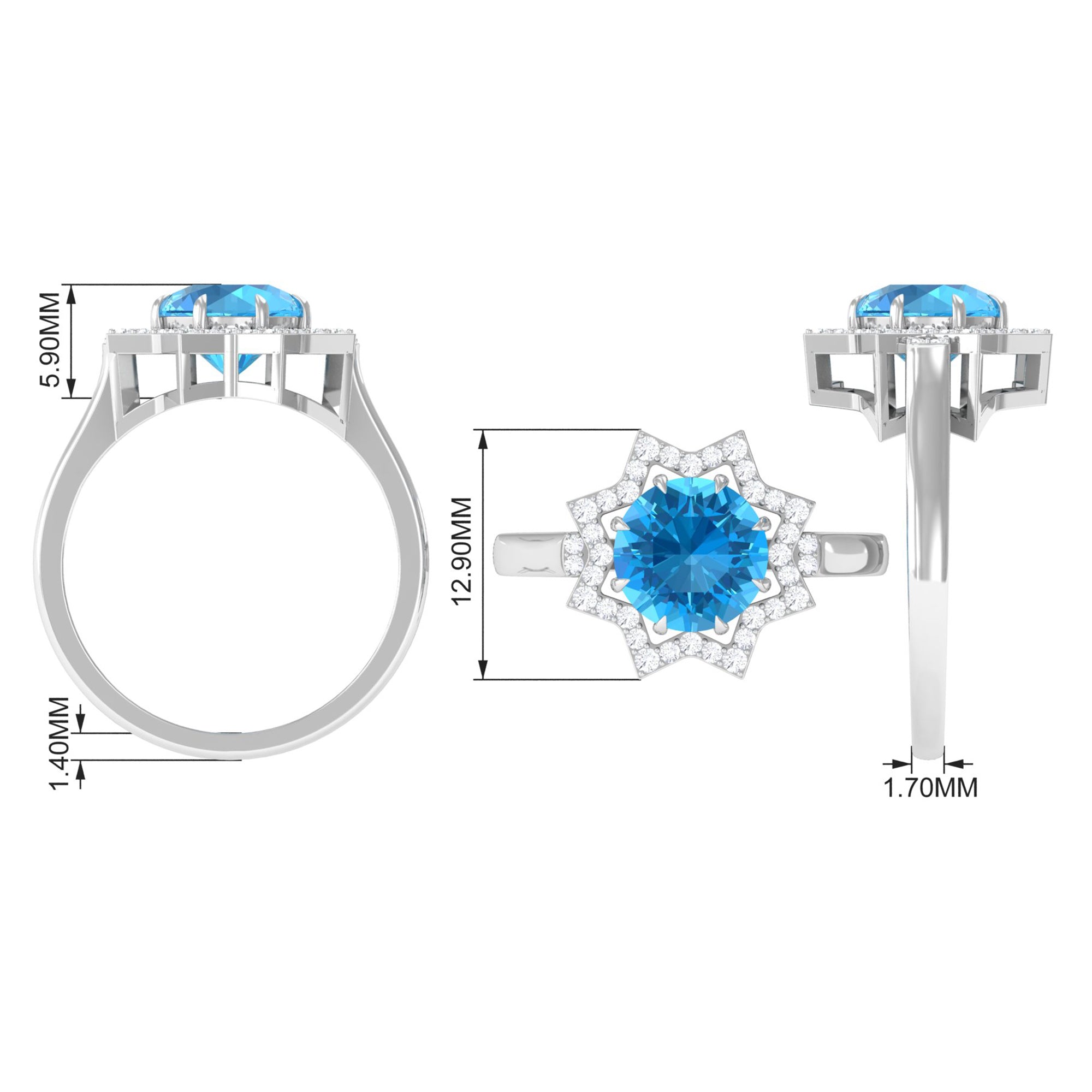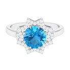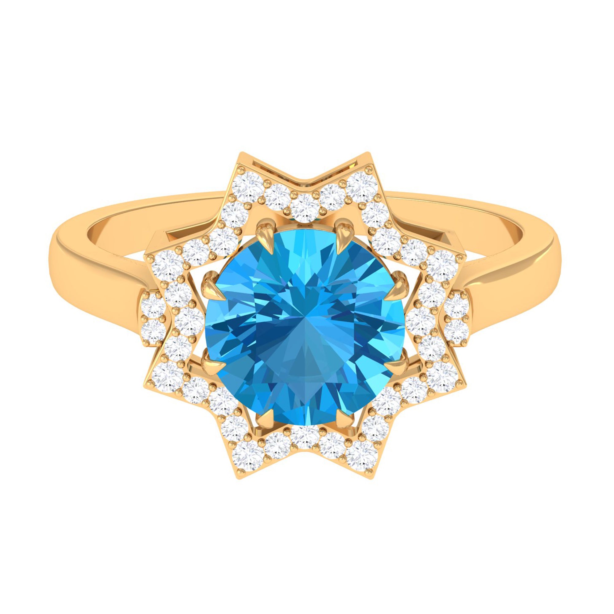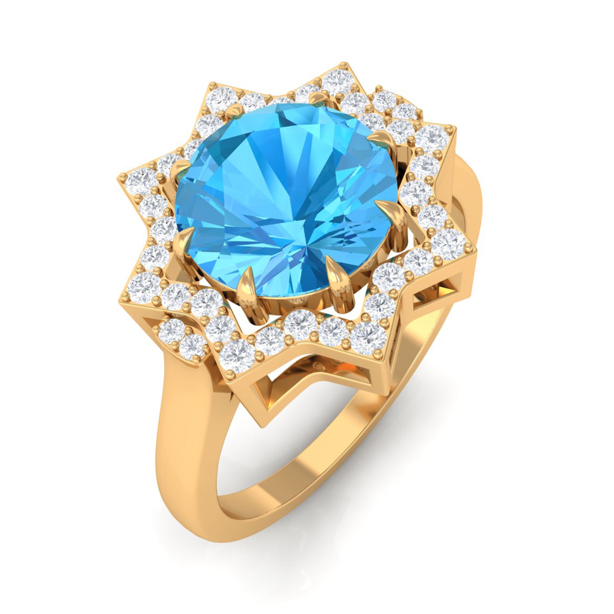 Shine like a star in our Swiss Blue Topaz Engagement Ring featuring Round Shape Swiss Blue Topaz in Claw Setting with Diamond creating a star shape all the center gemstone. This Statement Engagement Ring is adorned in Gold and is the perfect excuse for you to spoil your favorite women. This delicate and timeless Swiss Blue Topaz Jewelry is the perfect symbol of your love.