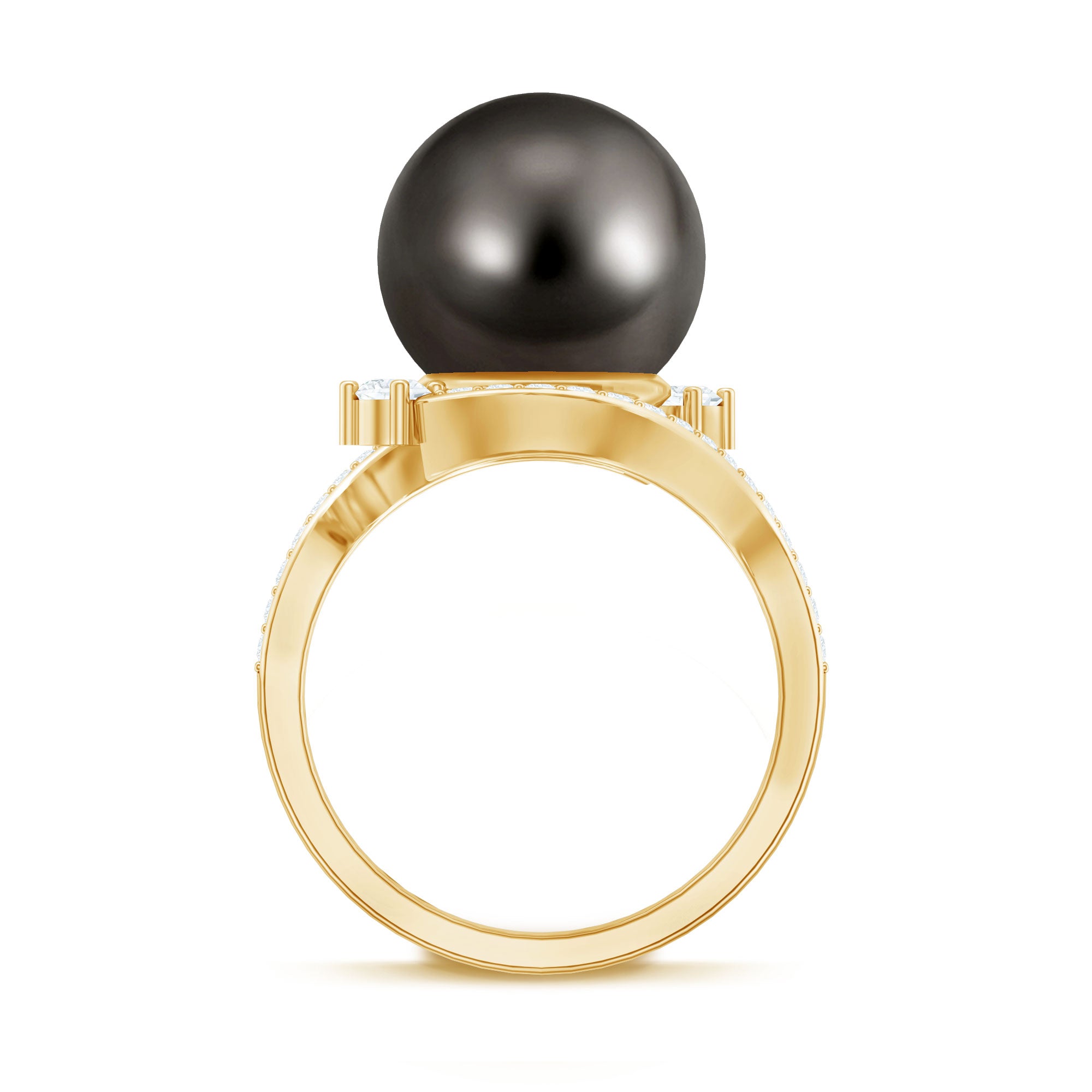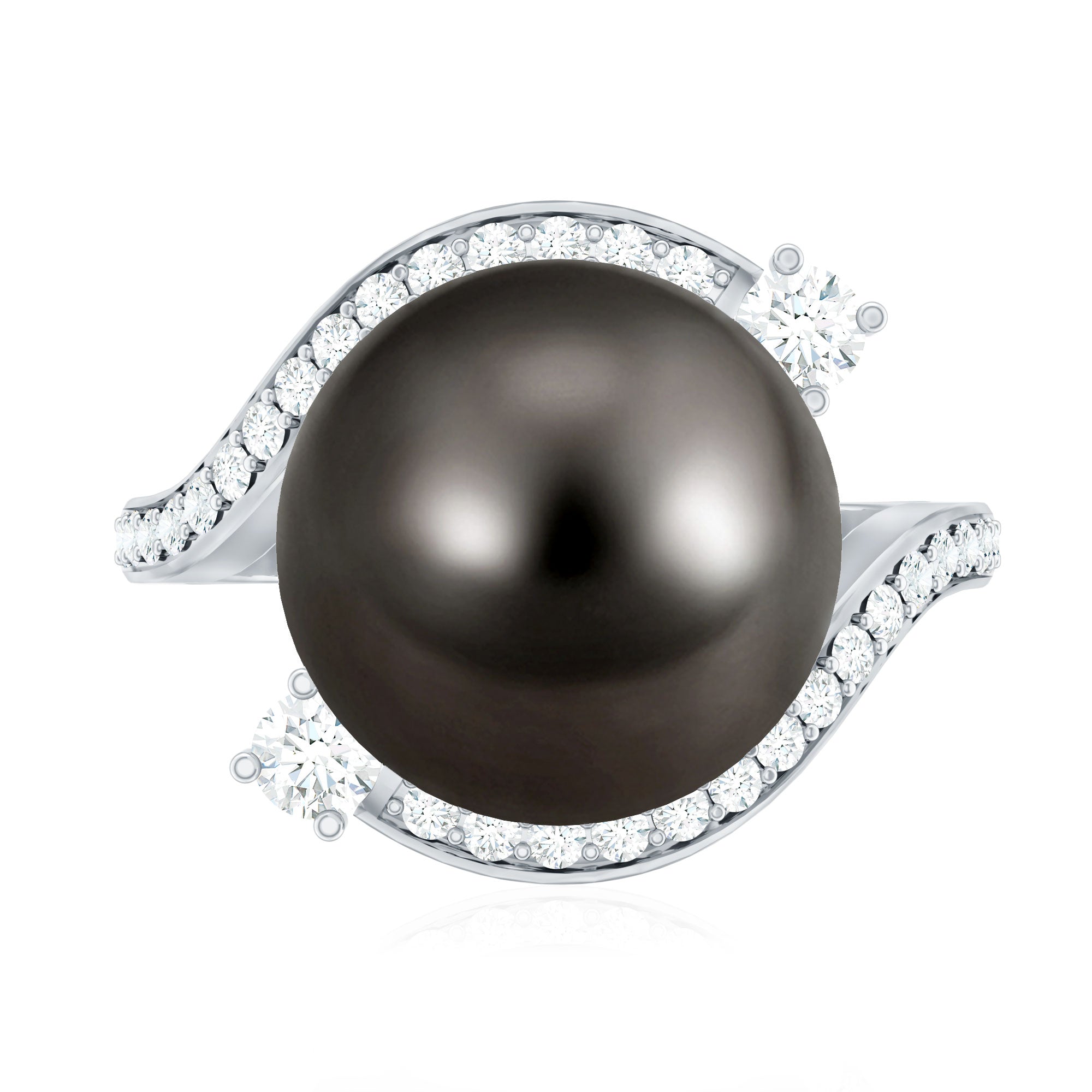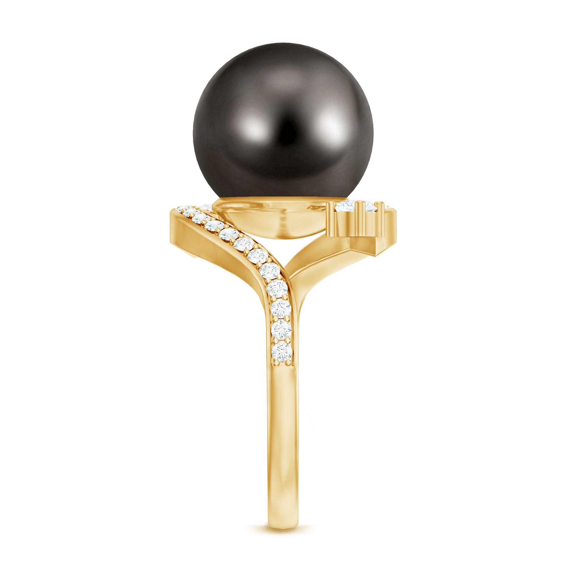 Graceful curves and bold elegance defines this stunning Art Deco Inspired Engagement Ring. The design features a stylish bypass shank that gently wraps around the center stone, creating a unique and eye-catching look. It is the kind of ring that instantly stands out and adds a touch of luxury to any jewelry collection. Curated with a striking 10 MM Tahitian pearl that becomes the main highlight of the design. The black pearl creates a beautiful focal point while the bypass band flows around it in a graceful way. Small sparkling diamonds are set along the bypass band, adding extra shine and enhancing the overall beauty of the Tahitian Pearl Engagement Ring. The combination of the pearl, diamonds, and artistic design gives this piece a strong Art Deco vibe that feels both classic and glamorous. Its bold presence makes it perfect as a cocktail ring or a statement piece for special occasions and evening events. This Black Pearl and Diamond Ring is a lovely choice when you want to gift something unique and luxurious to your lady love. With its elegant style and eye-catching design, it is a piece that easily attracts attention and makes any outfit feel more special and memorable.