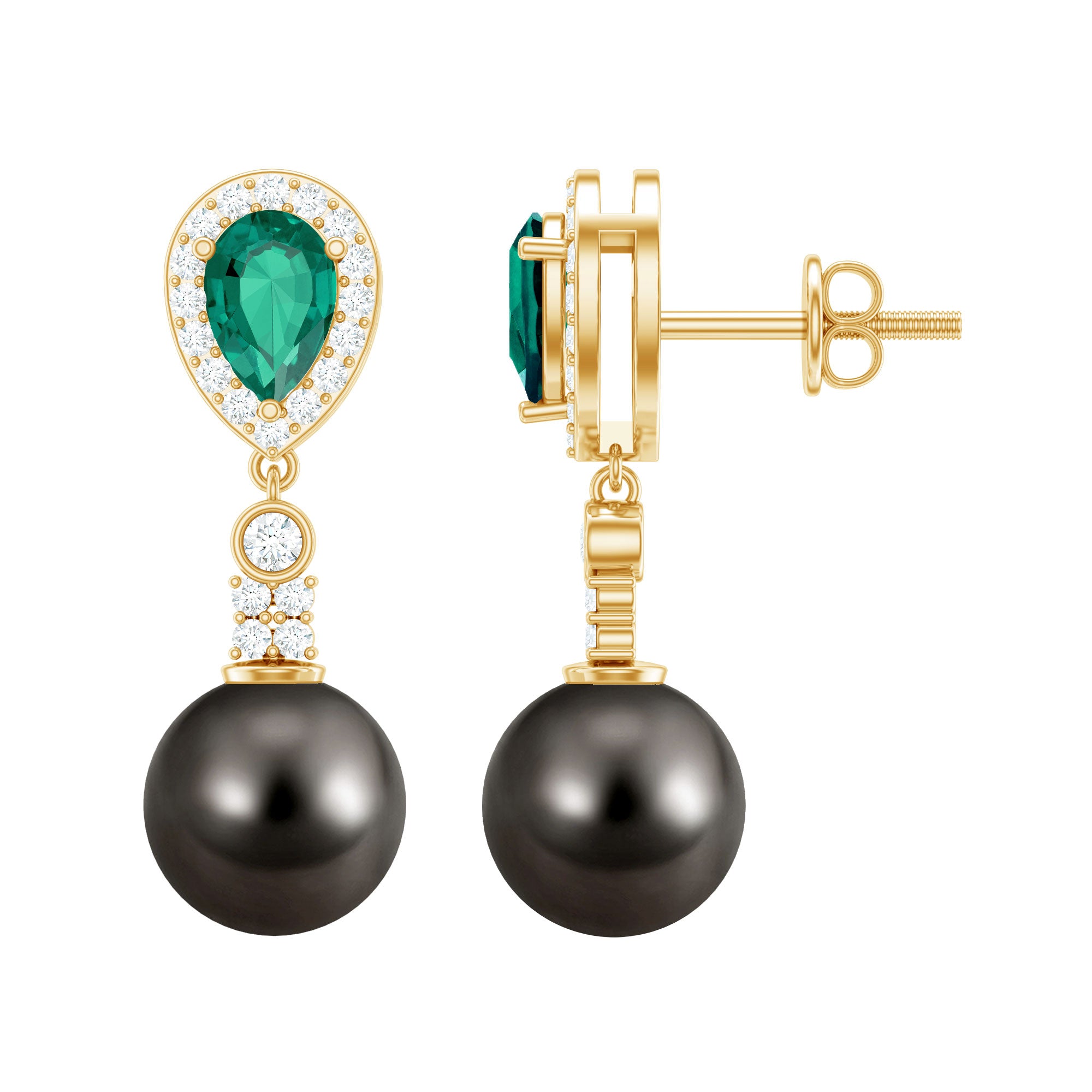 Tahitian Pearl and Created Emerald Drop Earrings with Moissanite