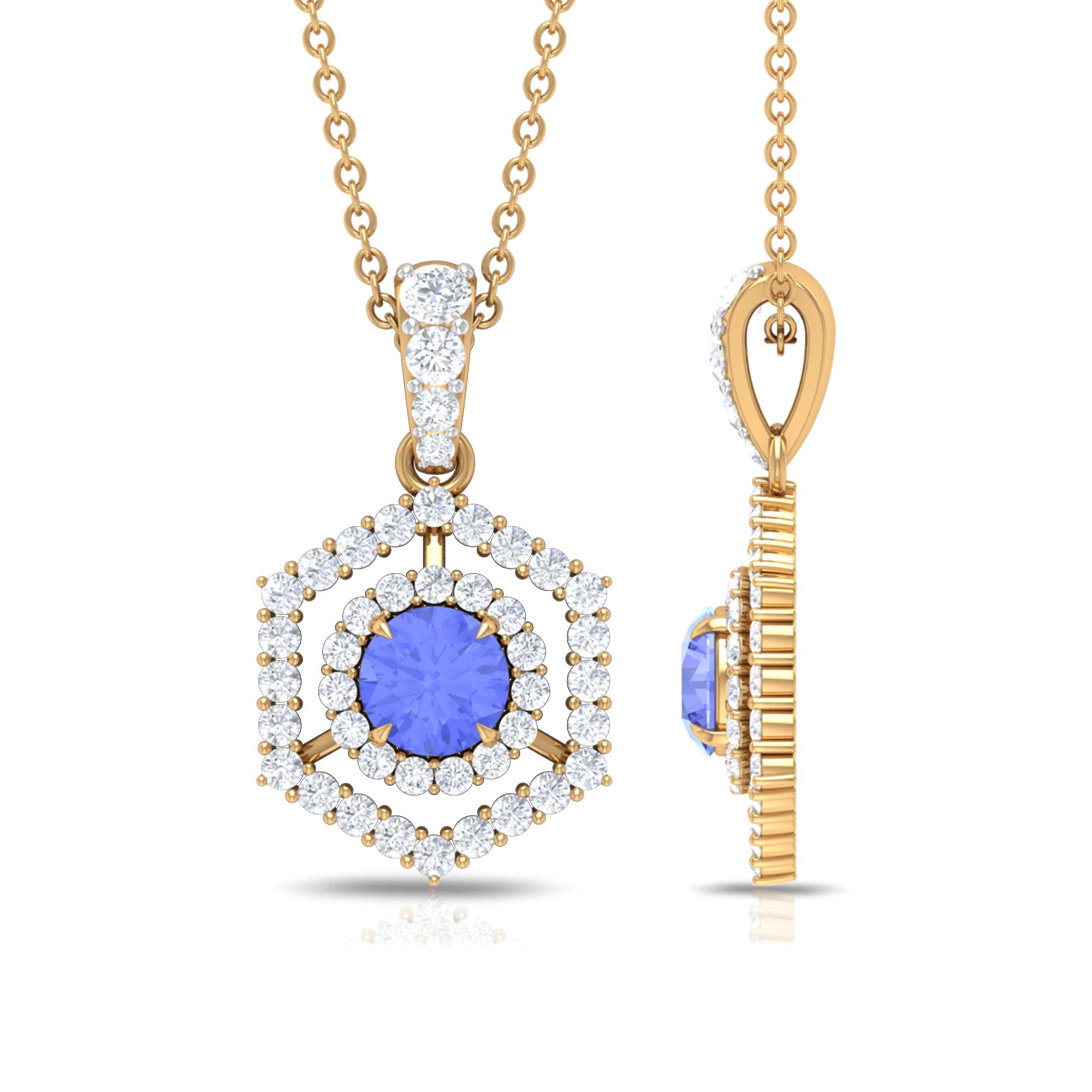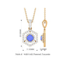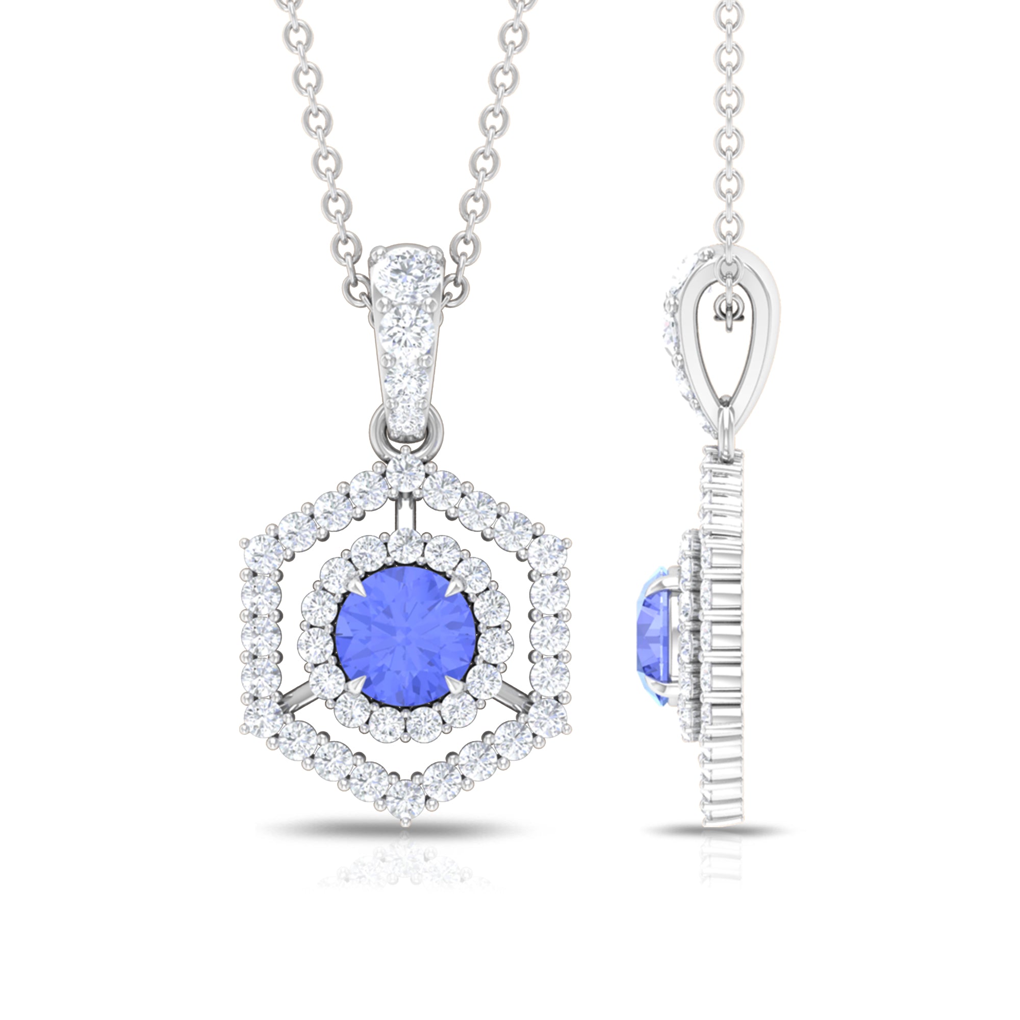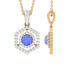Indulge in the beauty of this Hexagon Shape Pendant, expertly crafted with Tanzanite and Diamond. The pendant necklace is adorned with a stunning Tanzanite, complemented with diamond accents, and a decorative accent bail. This elegant and sophisticated piece of jewelry is perfect for women who appreciate the beauty of natural gemstones and a touch of sparkle. The unique hexagon shape and intricate detailing of the pendant make it a striking addition to any outfit, making it the perfect accessory for any occasion.