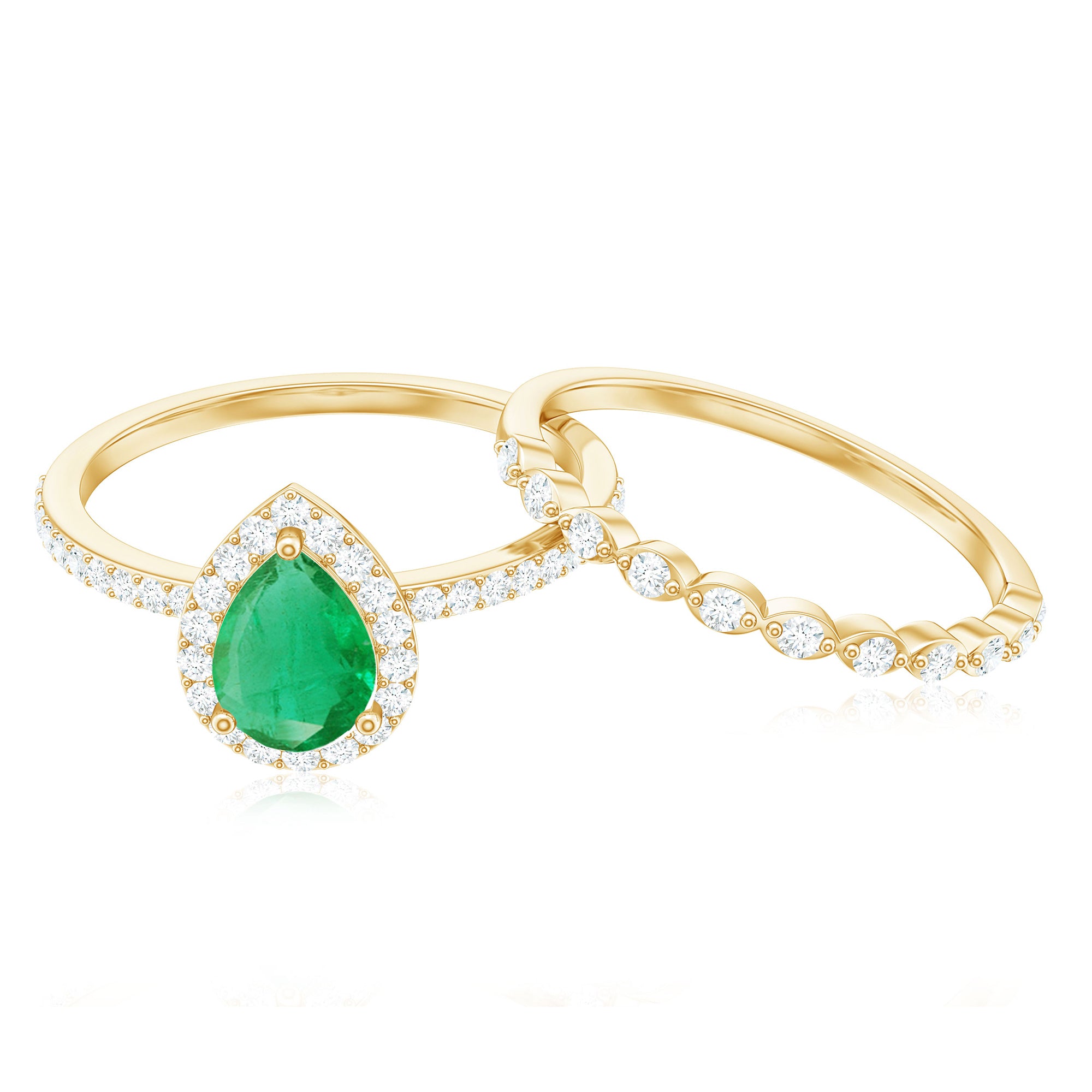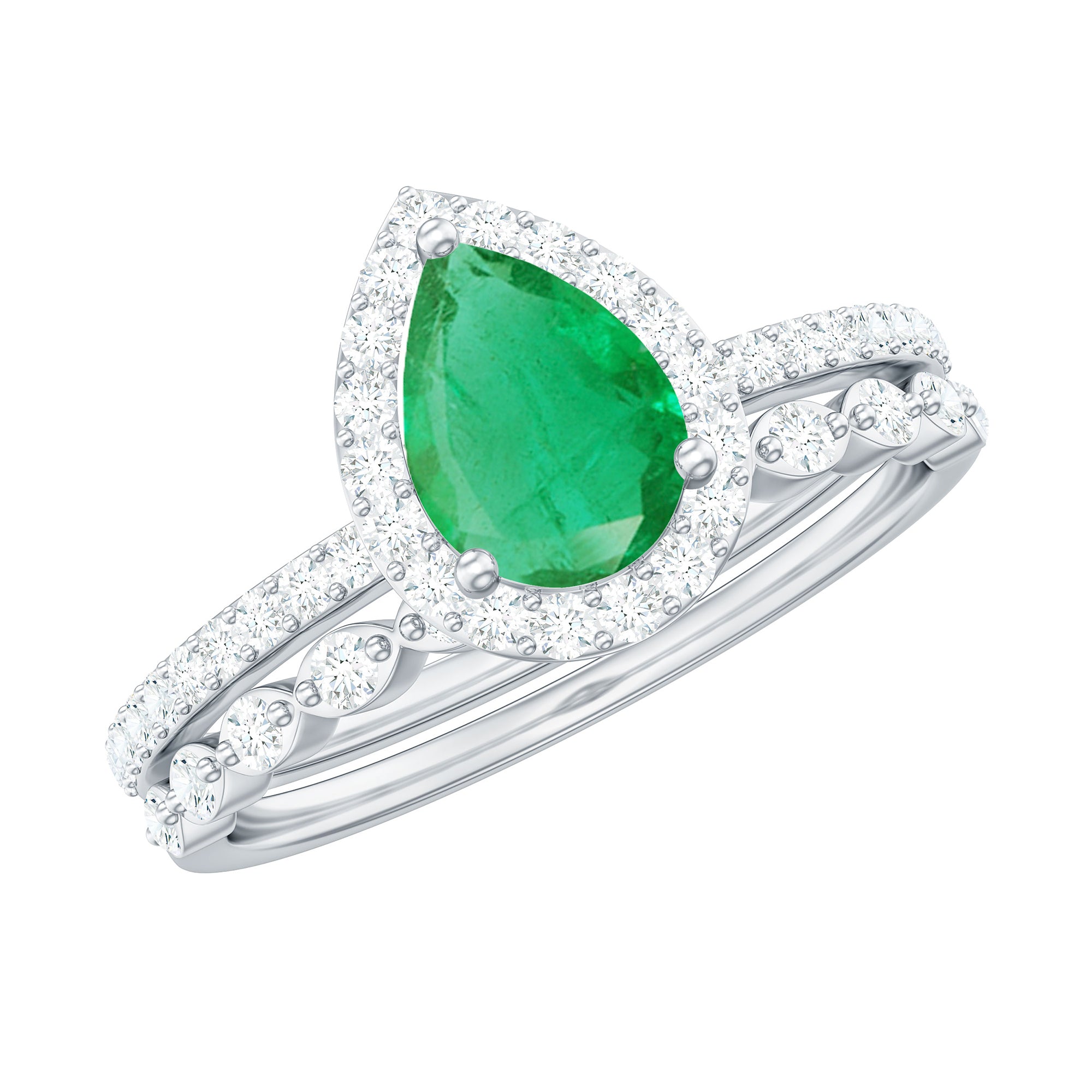 Natural Emerald Diamond Teardrop Engagement Ring and Wedding Band Set