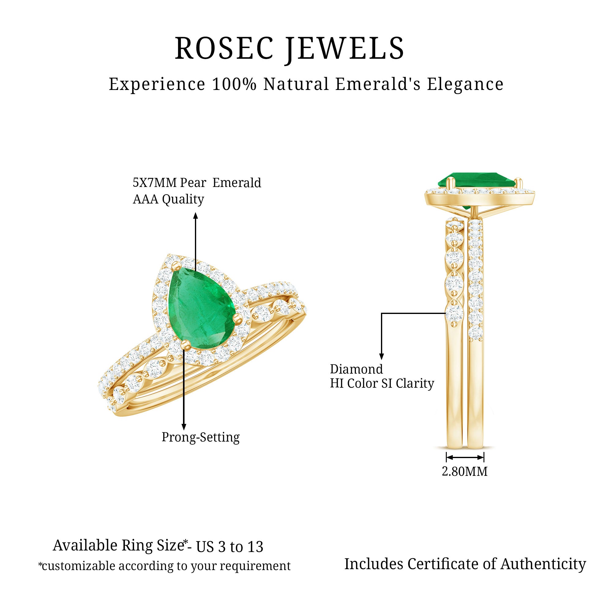 Step into a world of elegance and romance with this Wedding Bridal Ring Set, a dazzling expression of love meant to last a lifetime. This 2 Piece Ring Set includes a Teardrop Engagement Ring that features a 5X7 mm Pear Shape Emerald set in Prong Setting, capturing the eye with its vibrant green hue. Encircled by a Halo of sparkling Diamond stones and flanked by delicate side stones, the engagement ring glimmers like a drop of pure emotion. Paired with a perfectly complementary Diamond Wedding Band, this Emerald Wedding Ring Set creates a graceful union that mirrors the connection between two hearts. Designed to celebrate the milestones of your journey together, from proposals to weddings, this Pear Shaped Engagement Ring with Wedding Band is as meaningful as it is breathtaking. Available in a variety of sizes and presented in a signature jewelry box, this Wedding Engagement Ring Set transforms every occasion into a cherished memory. Perfect for gifting or for sealing your eternal bond, it is a romantic treasure destined to be admired forever.