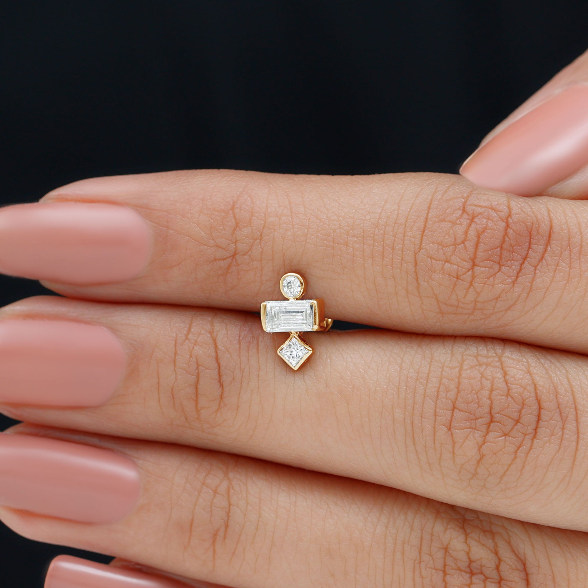- This Three Diamond Earring is a perfect choice to wear on your Helix, Cartilage, Tragus, Upper Lobe, or Conch Piercing.