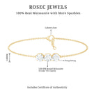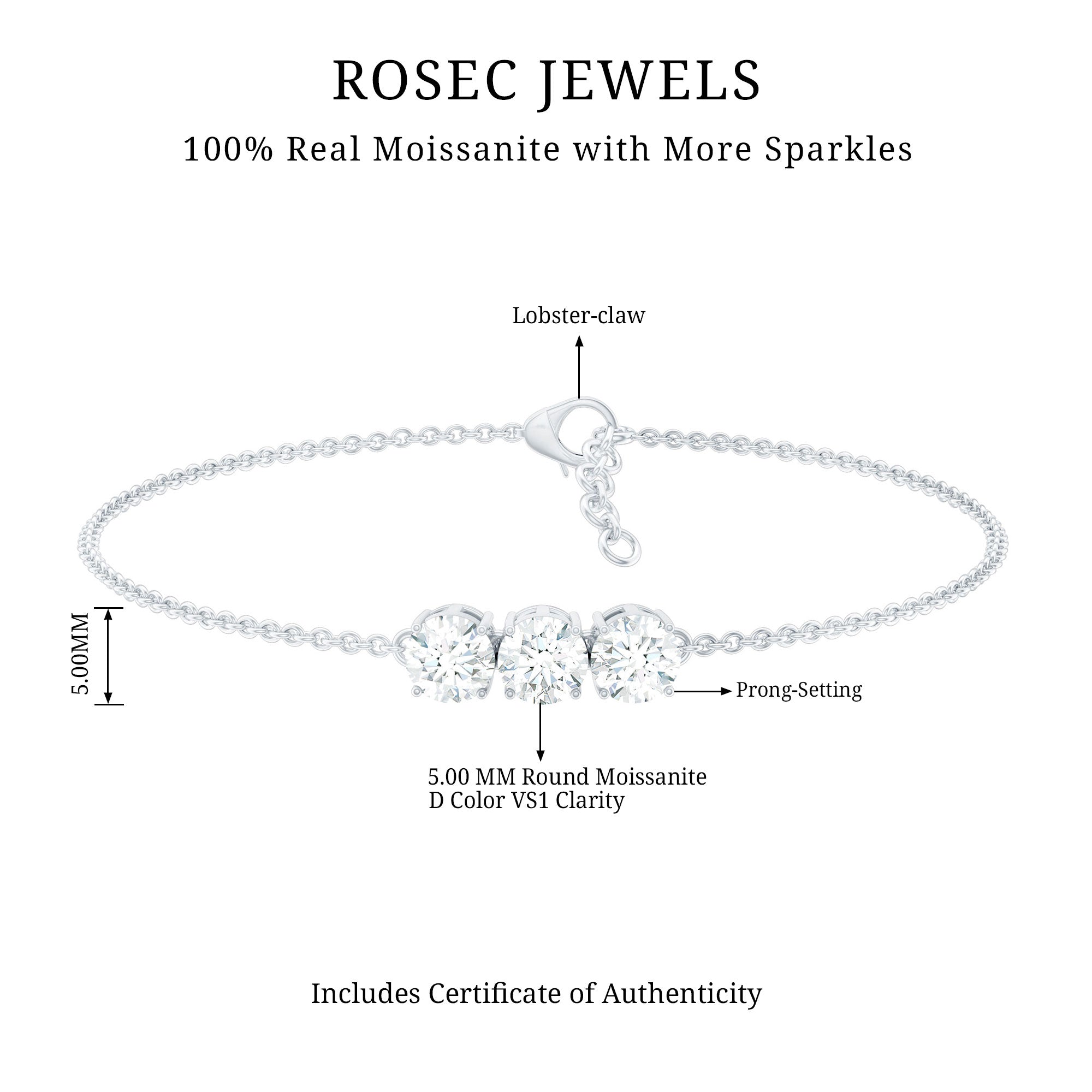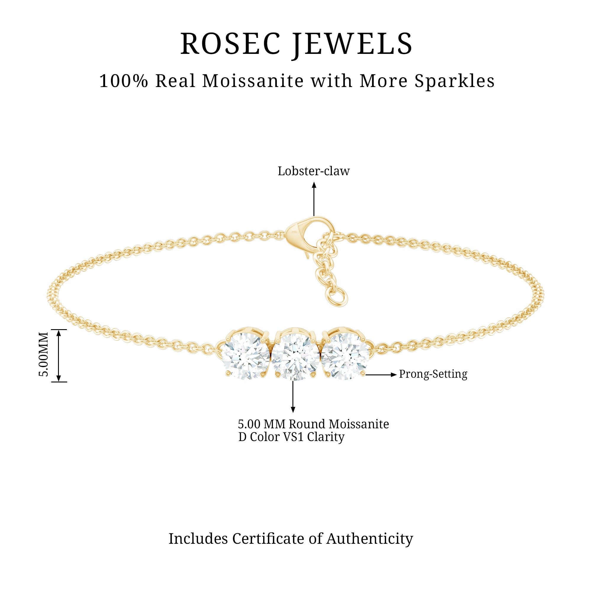 This Three Stone Bracelet serves as a striking representation of the past, present, and future, featuring 5mm Round shape Moissanites, set within a link chain that enhances the bracelet allure. Experience timeless sophistication with this exquisite Past Present Future Bracelet, meticulously crafted and chosen for its exceptional brilliance and clarity. It is an ideal choice for a proposal, engagement, or anniversary gift for your beloved, presented in a ready-to-gift jewelry box accompanied by a certificate. Wear it solo for a chic or minimalist aesthetic, or combine it with another bracelet for a fashionable, layered look. The Moissanite Bracelet is guaranteed to elevate your style with each wear, enabling you to discover the perfect blend of sparkle, elegance, and versatility. This bracelet features D Color VS1 Clarity Moissanites, providing unparalleled brilliance and clarity for a timeless, luxurious accessory.