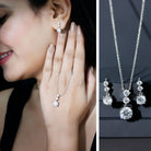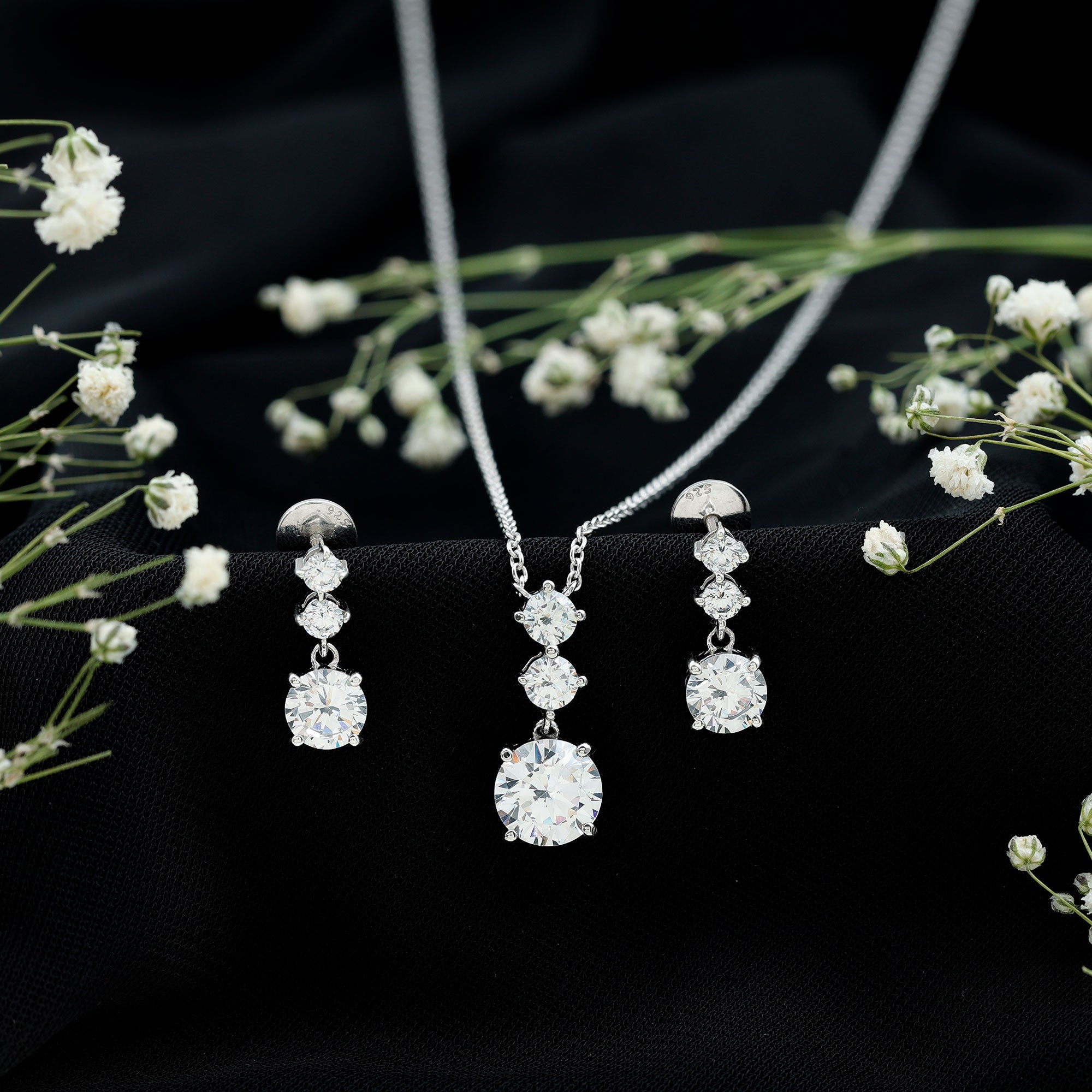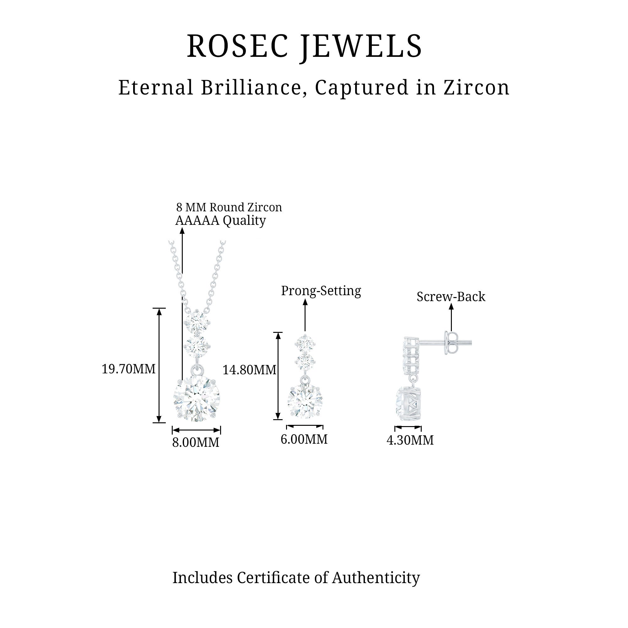 Looking for a perfect jewelry set to complete the overall look, we have your back with this Zircon Bridal Jewelry Set featuring a pendant and a pair of earrings. The pendant features an 8 MM Round Shape Cubic Zirconia as a center stone and is topped with 2 smaller round shape Zircon secured in Prong Setting. The earring features 6 MM Round Shape Zircon as a center stone and is adorned with 2 smaller stones at the top secured in Prong Setting. The pendant dangles with the cable chain that makes it perfectly sit on the neckline. The Earrings with Screw on Backs will stay on place throughout the day. This Necklace and Earring Set beholds the classic shine of AAAAA Quality Zircon. The 3 Stone Jewelry Set is precisely crafted with 14K White Gold Plated Silver and will be delivered to you in a velvet pouch.
