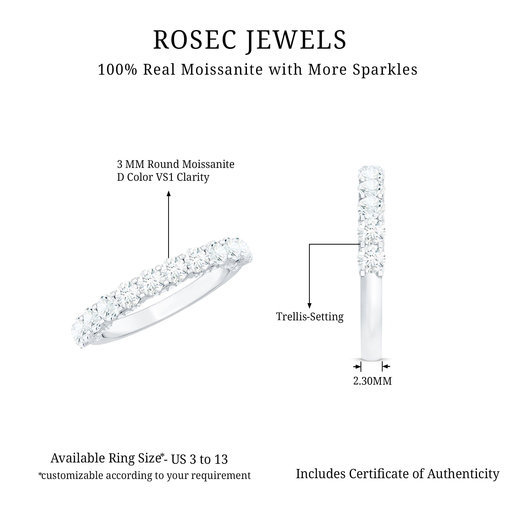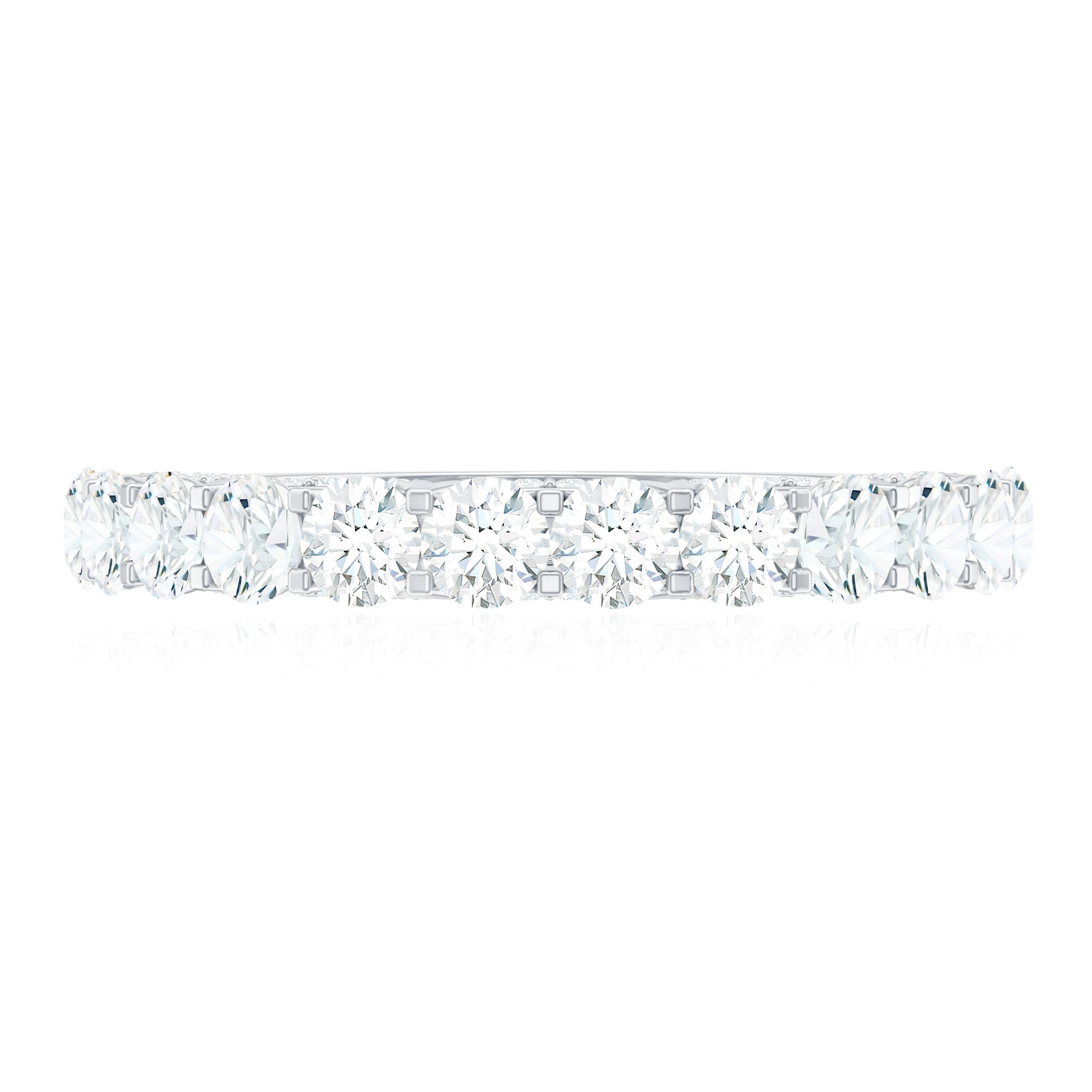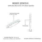 Gracefully encircling half of this exquisite eternity ring, the resplendent Moissanite Stones radiate an air of refinement and grace. To enhance this elegance, the coastal crescent patterns, delicately adorned with petite moissanite gems, introduce an exclusive and enchanting touch to the ring periphery, heightening its overall luminosity and allure.
