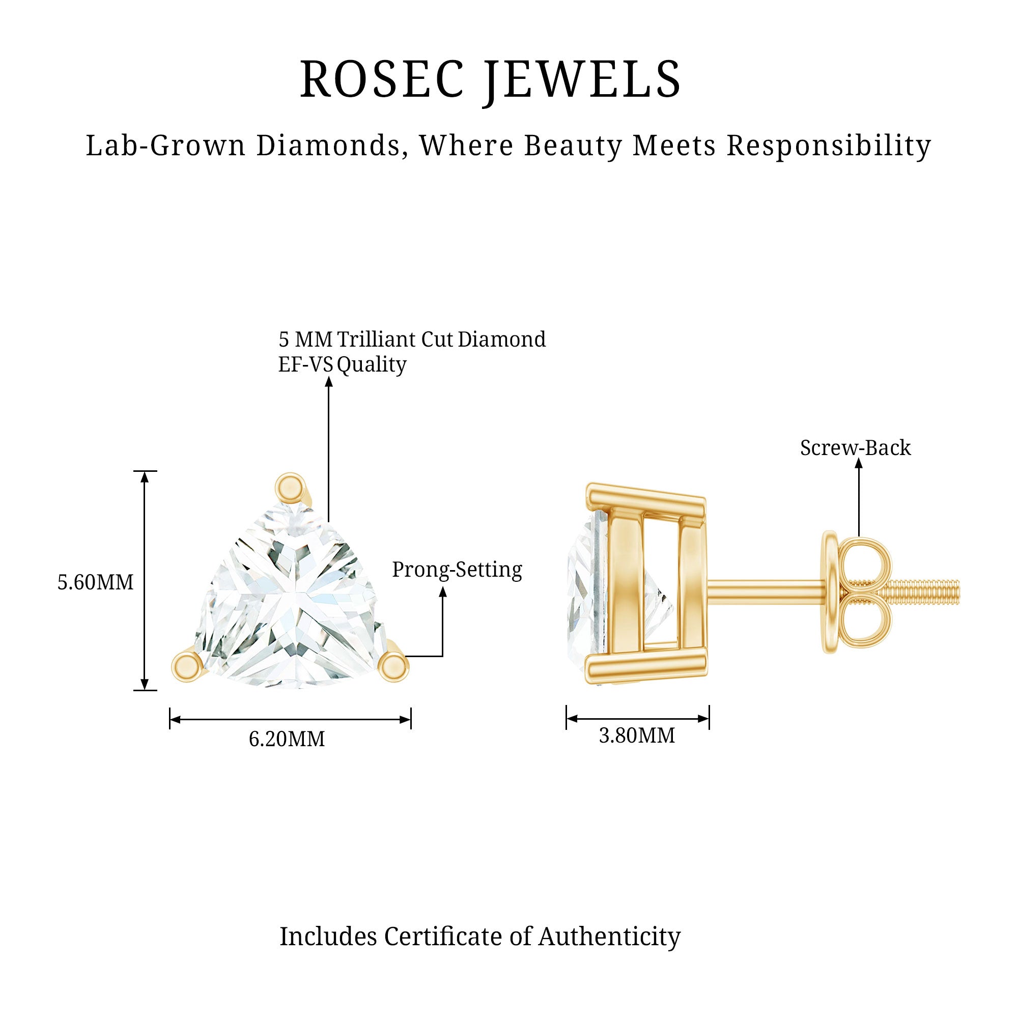 These Lab Grown Diamond Stud Earrings exude effortless elegance, providing just the right touch of sparkle. As a timeless addition, these Everyday Earrings showcase the unique diamond cut that seamlessly fits into your daily essential accessories. This sparkling pair of earrings highlights the fire and brilliance of EF color VS clarity lab-grown diamonds with a classic touch. The timeless charm of these Triangle Stud Earrings features a 5 MM trilliant cut lab made diamond set in prong setting. Renowned for their dazzling shine, these Diamond Solitaire Earrings come with a screw back closure that ensures they stay secure throughout the day, making them an outstanding choice for fashion lovers. They offer a sophisticated and elegant appearance, adding a hint of glamor to your ensemble.