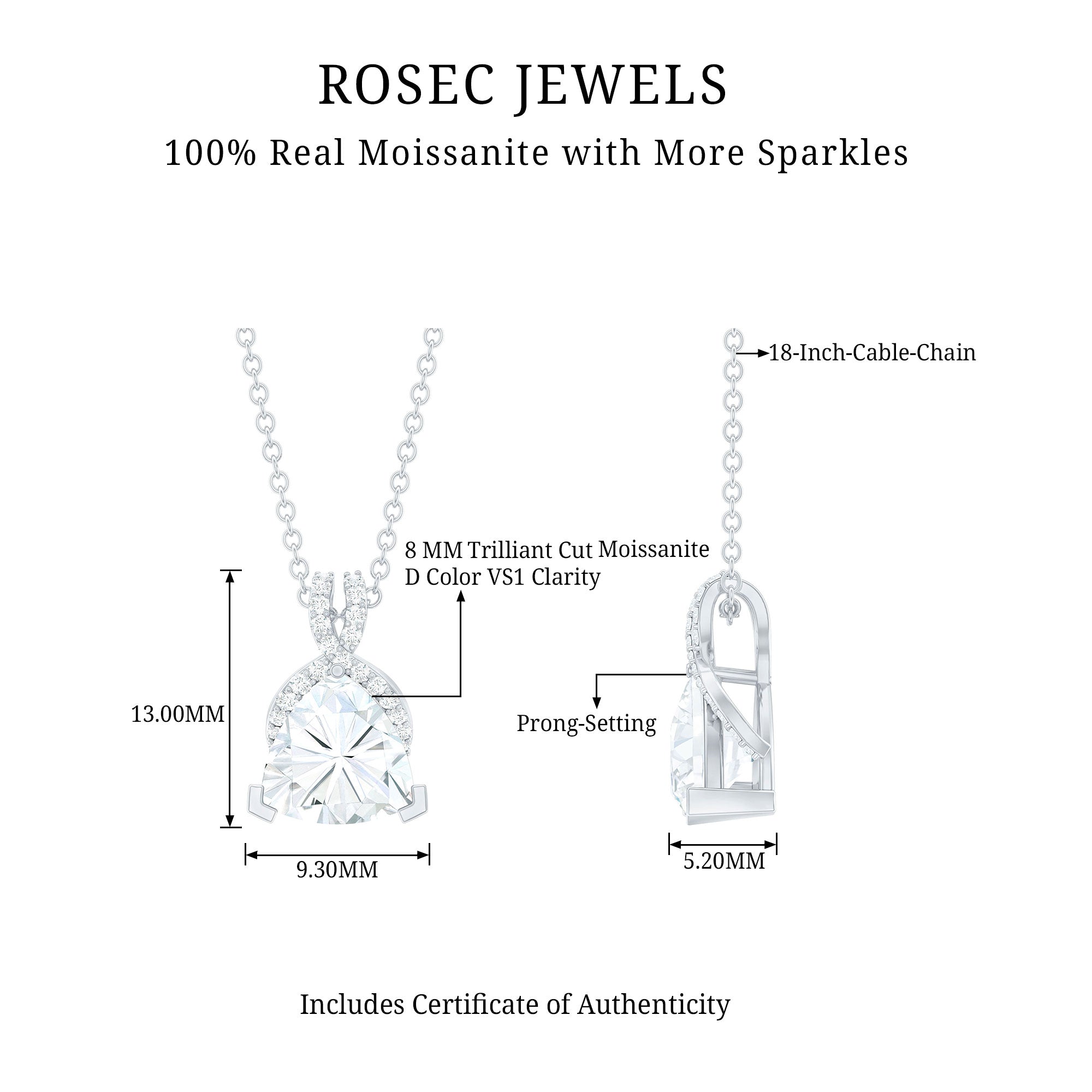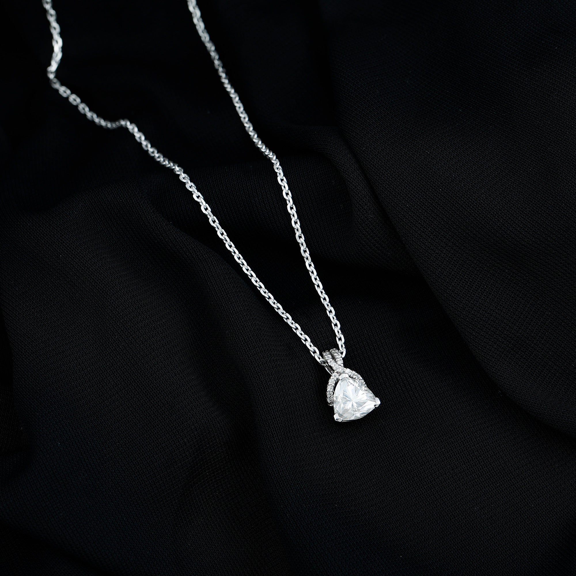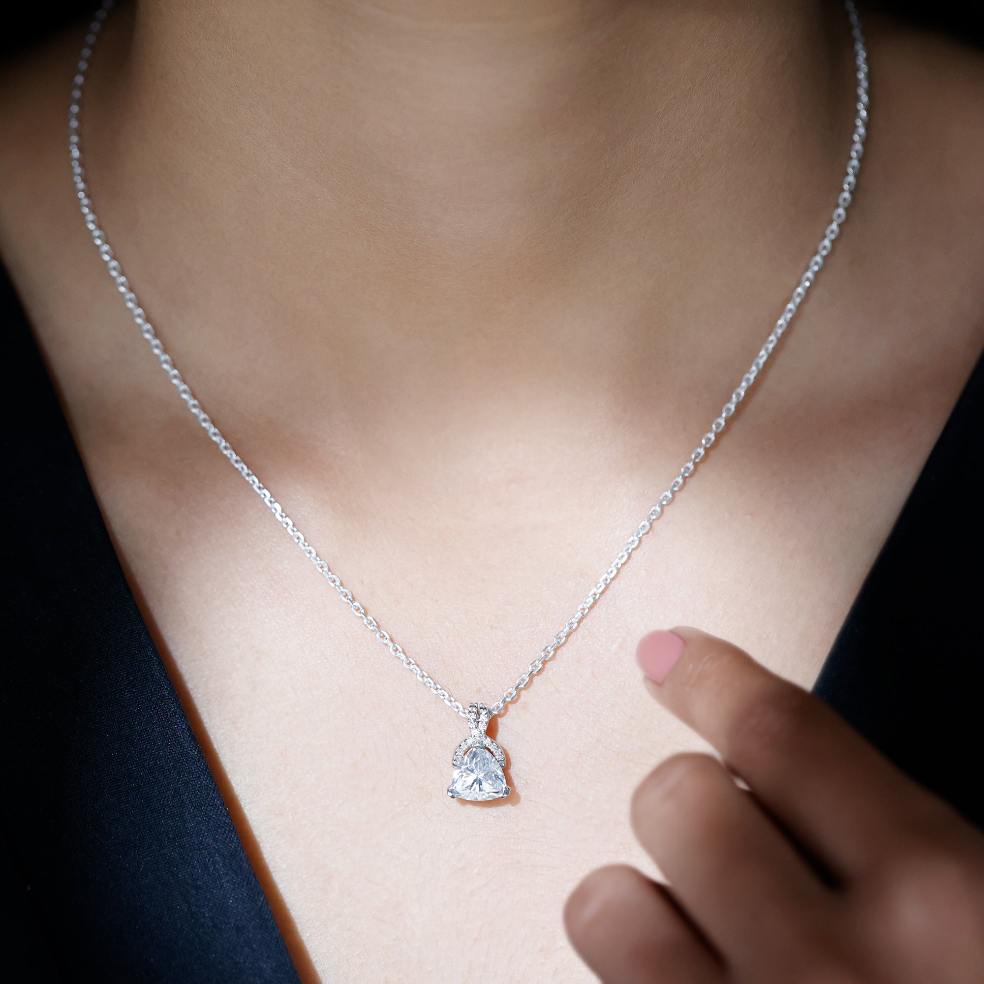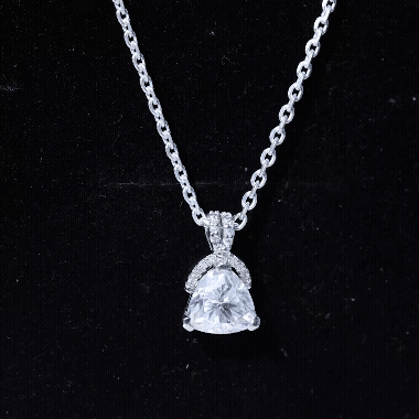 This Trilliant Cut Moissanite Pendant is all you want to complete your look for the special day. The Pendant with Chain exudes a remarkable shine that is perfect to dazzle the dome with your presence. The Sterling Silver Necklace features an 8 MM Trilliant Cut Moissanite secured in Prong setting and accentuated with a Rabbit ear bail studded with Smaller Stones. This Art Deco Necklace dangles in a silver cable chain, which allows you to adjust the length of the pendant according to the choice of your style. This Vintage Inspired Necklace Pendant can be presented as a gift for your lady love or your mother as a symbol of love and respect. The pendant will be shipped to you in a premium quality packaging.