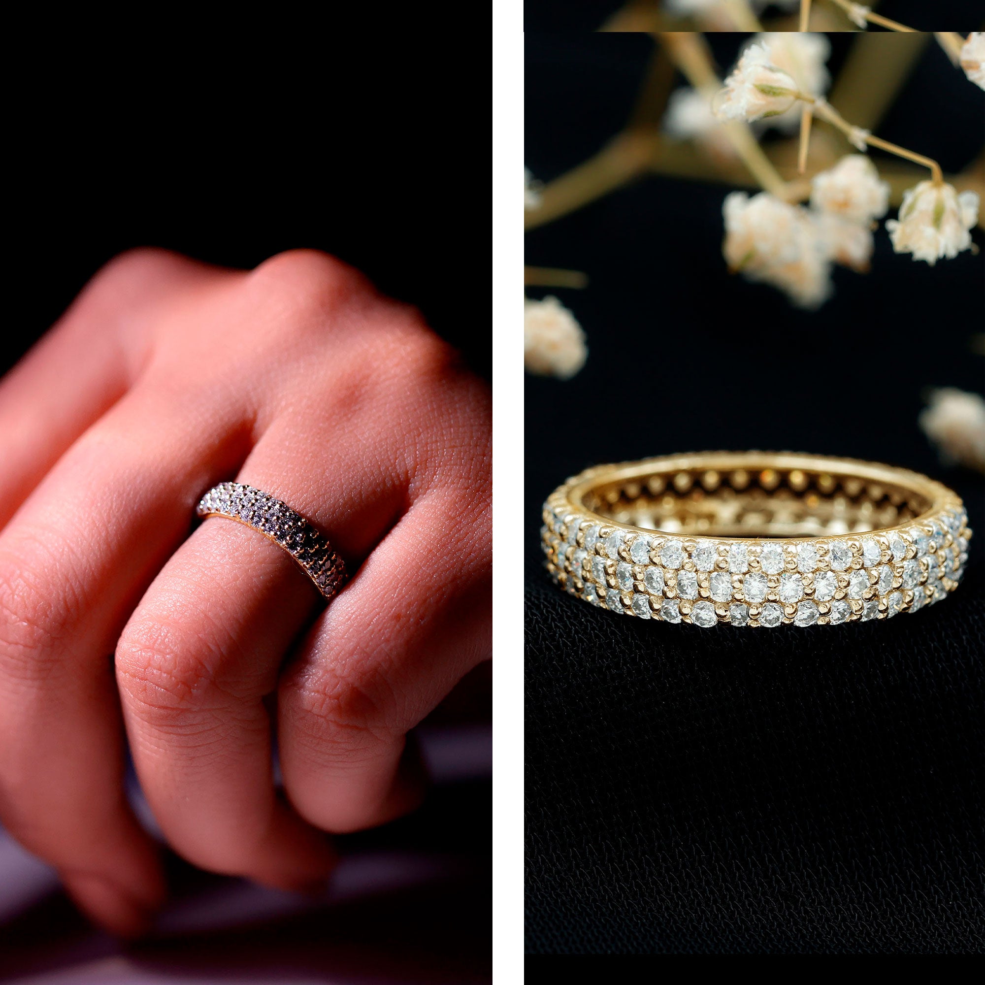 The triple-row layout enhances visual depth, allowing light to reflect from multiple angles. The structured design distributes sparkle evenly across the band, creating a cohesive and polished finish. Its symmetrical arrangement gives the ring a classic foundation while the layered effect adds dimension without overwhelming the hand.