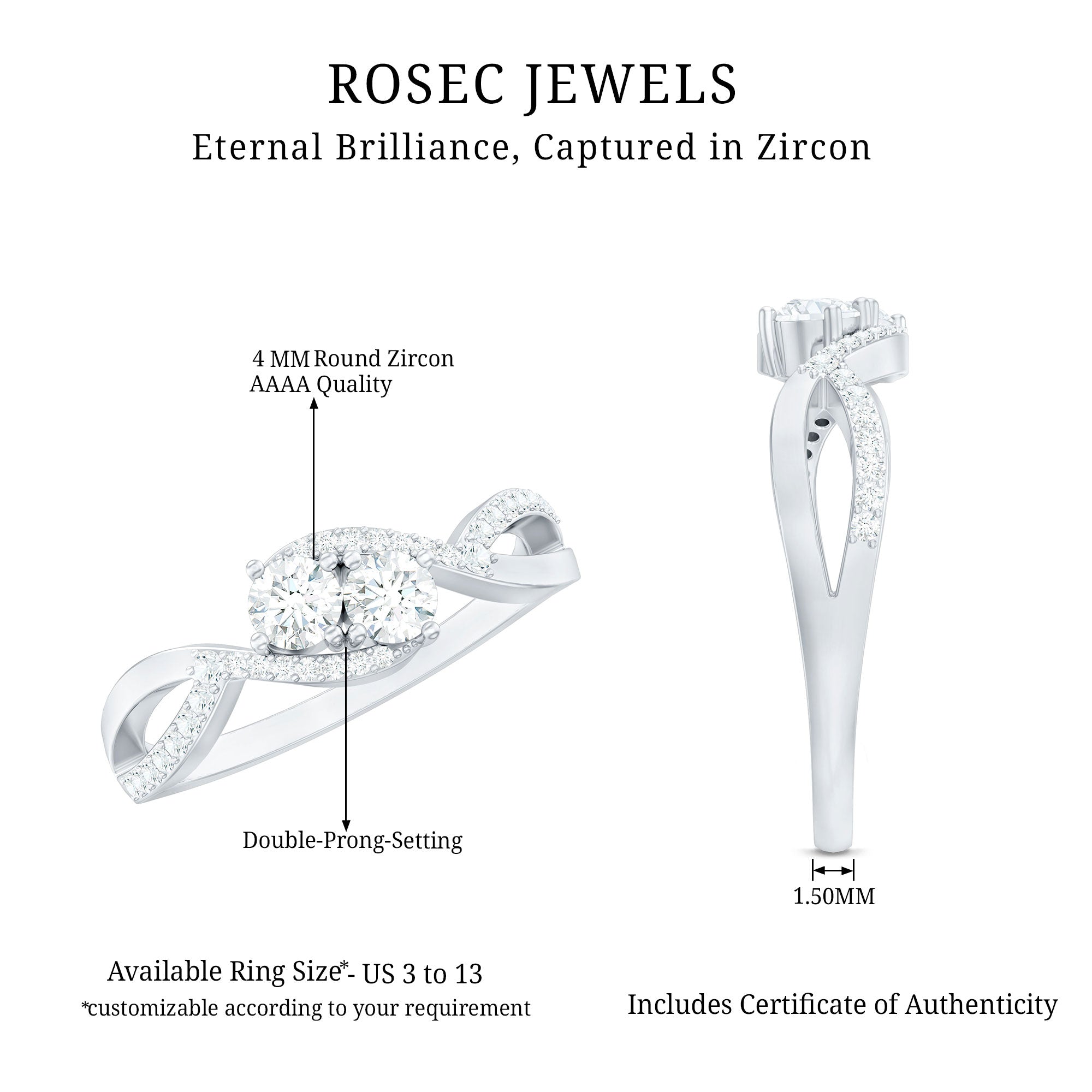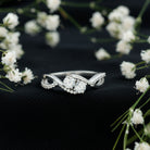 Grab this Cubic Zirconia Infinity Engagement Ring for your beloved one, featuring two Round Cut Cubic Zirconia secured in Prong Setting while dainty Round Cut Cubic Zirconia studded on the infinity shank. Adorn your finger with this Cubic Zirconia Ring to steal all the attention at any special event.