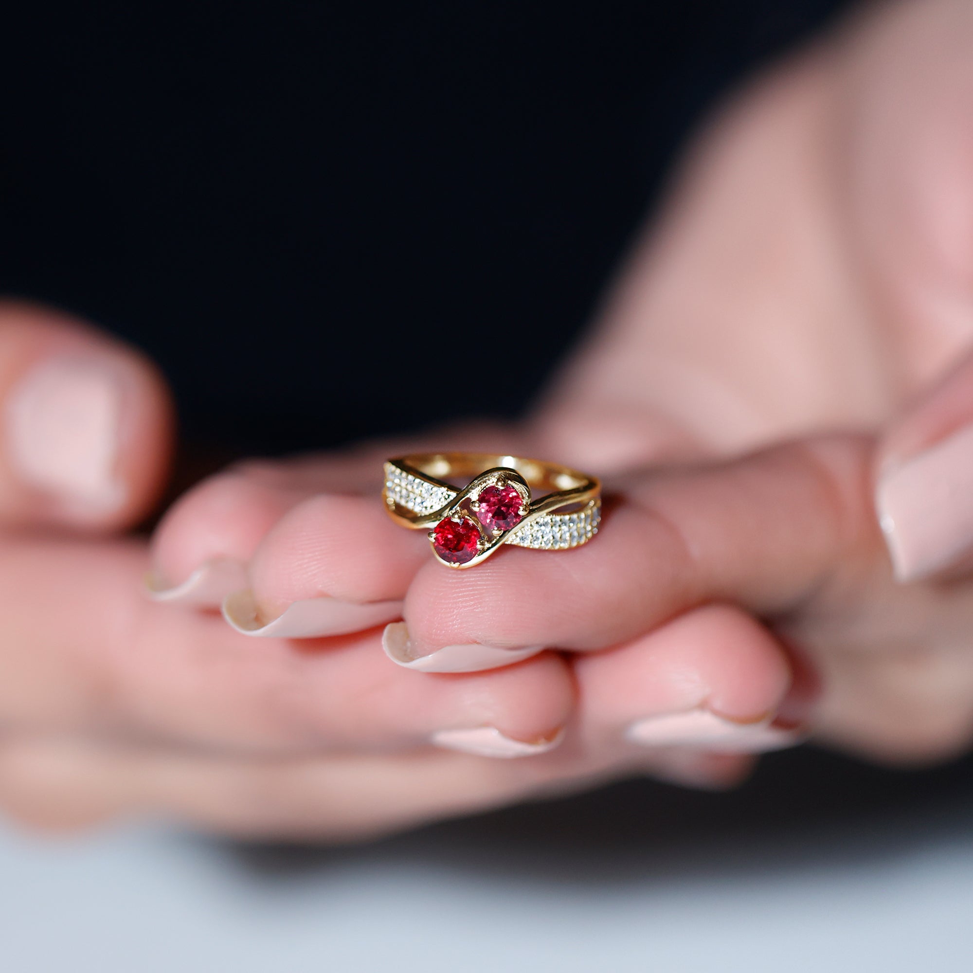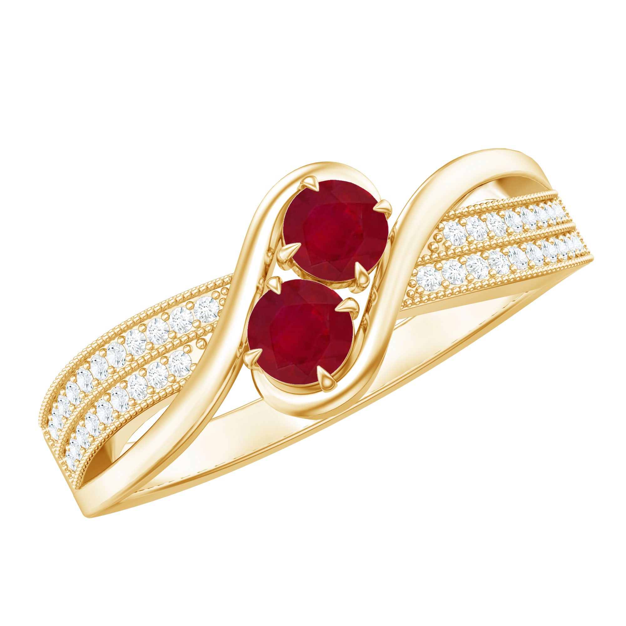 Unmatched in beauty and elegance, this Two Stone Engagement Ring is the classic look she has been dreaming of. Features two Round Cut Ruby secured in Claw Setting, additional Round Cut Diamonds dance down the band in two rows while Beaded Detailing finishes the look.