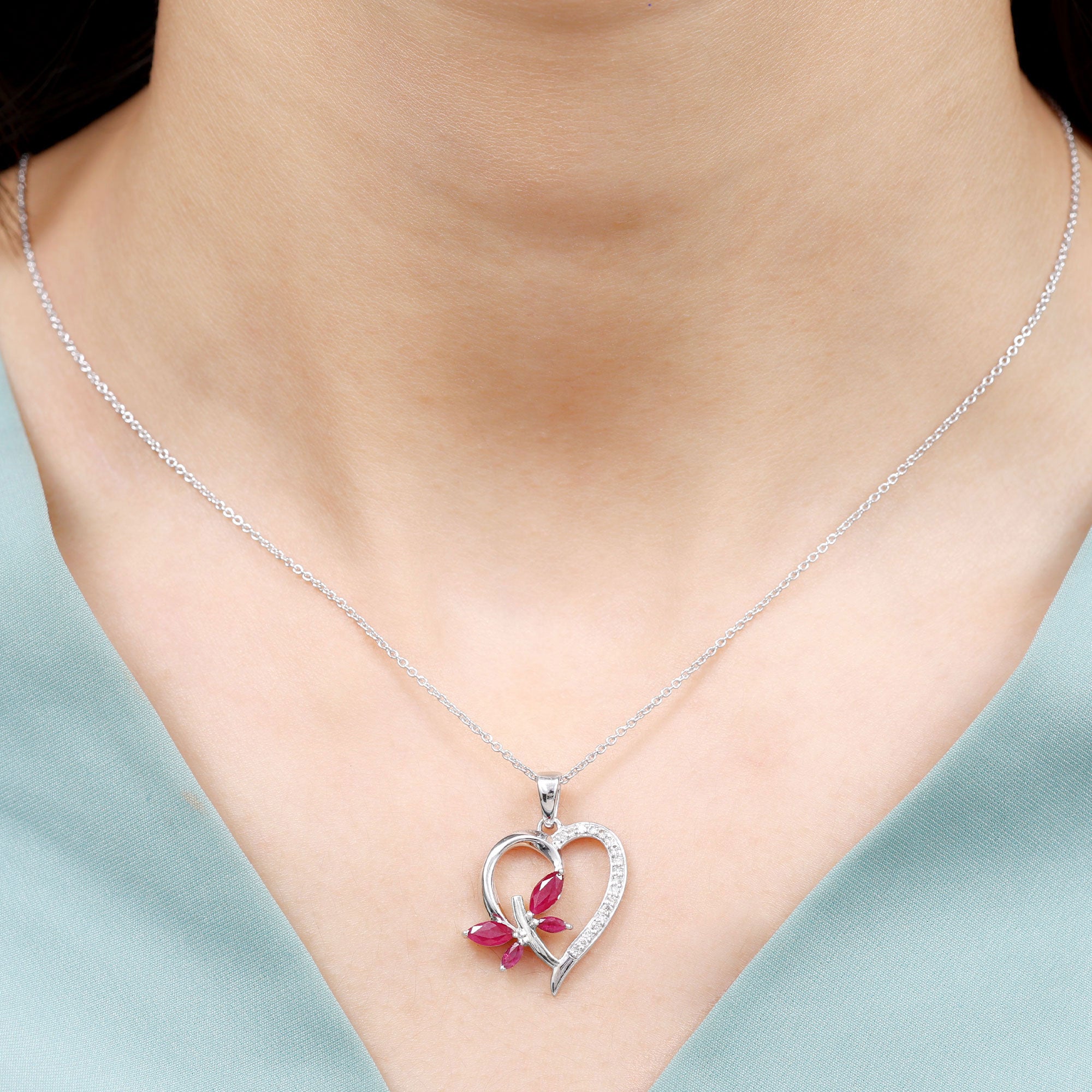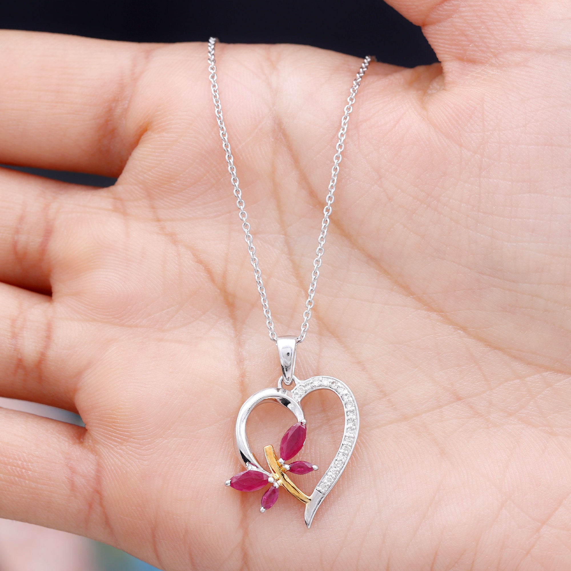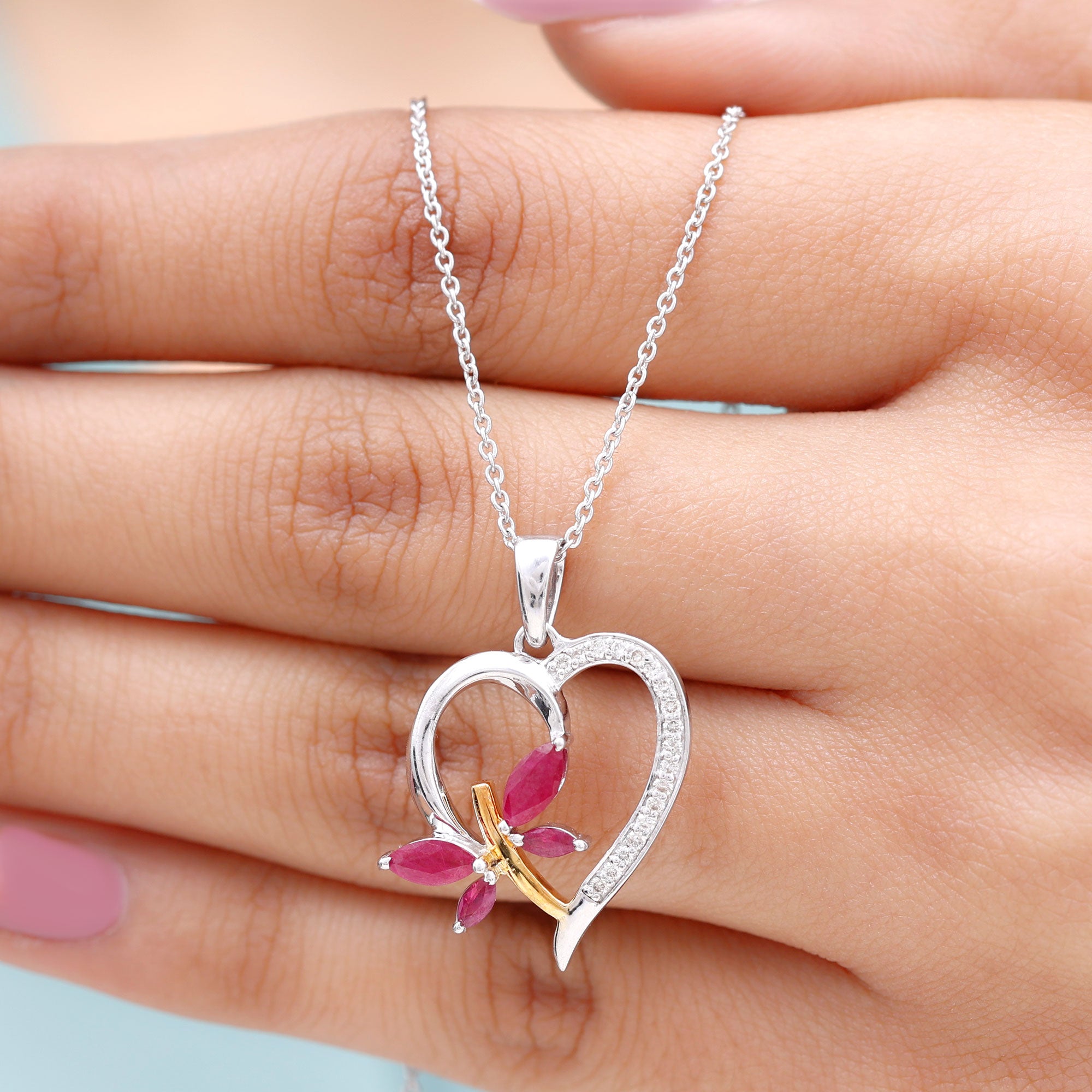It is a Butterfly Pendant Necklace, adorned in Solid Gold, and consists of Marquise Cut Created Ruby embellished in Prong Setting with Round Shape Diamond embellished in Pave Setting. It is also termed as a Heart Pendant Necklace for Women.