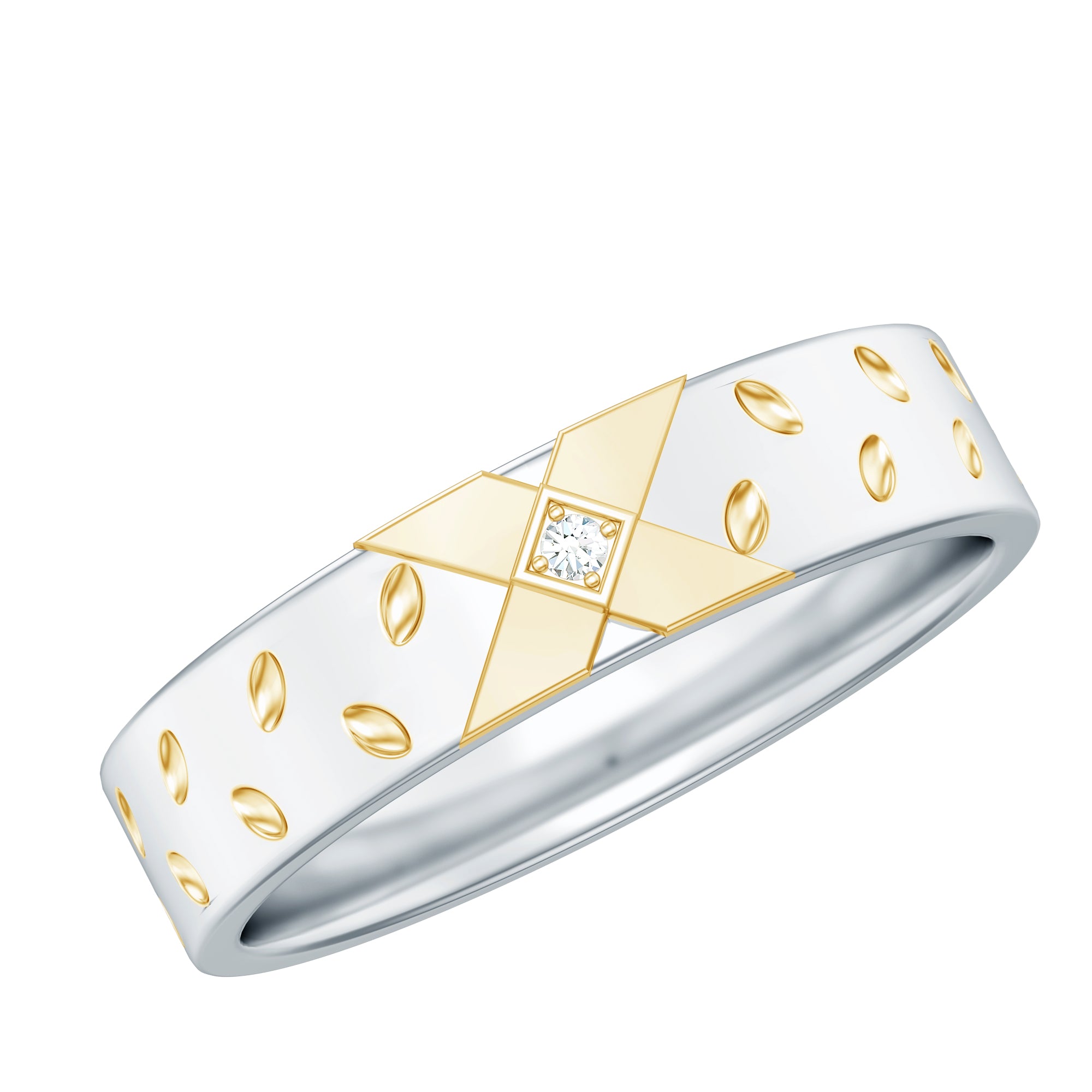 A Stunningly Beautiful and Antique Moissanite Cross Wedding Band is embellished with a Round Shape Moissanite set in the center of cross design. Unique Two Tone Wedding Band is composed of Two Tone Gold.