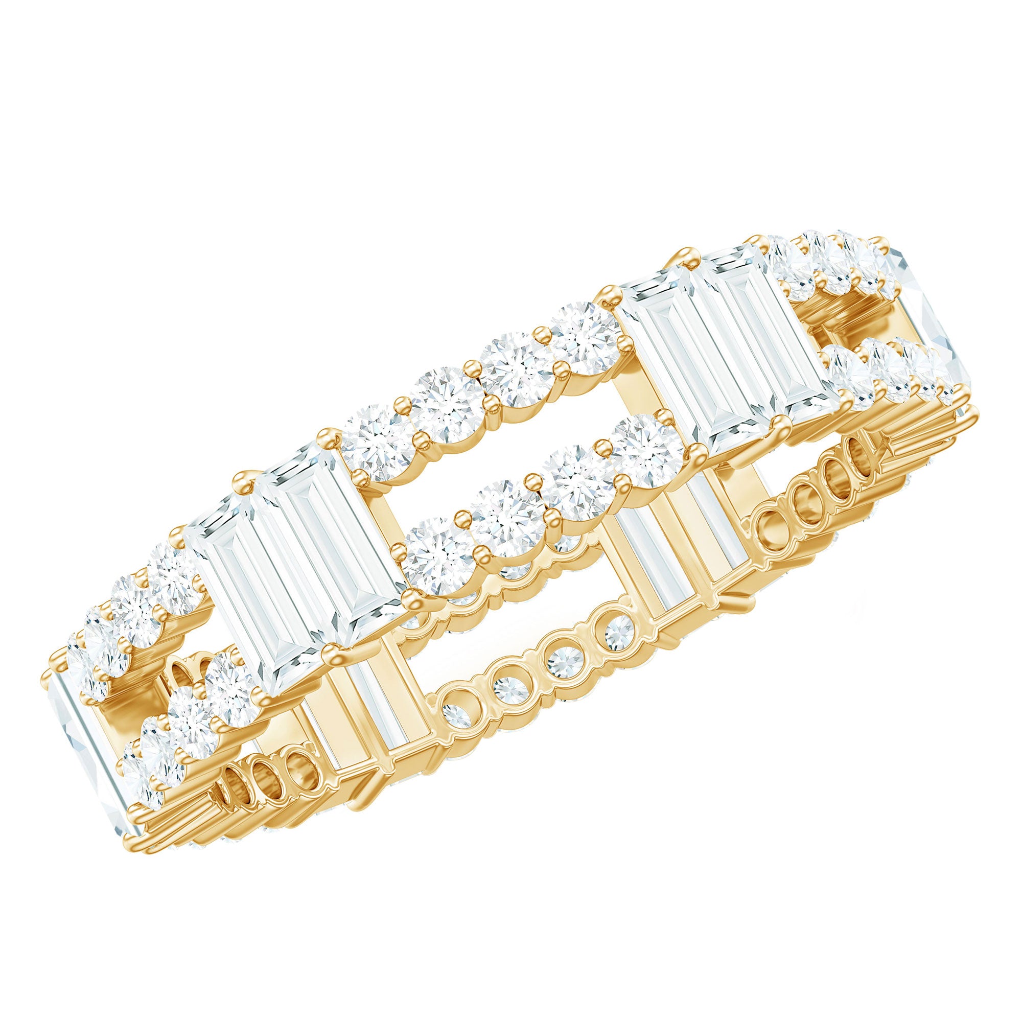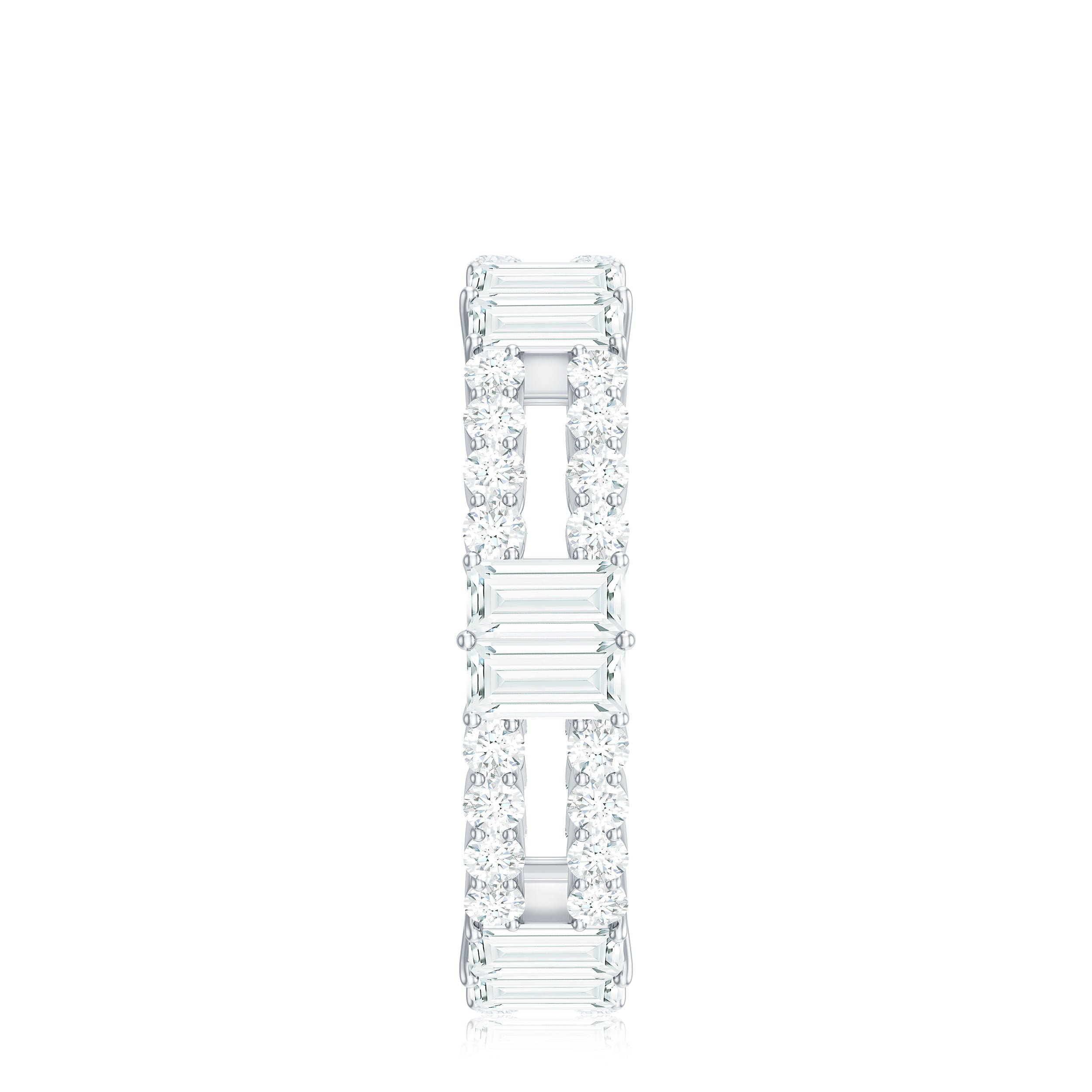 Double the dazzle, double the love, this Moissanite Wedding Band is made for moments that matter. It brings bold sparkle, modern style, and timeless symbolism together in one design that is impossible to ignore. This Eternity Wedding Band is a double-row beauty, sparkles with baguette and round cut moissanite stones set in secure prong setting, adding a luxe feel that takes the whole look to the next level. The contrast between the brilliant round stones and the sleek baguettes creates a rhythm that is both sophisticated and eye-catching. Since it is a full eternity design, the sparkle continues all the way around your finger, no dull side, no compromise. It is the kind of ring you can wear alone for a big statement or pair with an engagement ring for an ultra-glam stacked look. Whether you are celebrating your wedding, an anniversary, or just treating yourself (because why not?), this Certified Moissanite Eternity Band is made to shine through every moment. With a design that is this extra, in the best way, it is more than a ring, it is a celebration wrapped in sparkle.