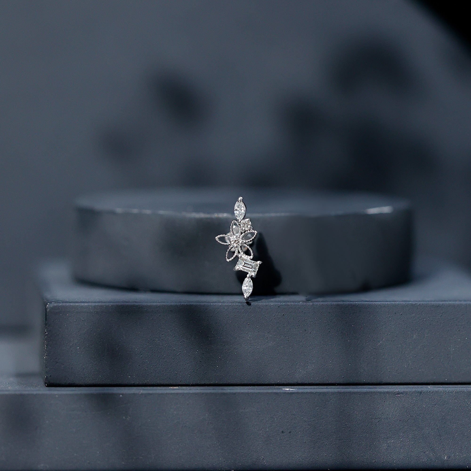 This Moissanite Flower Crawler Earring is adorned with Baguette, Marquise, and Round Moissanites in a Prong Setting, its a must-have accessory for flaunting your Helix, Upper Lobe, or Cartilage Piercings. Featuring a Flat Back Closure, this elegant Floral Earring will stay securely in place. This lovely Body Jewelry piece is perfect for achieving a chic look that will mesmerize everyone around you on any special occasion. Dont miss out on the opportunity to add this lovable Cartilage Earring to your jewelry collection.