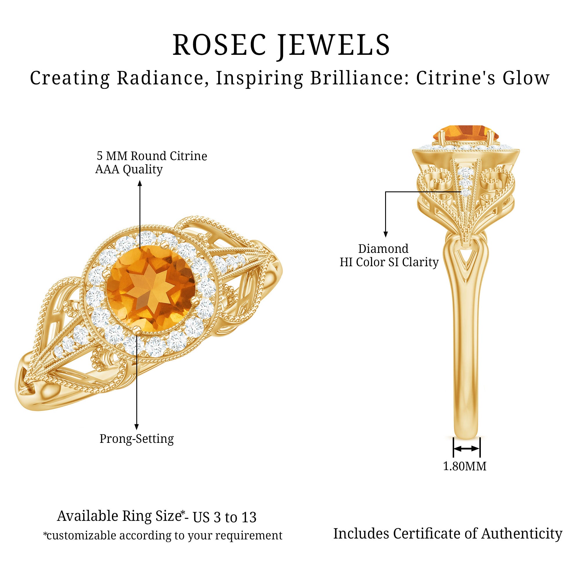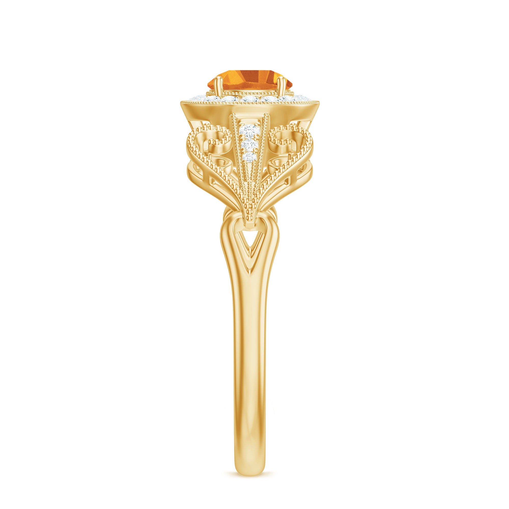 The brightness of Citrine makes this vintage ring more appealing. The Citrine Engagement Ring is embellished with Round Diamond Accent, glistening on the shank beautifully. The Citrine Diamond Engagement Ring is accentuated with Beaded Gold, making youre significant feel more precious with this Citrine Gold Ring.