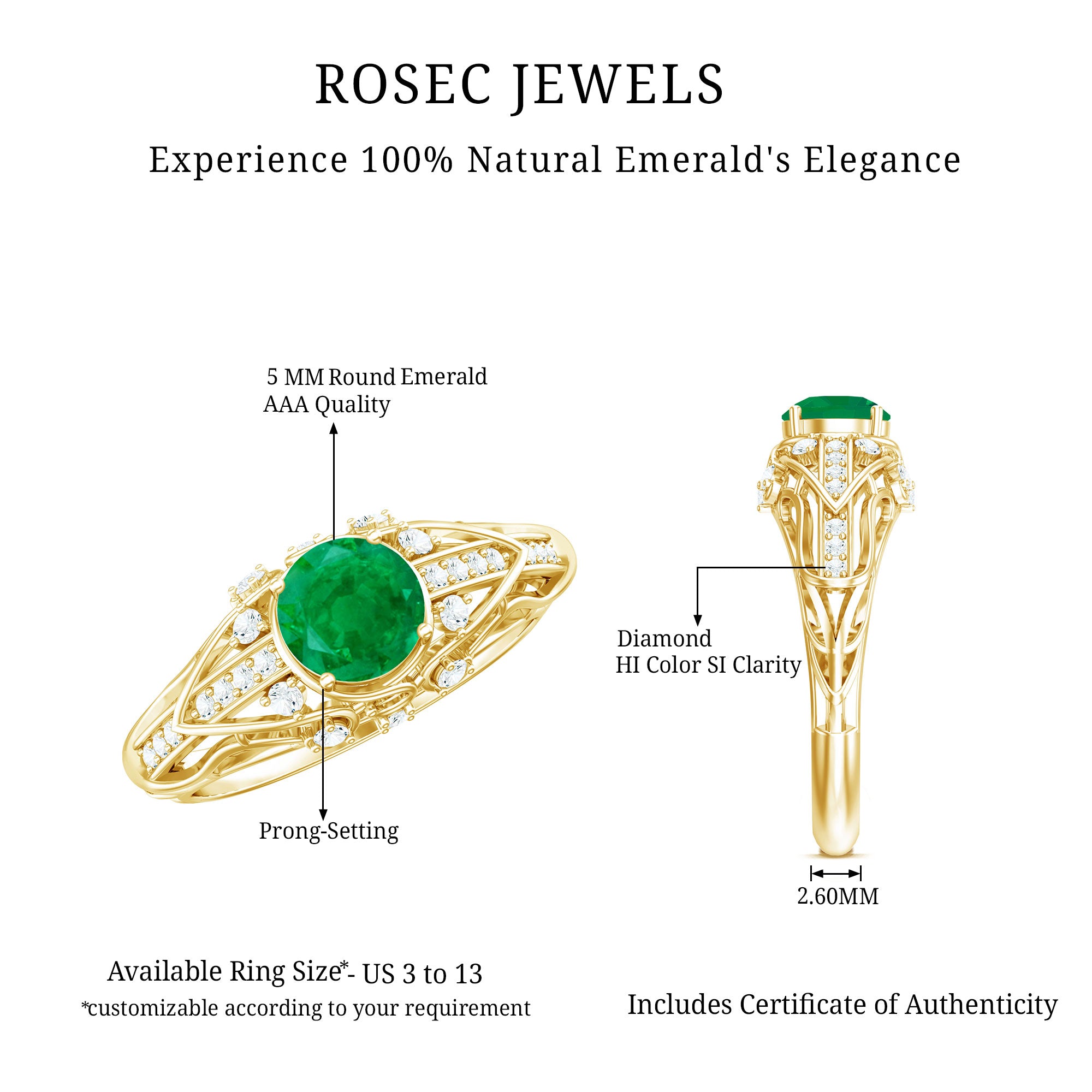 Let your love shine through timeless beauty with this Vintage Looking Engagement Ring, a stunning fusion of vintage charm and modern sophistication. The mesmerizing 5 mm Round Shape Emerald center stone radiates with a lush green brilliance, symbolizing renewal, balance and everlasting devotion. Its captivating glow instantly draws the eye, while the Diamond stones set along the band add a touch of glamour and light, creating a dazzling contrast that captures the essence of true romance. The vintage inspired design brings an air of nostalgia, reminiscent of classic eras where love was expressed with grace and grandeur. Every curve and detail of this ring has been thoughtfully crafted to celebrate passion, elegance, and individuality. Whether worn as a token of commitment or the centerpiece of a lifelong promise, this Emerald Diamond Engagement Ring speaks to a love that never goes out of style. Presented in a signature jewelry box and available in various ring sizes, this Vintage Emerald Engagement Ring is a timeless treasure that will continue to sparkle with every memory you create together.