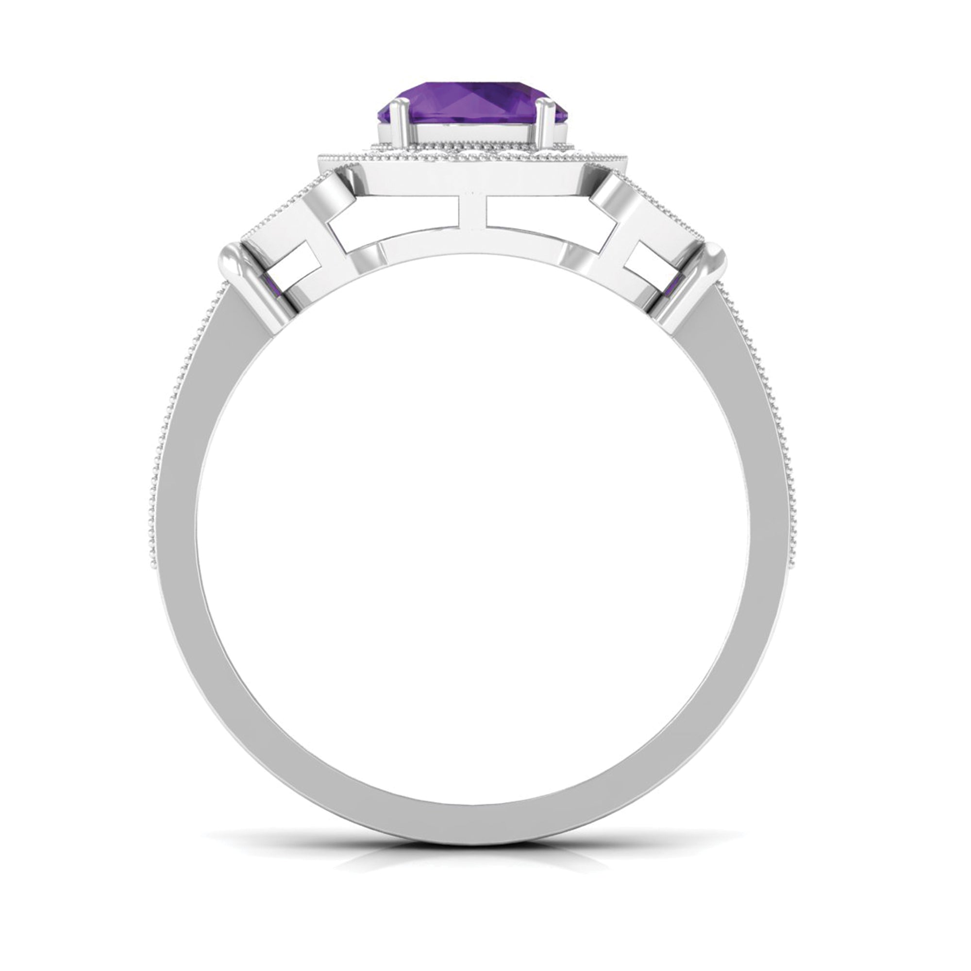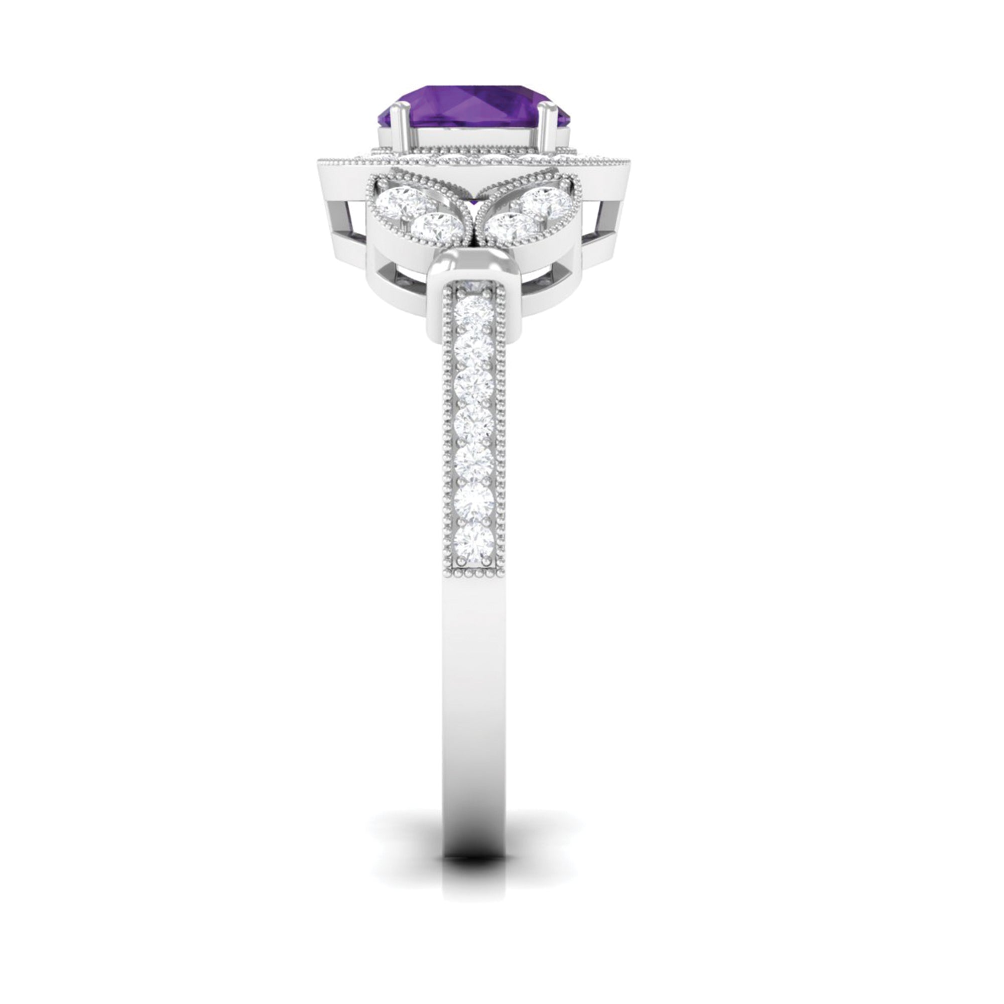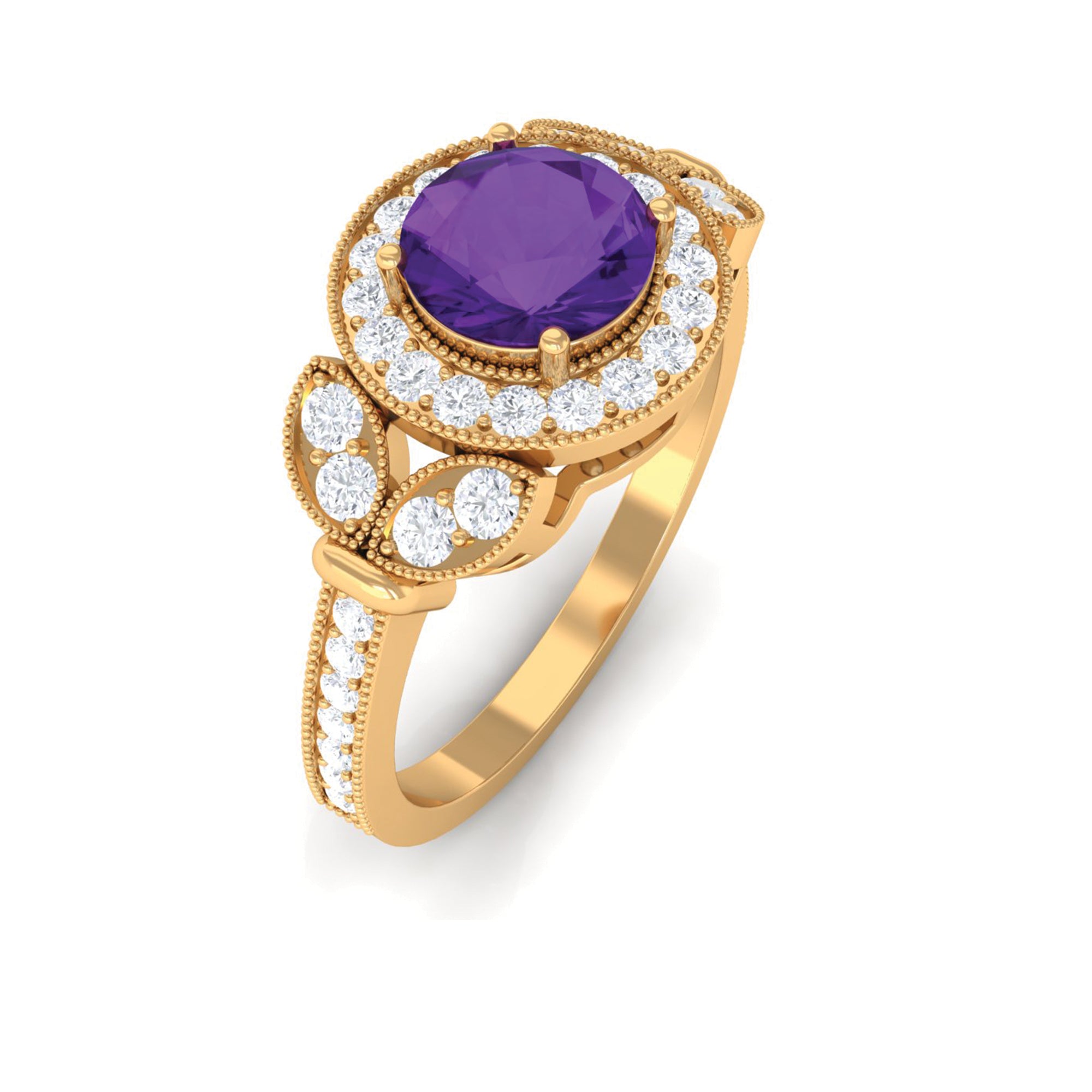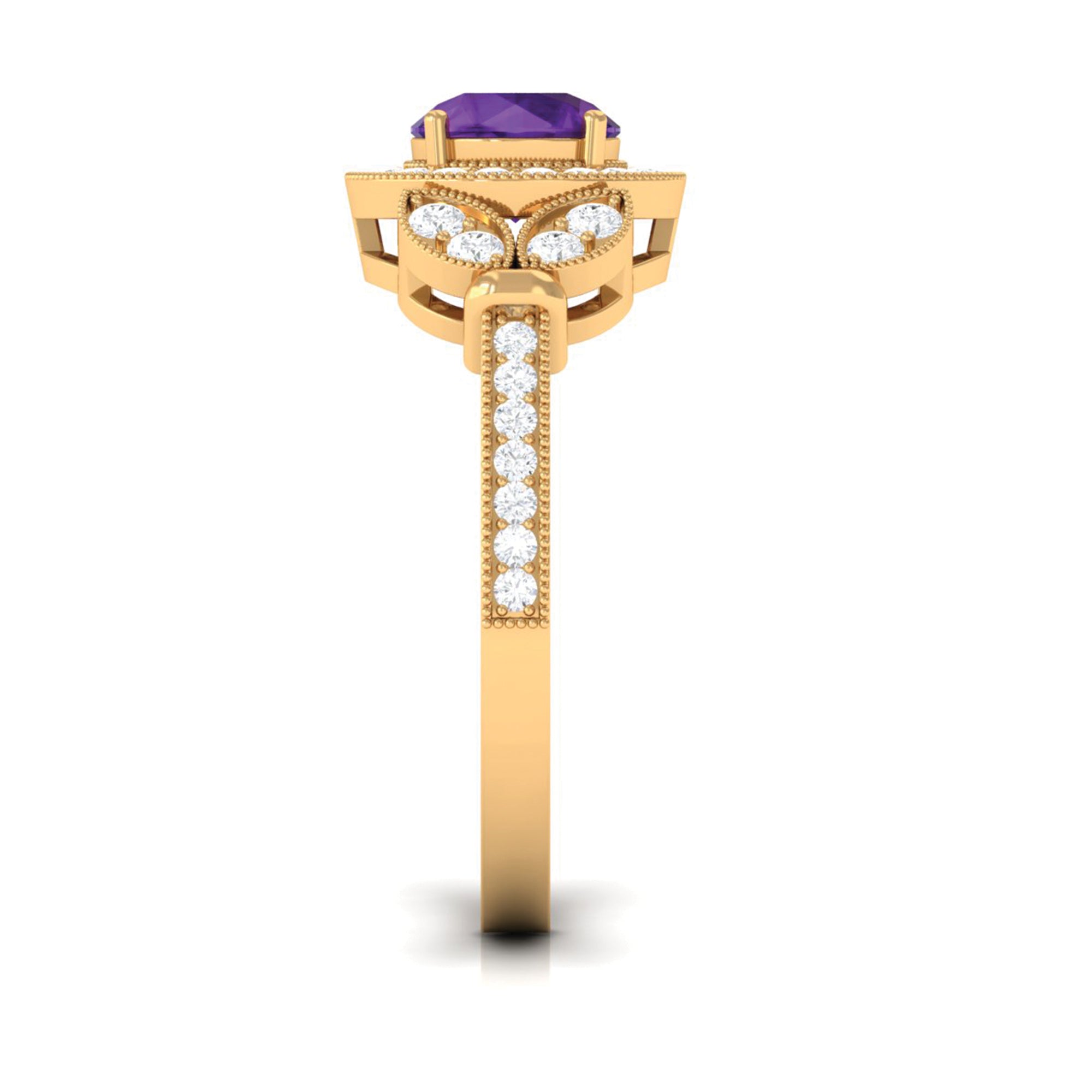 The fire and brilliance of Amethyst Engagement Ring will forever shines through in every way, Our Vintage Engagement Ring gives you extra ordinary feel on your big day. This Amethyst Vintage Engagement Ring is embellished with Round Cut Amethyst in Prong Setting with Moissanite Accent and Gold Beaded Details.