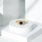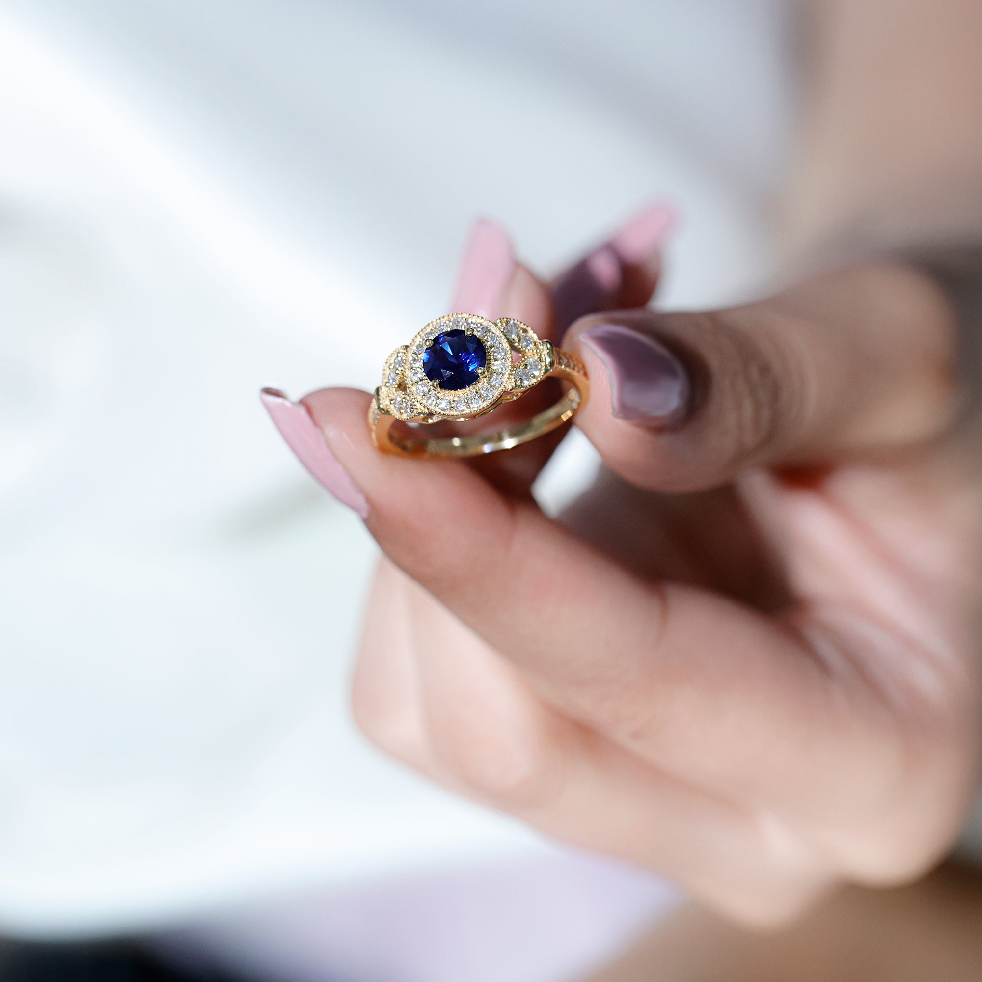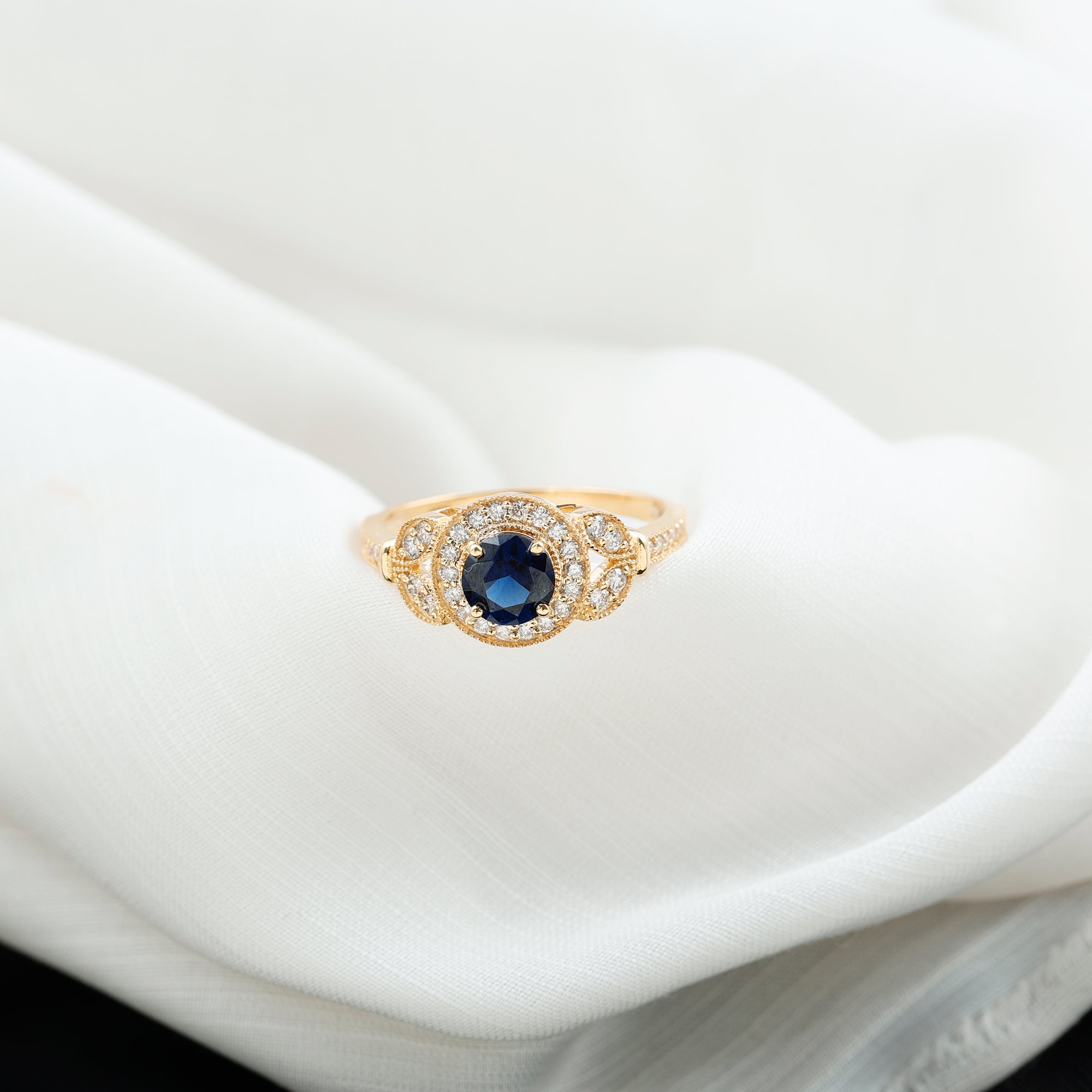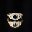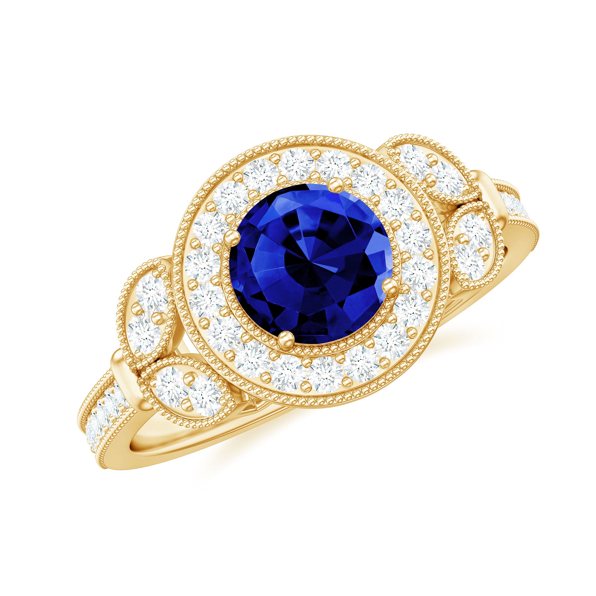 The fire and brilliance of Created Blue Sapphire Engagement Ring will forever shine through in every way, Our Vintage Engagement Ring gives you an extraordinary feel on your big day. This Created Blue Sapphire Vintage Engagement Ring is embellished with Round Shape Created Blue Sapphire in Prong Setting with Diamond Accent and Gold Beaded Details.
