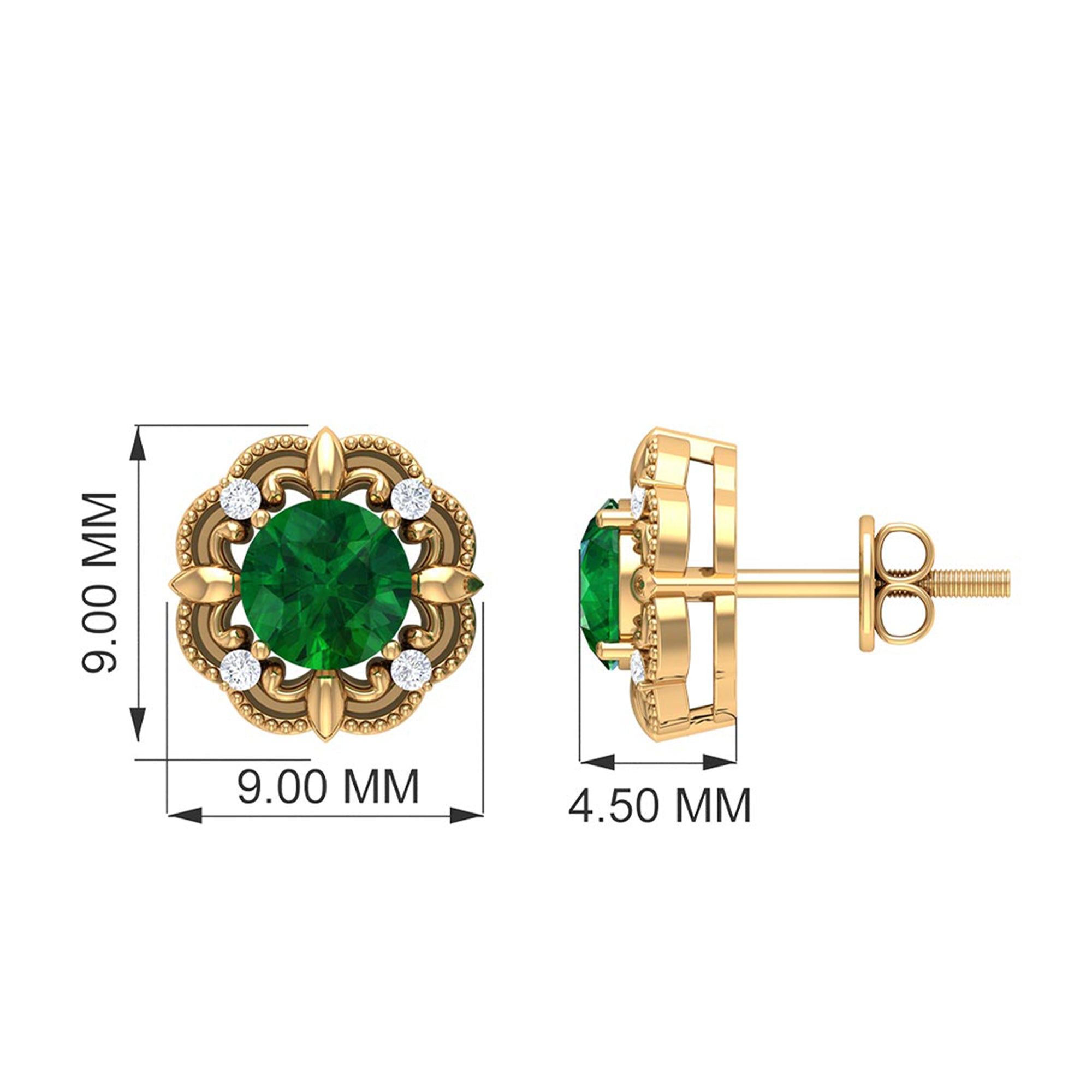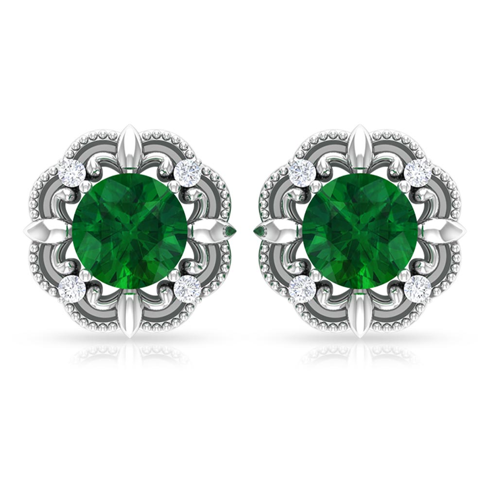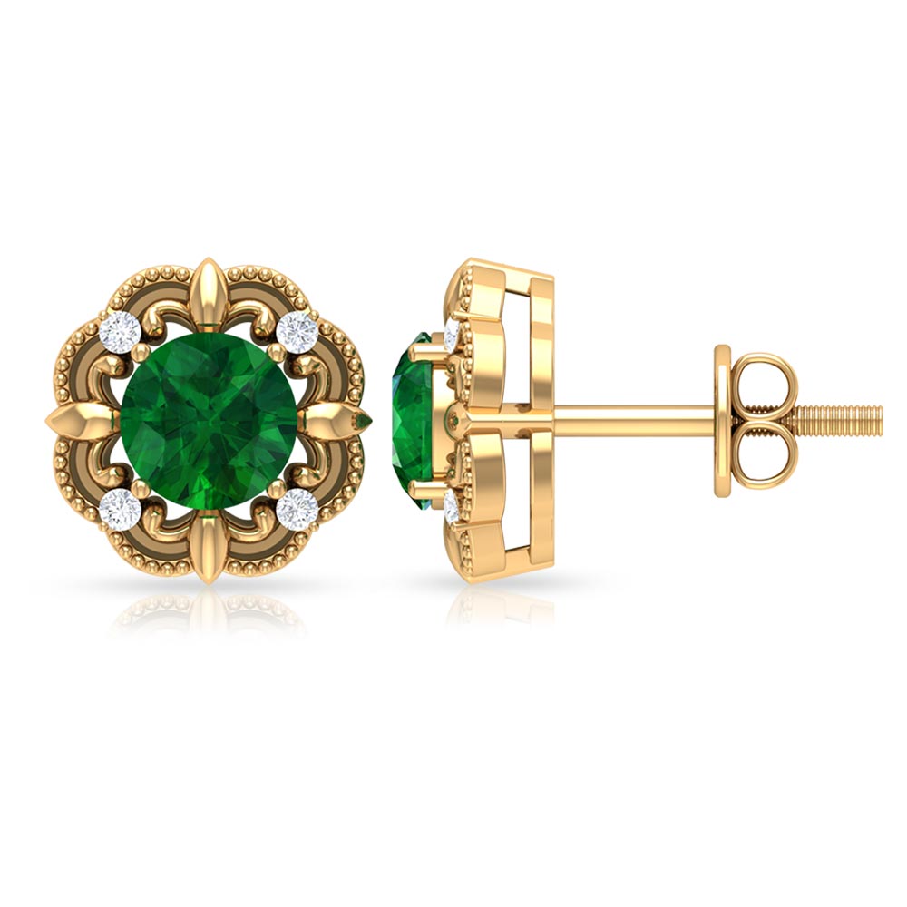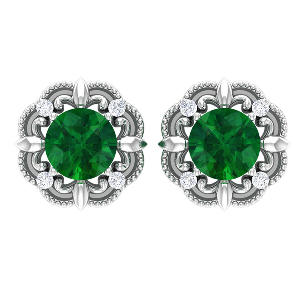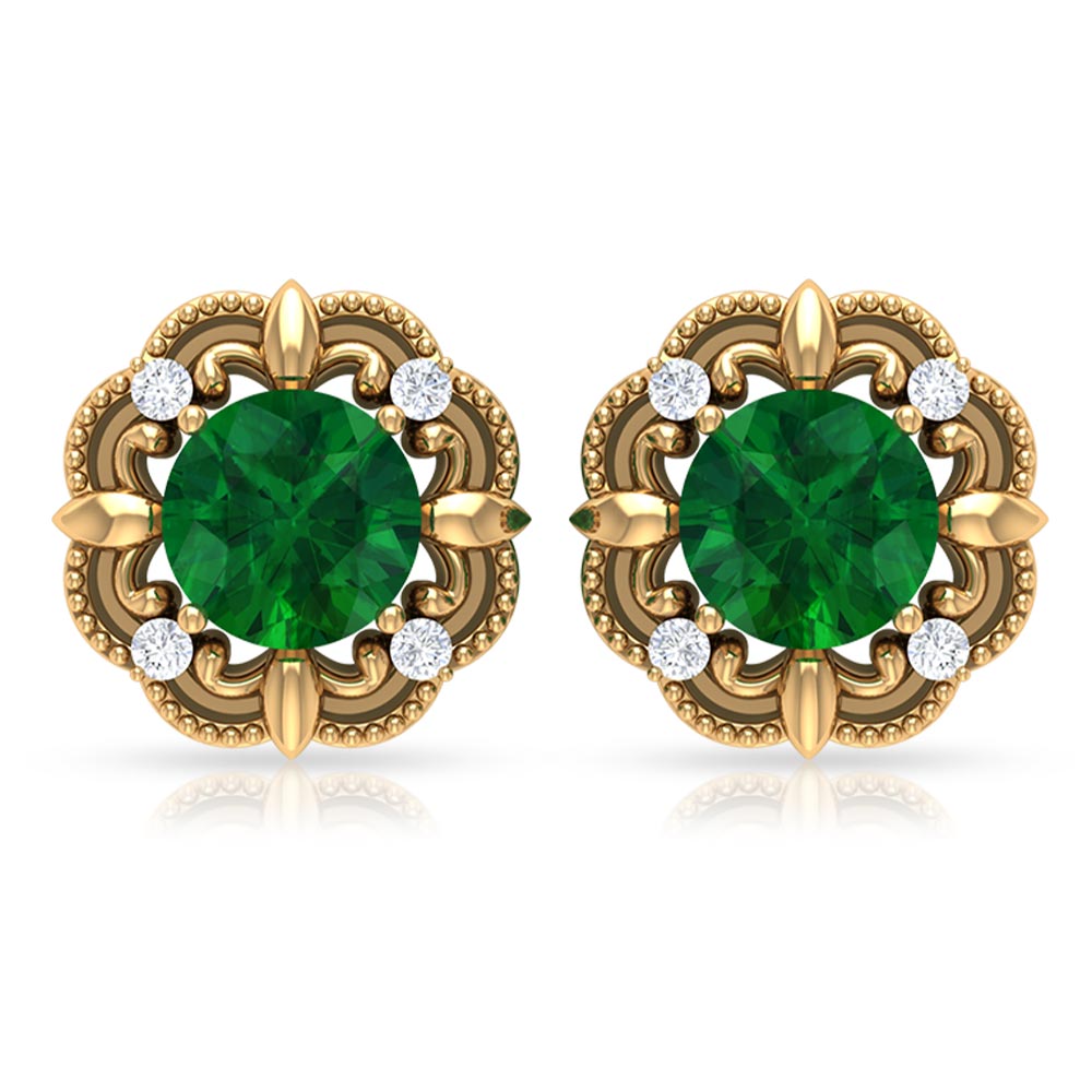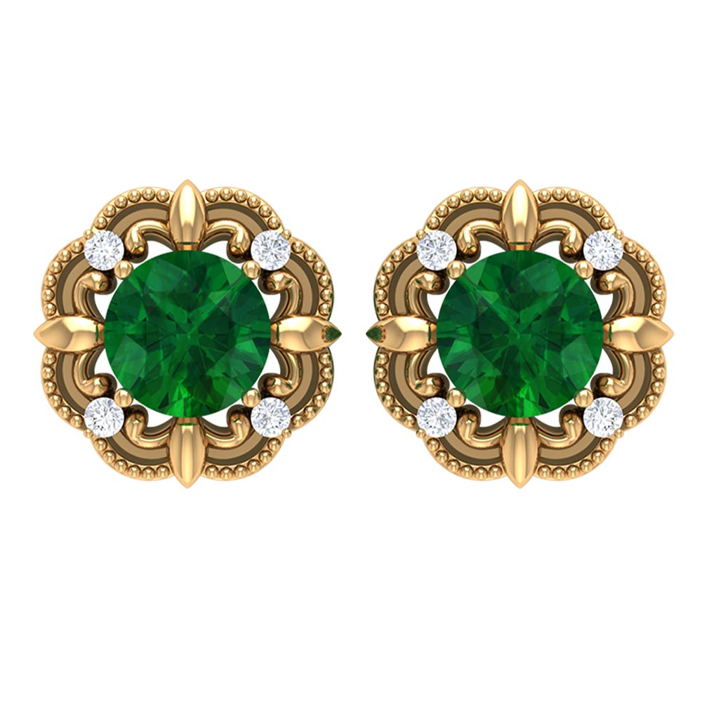 A reminiscent of timeless elegance, these Antique Emerald Earrings bring an old-world charm that feels both romantic and refreshingly modern. At the center is a 5 mm Round Shape Emerald set in Prong Setting, glowing with rich green color, wrapped in a beautifully detailed vintage-style frame. The Beaded detailing gives each earring a handcrafted feel, while the dainty Diamond stones add just the right touch of sparkle without overpowering the classic design. Secured with Screw Back Closure, these Emerald Diamond Earrings offer lasting comfort and confidence, making them perfect for all-day wear. These Vintage Emerald Earrings pair effortlessly with everything from flowy dresses to sleek evening outfits that call for a hint of vintage glamour. Presented in an elegant jewelry box, these Emerald Stud Earrings also make a thoughtful and meaningful gift, ideal for birthdays, anniversaries or anyone who appreciates jewelry with old-world beauty.