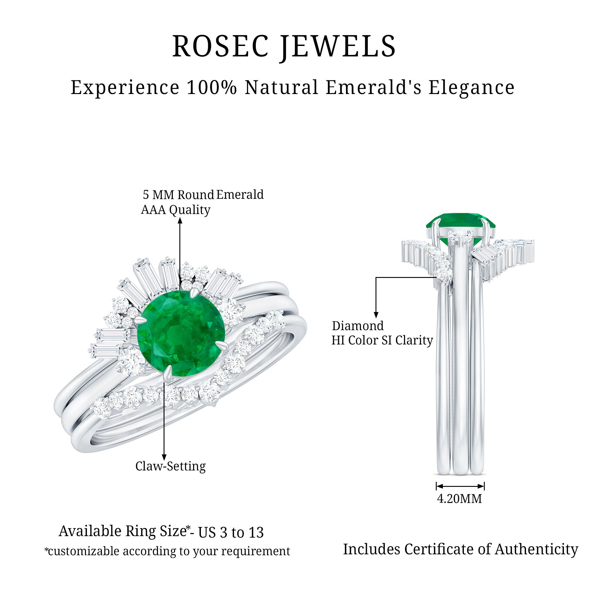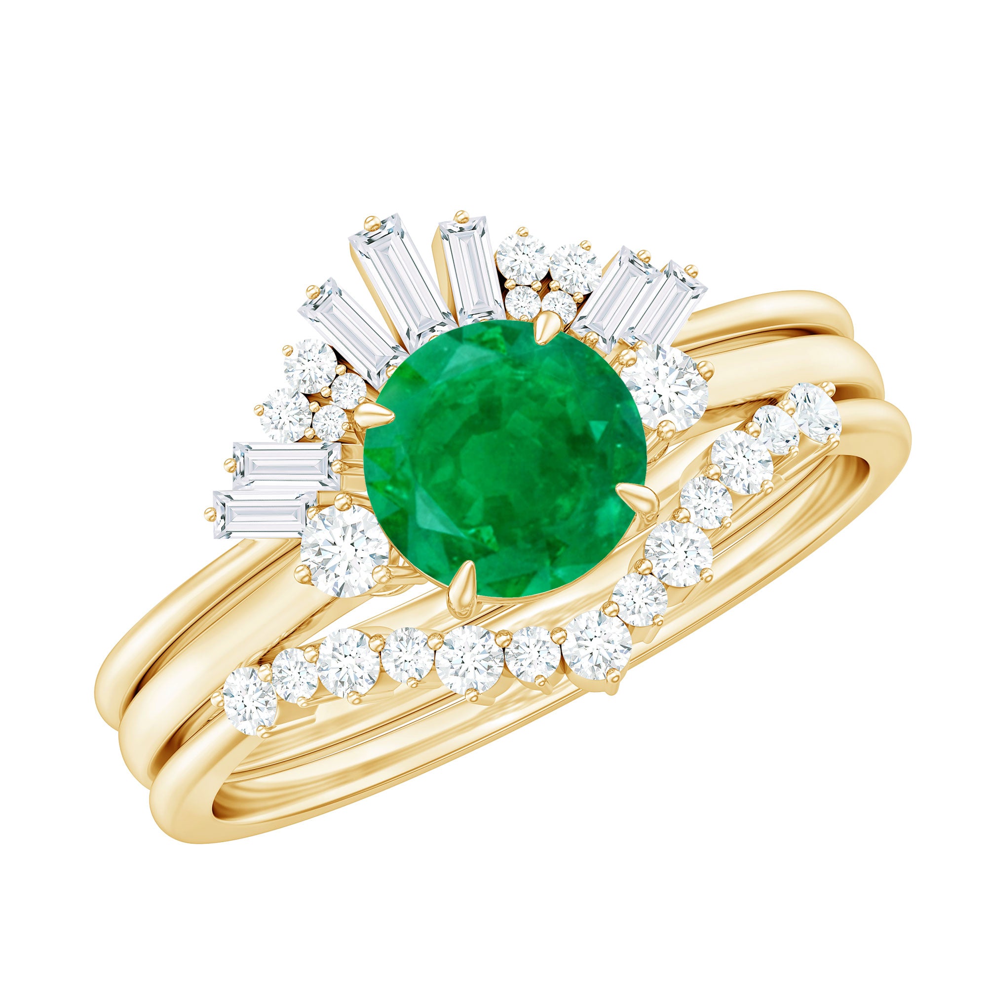 Immerse yourself in timeless elegance with this Wedding Bridal Ring Set, a trio designed to celebrate love in its most radiant form. The solitaire engagement ring dazzles with a round emerald at its center, flanked by a sparkling Diamond that captures the light from every angle, evoking both sophistication and heartfelt devotion. Complementing it, one gracefully Curved Wedding Band is adorned with Round and Baguette Shape Diamond stones, while the other band sparkles with Round Diamond stones, together creating a harmonious, layered design that symbolizes unity, balance and eternal commitment. Available in multiple sizes to ensure a perfect fit, this Emerald Diamond Engagement Ring with Wedding Band comes elegantly presented in a jewelry box, ready to turn proposals, anniversaries or meaningful milestones into unforgettable moments. This Emerald Wedding Ring Set is a luminous testament to shared dreams, enduring passion and the beauty of a love story unfolding. Let this enchanting trio shine as the centerpiece of your journey together, reflecting elegance, romance and devotion with every sparkling facet.
