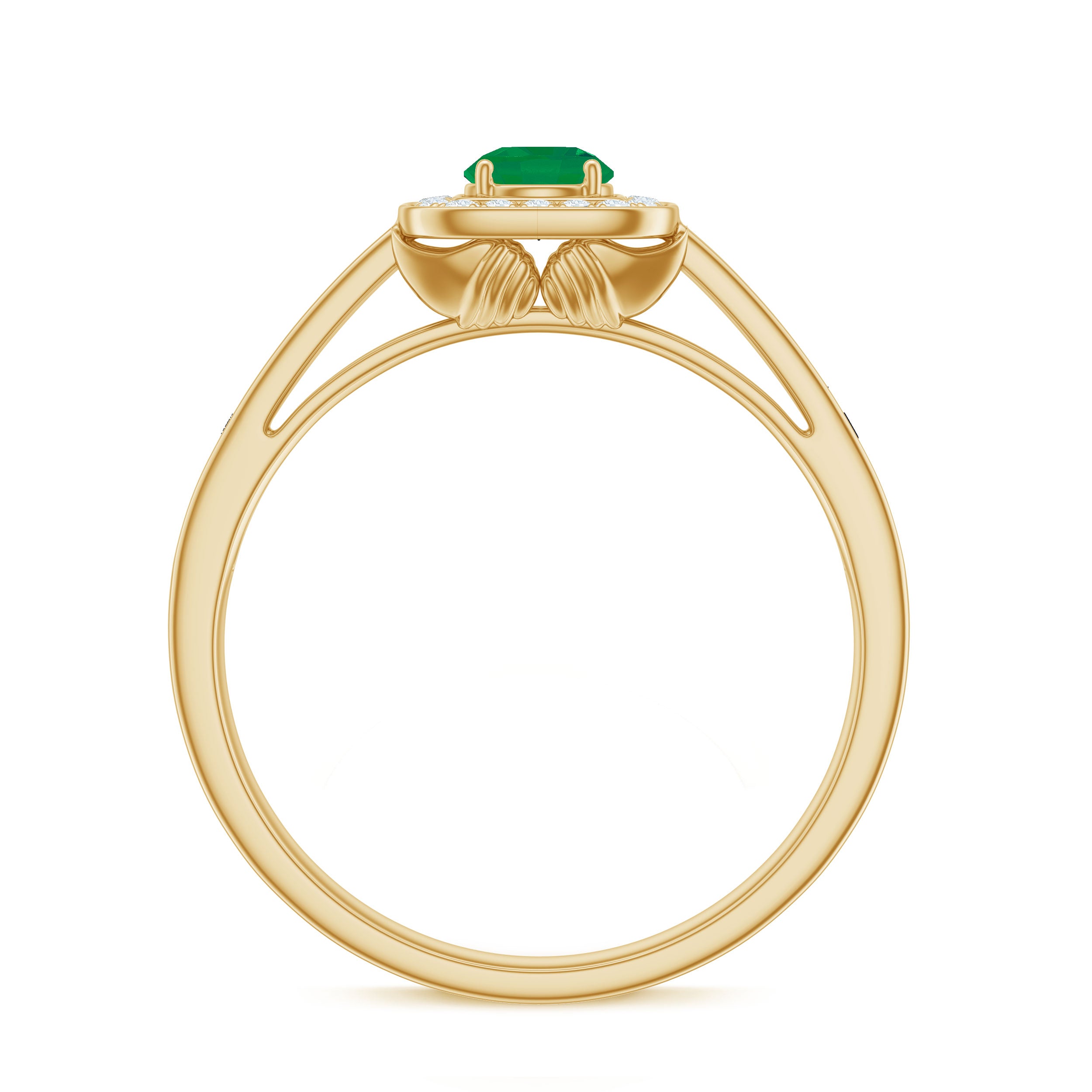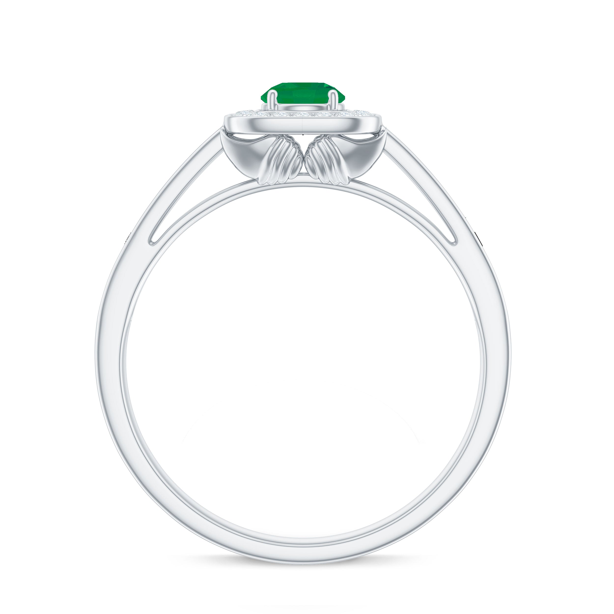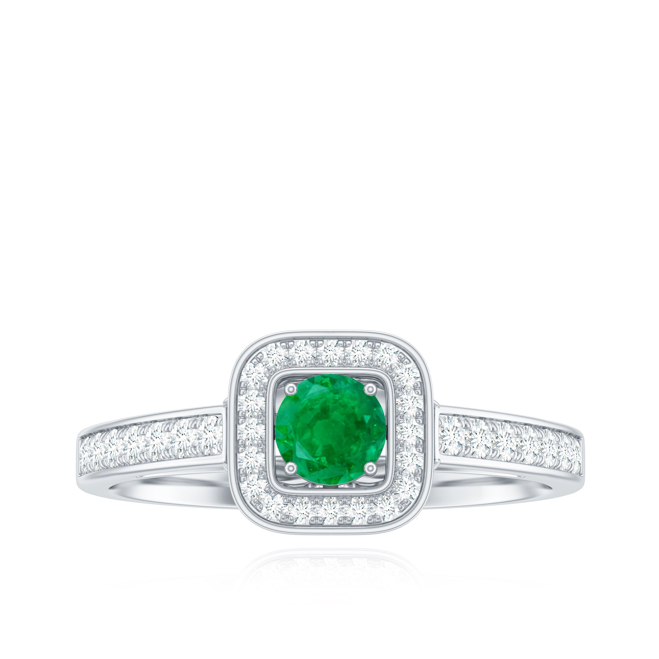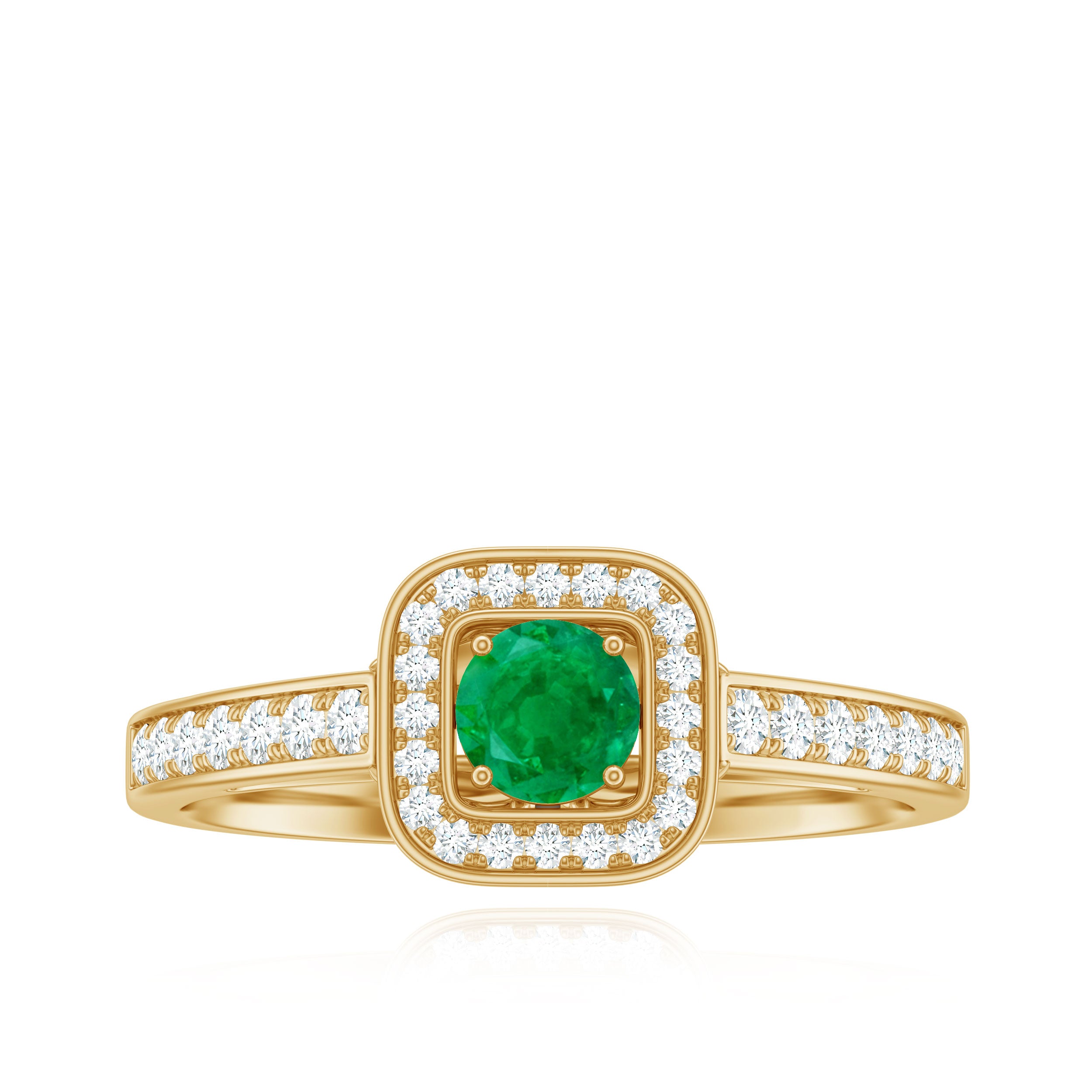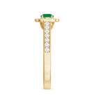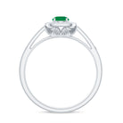 An enduring vintage inspired engagement ring adorned with a round emerald in the center and a diamond halo will undoubtedly capture everyones admiration for your sense of style.