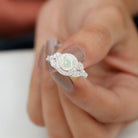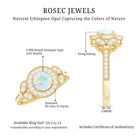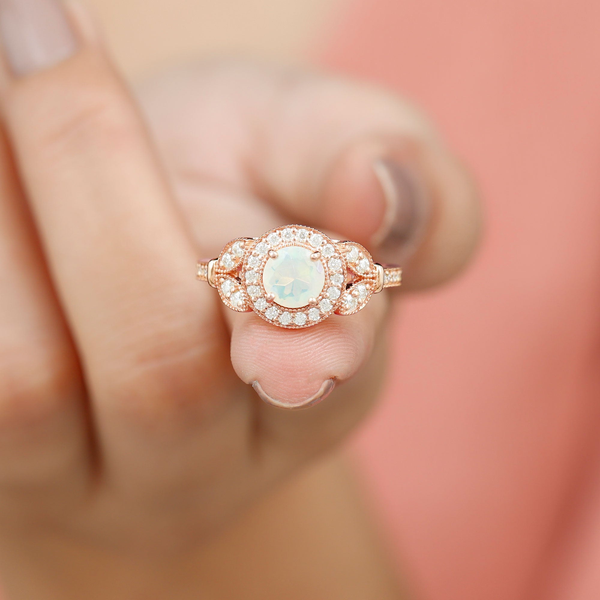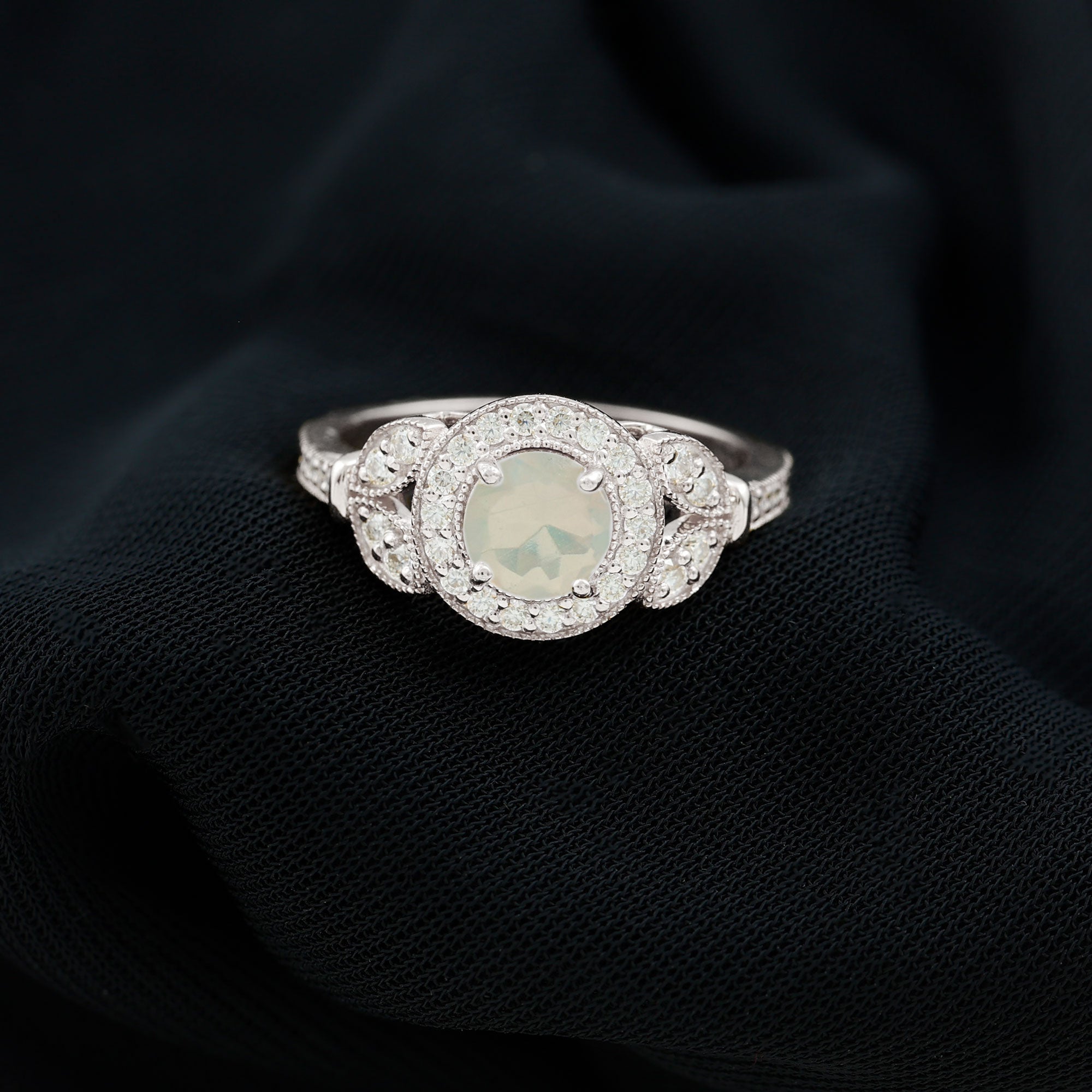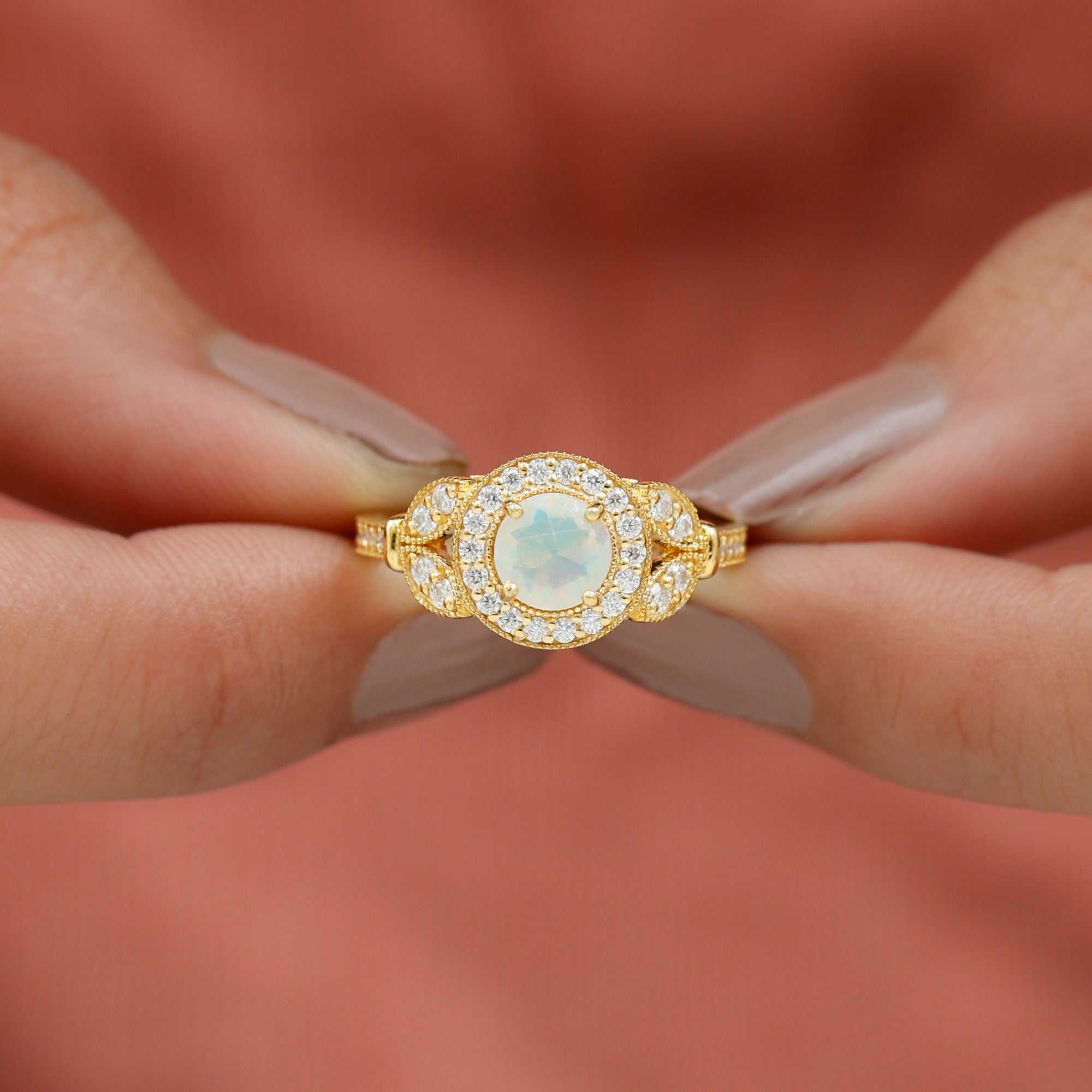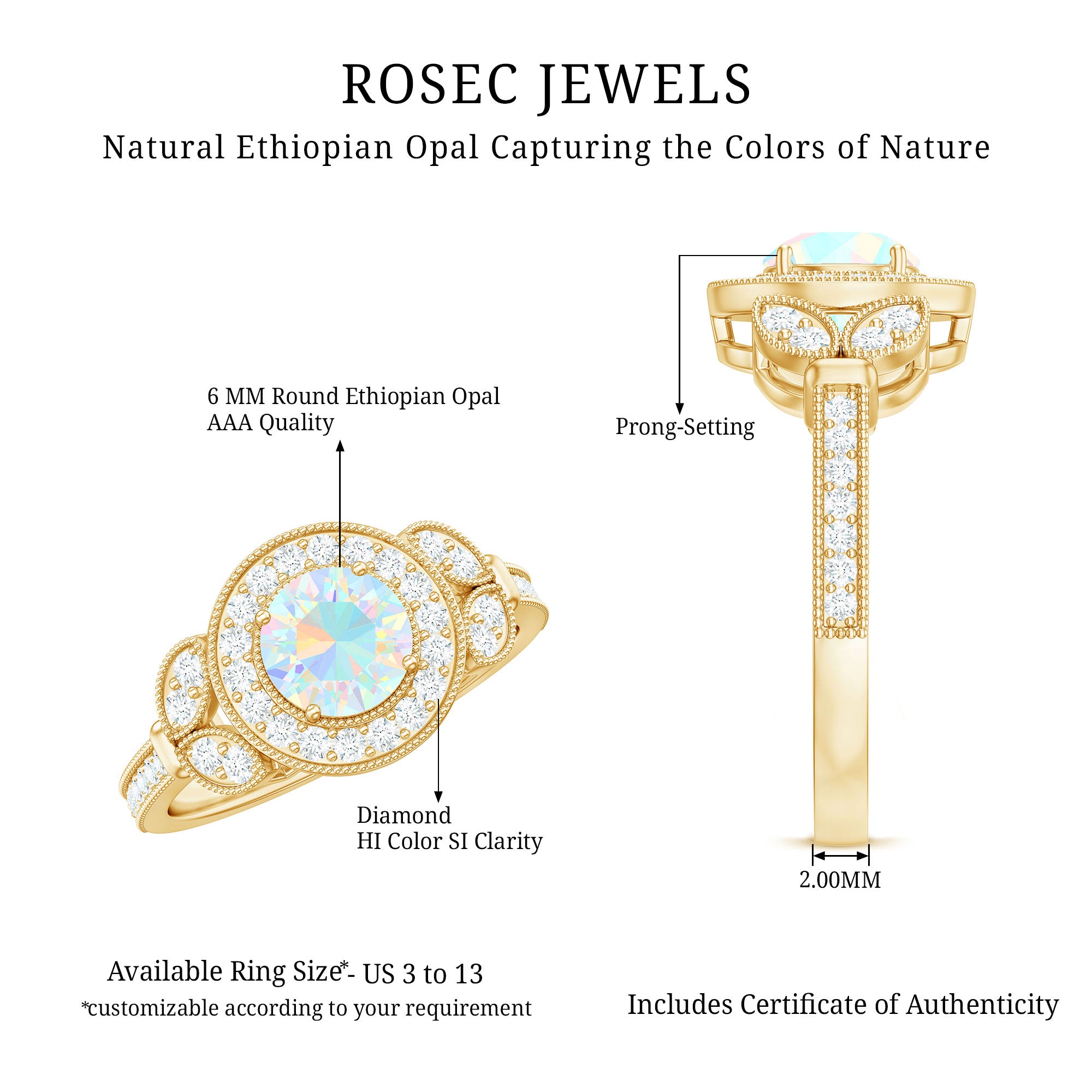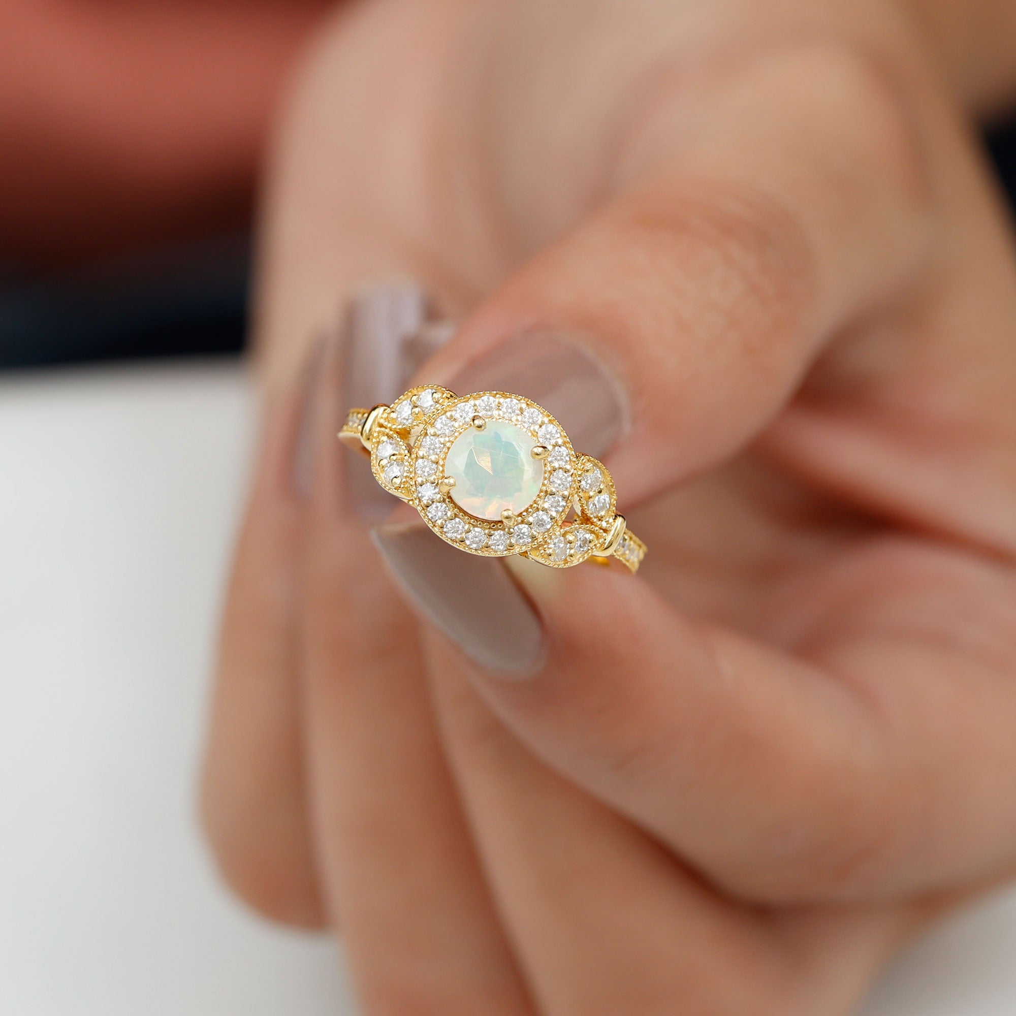 Romance meets old-world charm in this Vintage Inspired Engagement Ring, a design that feels like it was made for fairy tales. At the center shimmers a breathtaking 6 mm Round Shape Ethiopian Opal in Prong Setting, radiating rainbow hues that shift with every glance, a gemstone that captures the magic of love in all its colors. Encircled by a shimmering Diamond Halo and set on a beautifully crafted Vintage Style Band, this Halo Engagement Ring with Opal is rich with detail, featuring dainty Diamond stones and delicate Beaded detailing that add texture, sparkle and timeless appeal. The intricate craftsmanship gives it that heirloom feel, perfect for the bride who dreams of handwritten vows and love letters sealed with a kiss. Whether you are proposing or simply celebrating a once-in-a-lifetime kind of love, this Opal Diamond Engagement Ring delivers elegance, emotion and a touch of whimsy all in one. This Real Opal Ring arrives ready to wow in an elegant jewelry box and is available in a range of sizes to ensure the perfect fit. With its dreamy color play, vintage charm and endless sparkle, this Ethiopian Opal Ring is a story waiting to be told, over and over again.