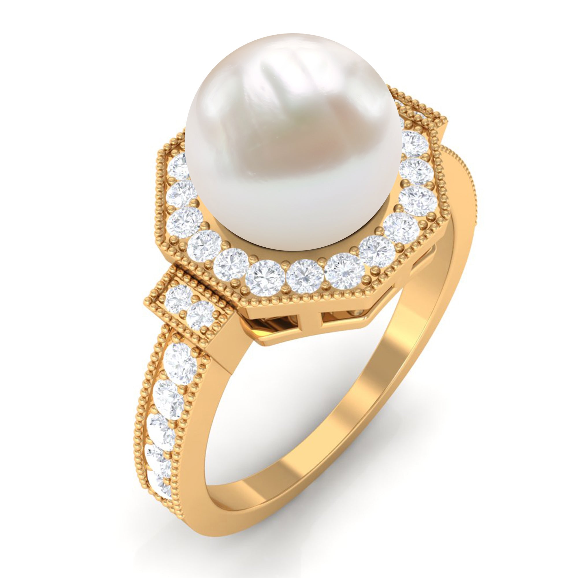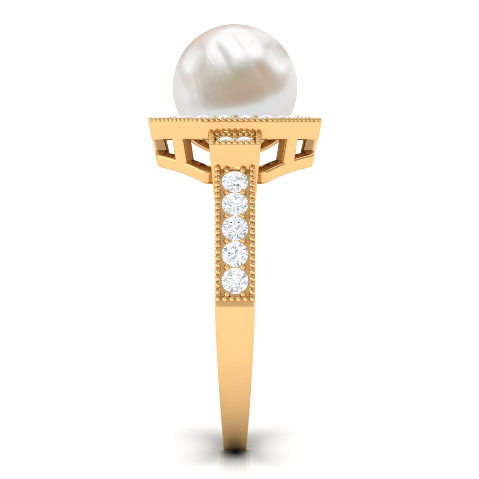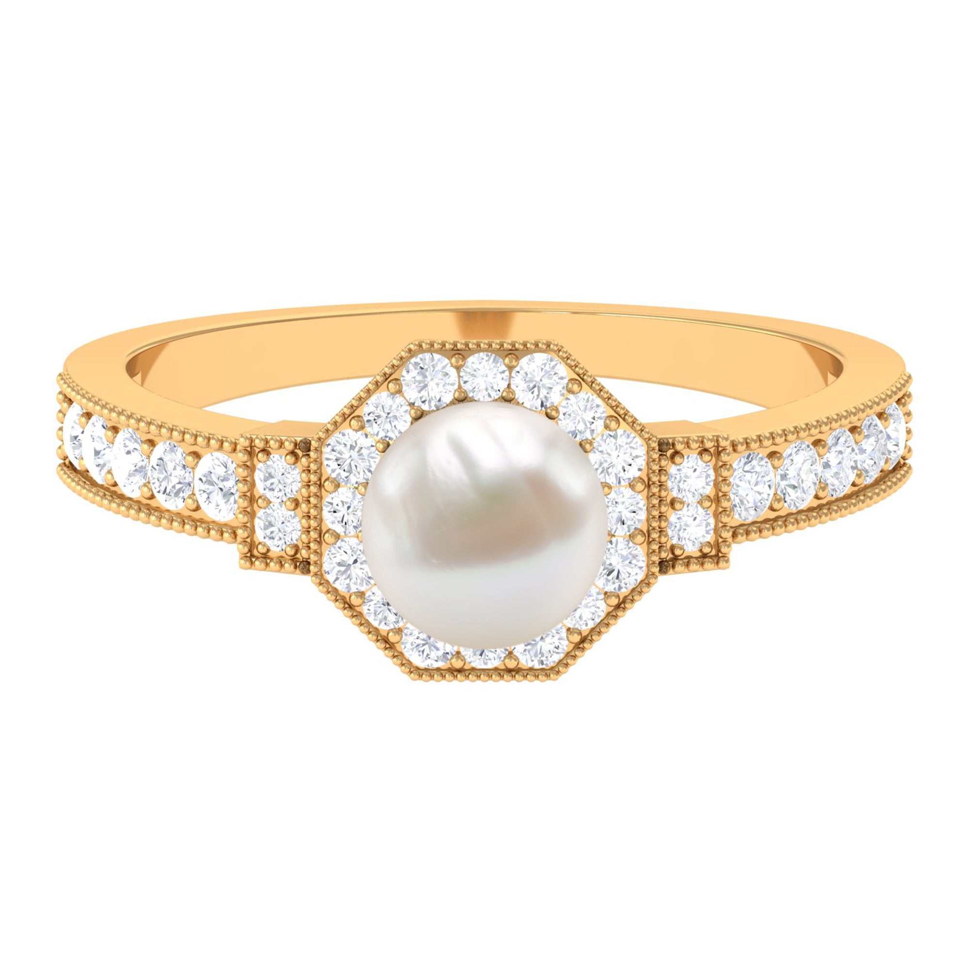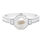 Channel the old-world queen in you by slipping on this Vintage Freshwater Pearl Ring! Exuding sheer radiance, it has been adorned with the centerpiece of 8 MM Round Shape Freshwater Pearl, made all the more dazzling with hexagonal Halo and sparkly side-stones of Diamond. It is finally let a finishing touch with Beaded detailing, bringing together its retro vibe.