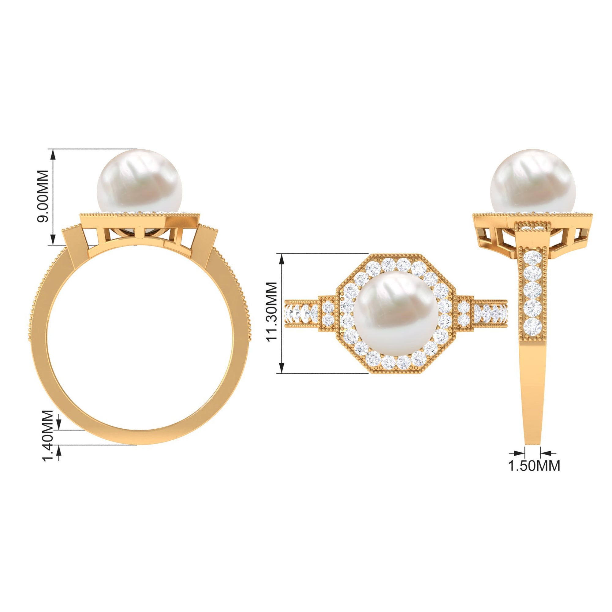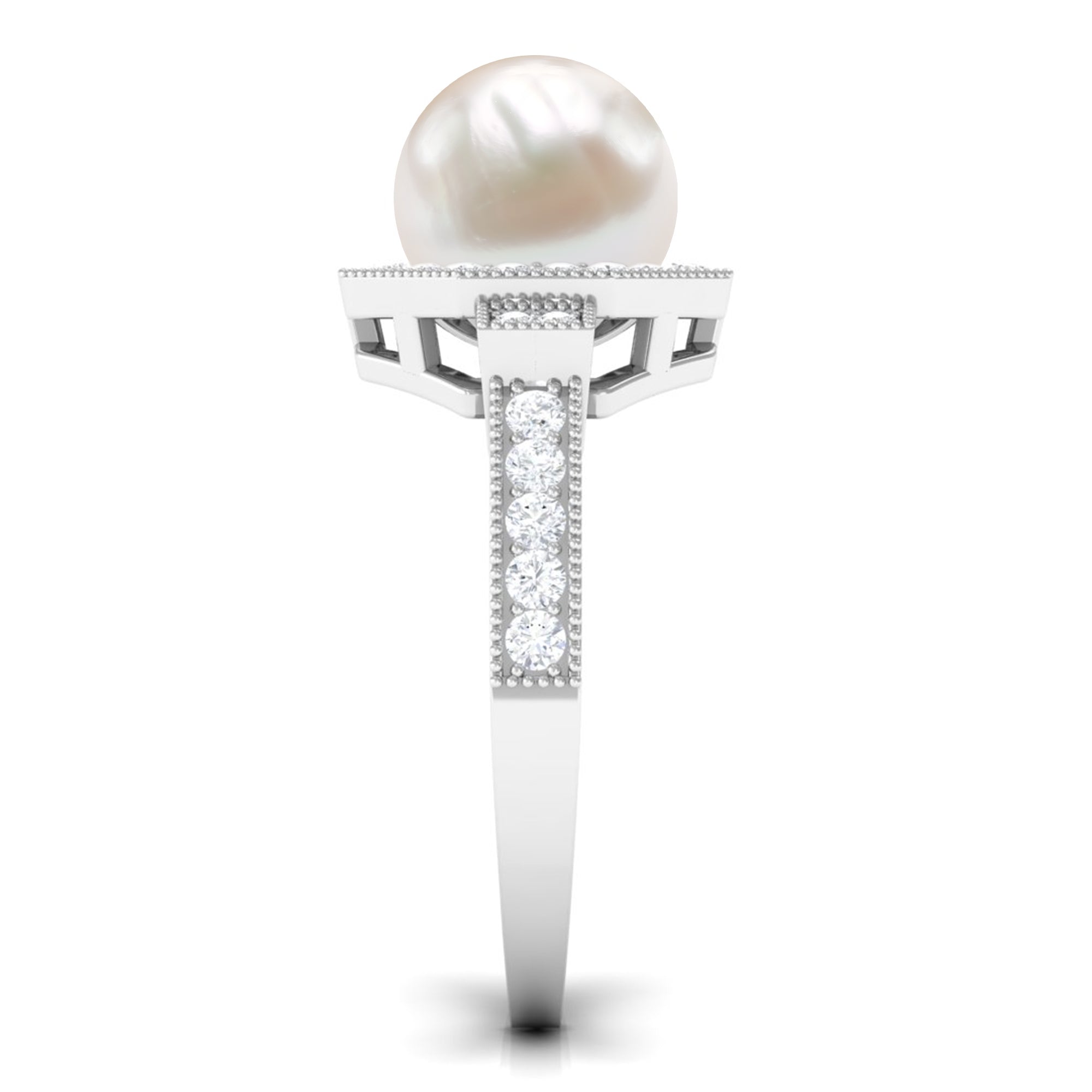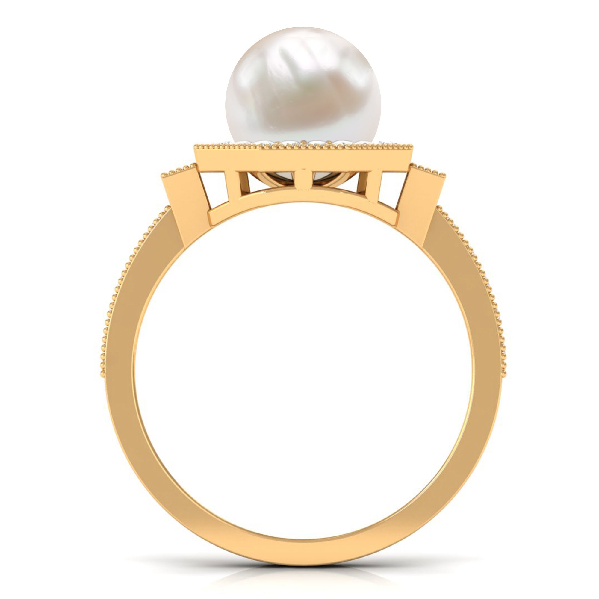 Channel the old-world queen in you by slipping on this Vintage Freshwater Pearl Ring! Exuding sheer radiance, it has been adorned with the centerpiece of 8 MM Round Shape Freshwater Pearl, made all the more dazzling with hexagonal Halo and sparkly side-stones of Diamond. It is finally let a finishing touch with Beaded detailing, bringing together its retro vibe.