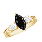 Evoke the timeless allure of vintage glamour with our Vintage Inspired Ring. At its heart, a resplendent Marquise Cut Lab Grown Black Diamond takes center stage in a secure prong setting. Flanking this stunning solitaire, Round Moissanite gems glisten on both sides. The intricately carved shank lends an artisanal charm to this exquisite piece.