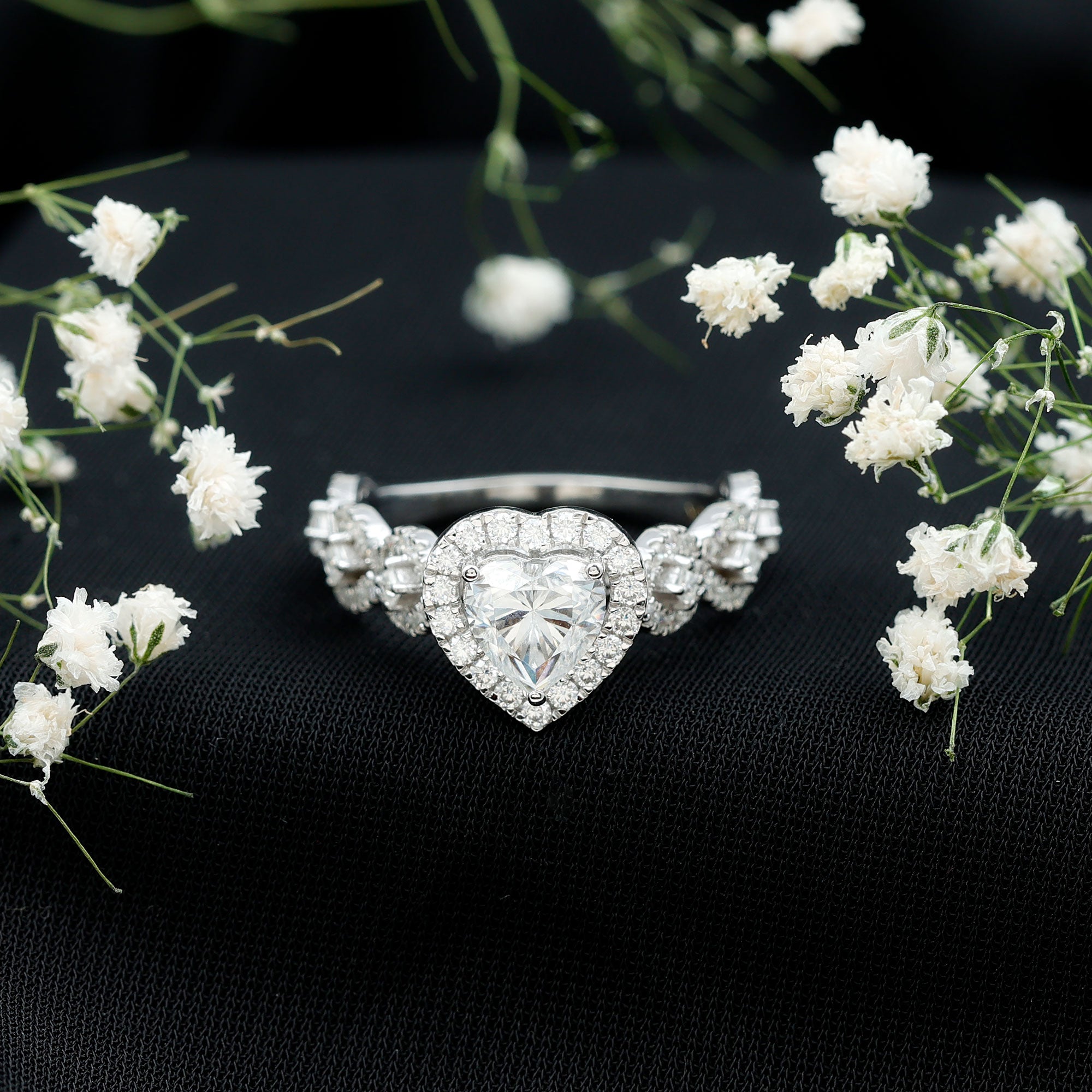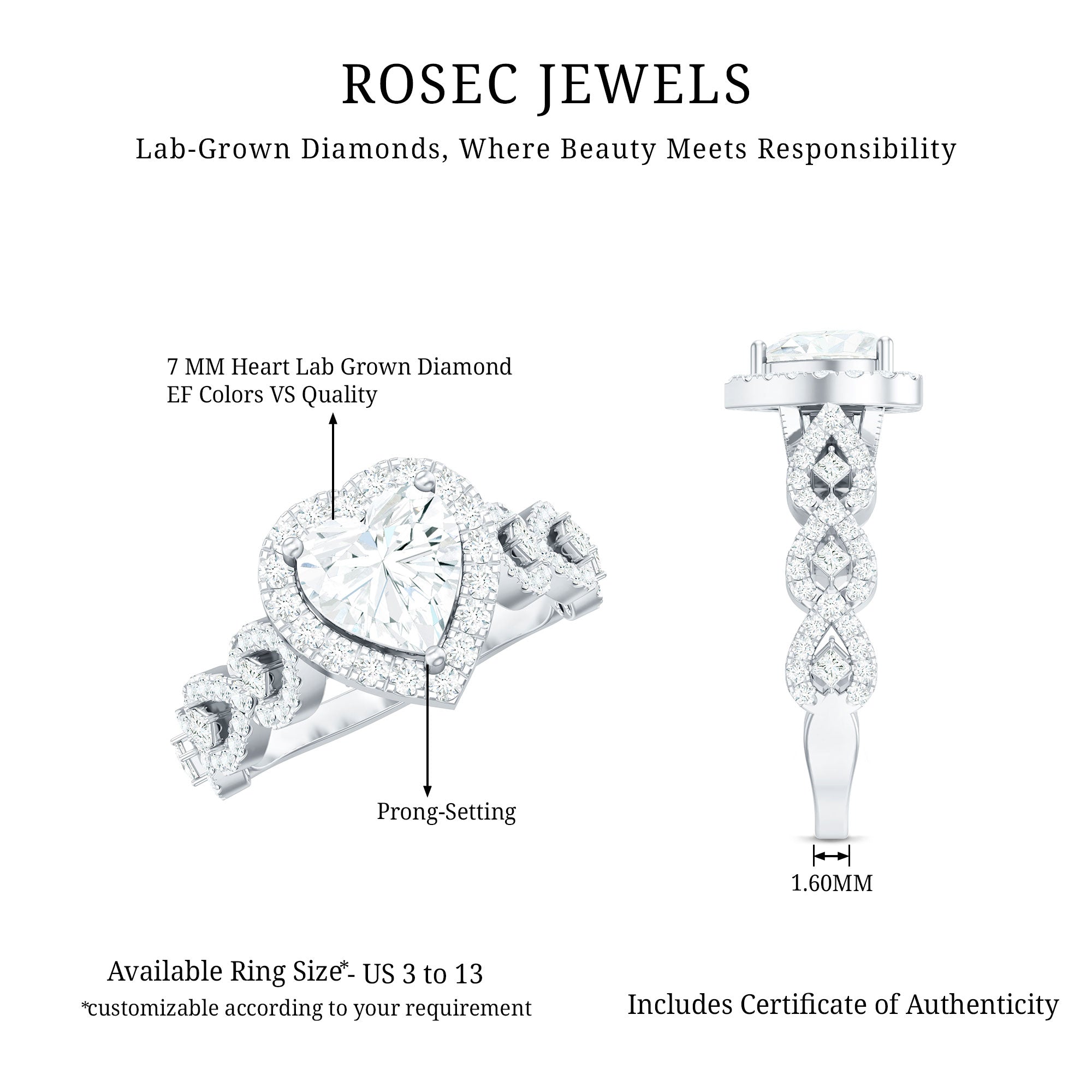 Enhance your special day with this captivating Diamond Heart Engagement Ring, perfect for your momentous occasion. Carefully handcrafted to reflect the allure of vintage elegance, it features a 7 MM Heart Shaped Lab Grown Diamond set in Prong Setting and encircled by a diamond halo. The radiance of this central stone is accentuated by a beautifully crafted band adorned with exquisite details. The band showcases round and princess cut side stones arranged in a vintage-inspired design, giving this Vintage Engagement Ring a timeless essence to celebrate your treasured moments. With its intricate craftsmanship, romantic charm, and enduring grace, this Lab Grown Diamond Engagement Ring is tailored for women who value both heritage and refinement. Additionally, all the gemstones in this Heart Diamond Ring for Women are lab-grown, making it a smart and eco-conscious choice. Whether you are starting a new adventure together or looking for a way to express your devotion, this budget-friendly Halo Engagement Ring will always serve as a reminder of the love you share.
