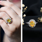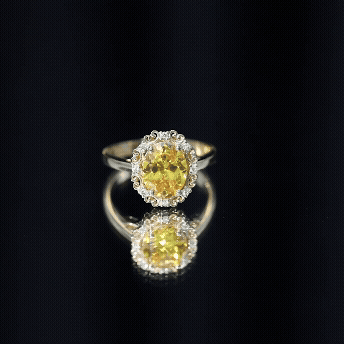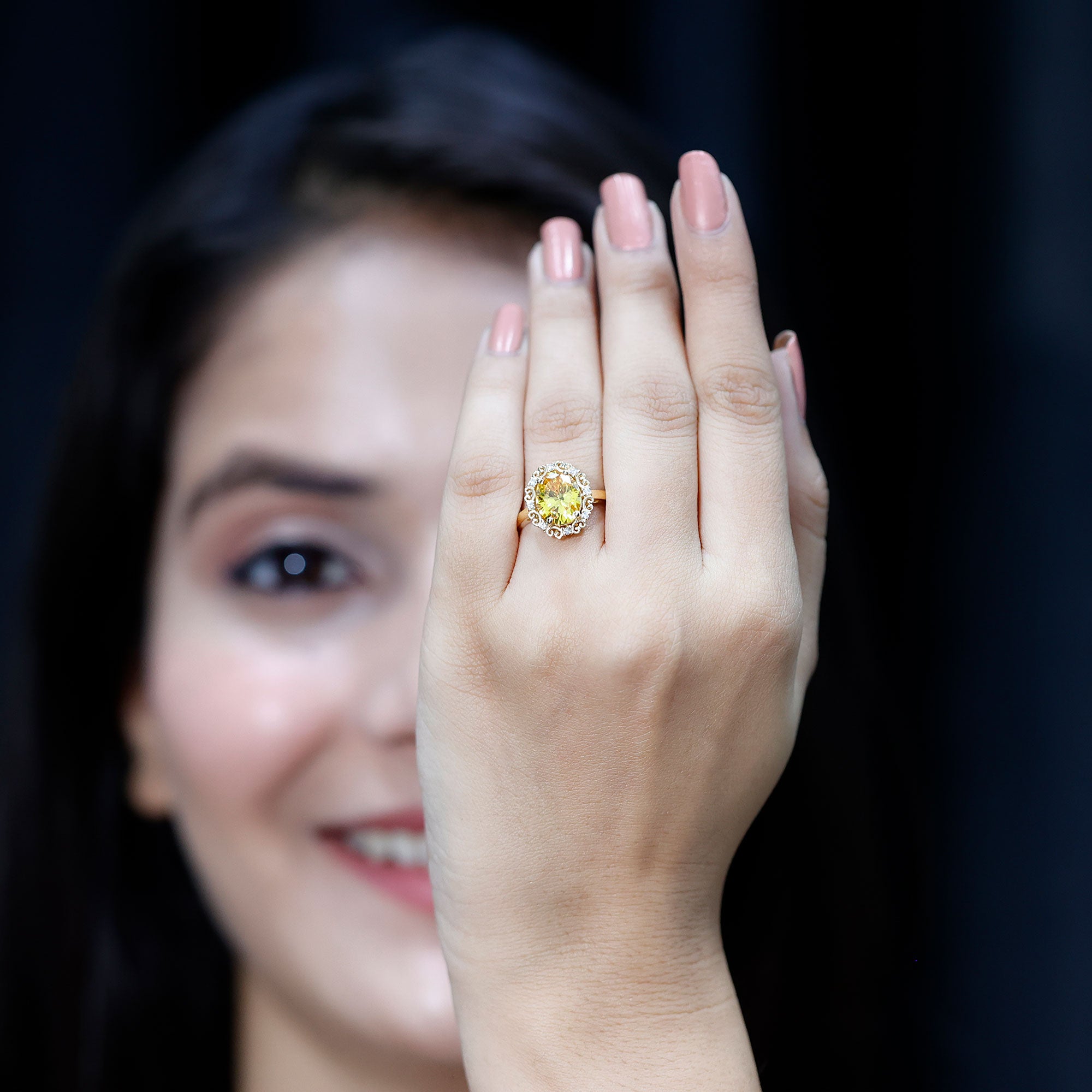 The Engagement Ring is embellished with an Oval Cut Lab Grown Yellow Sapphire secured by 4 Prong Setting, and Round Diamonds Accent, crafted with Hallmarked Metal. Express your love without saying much by presenting her with this exquisite Lab-Grown Yellow Sapphire Ring to make her even happier.