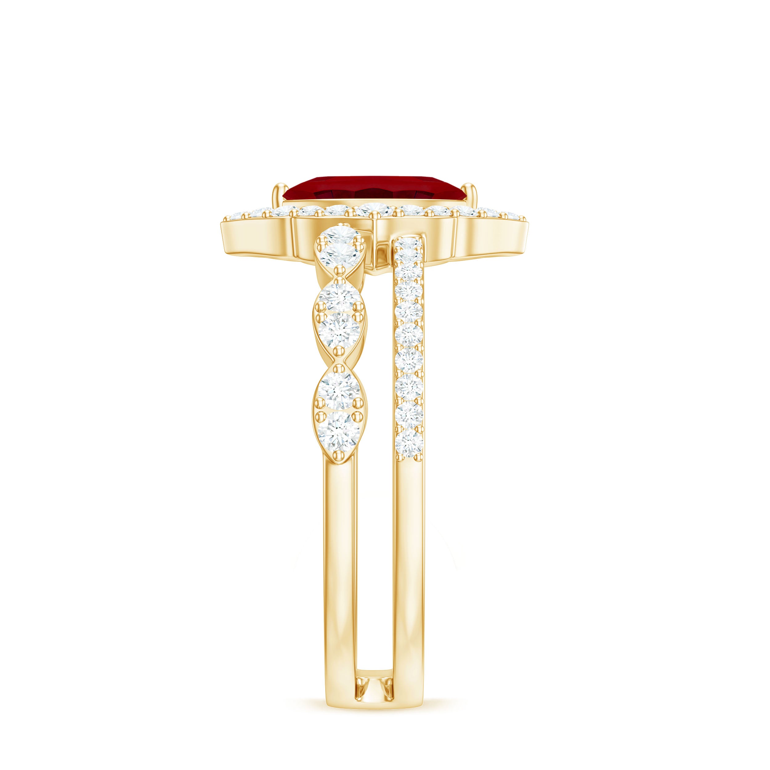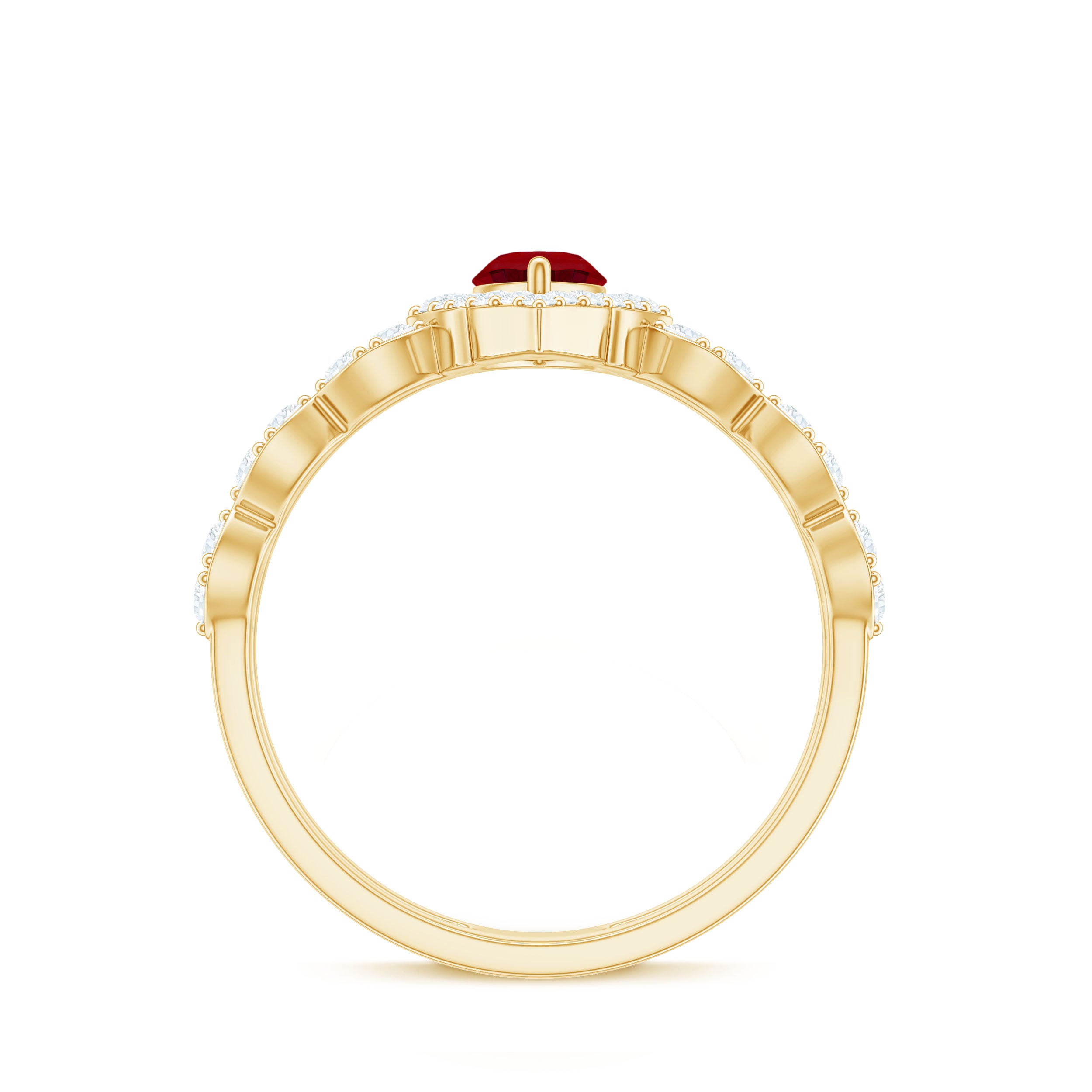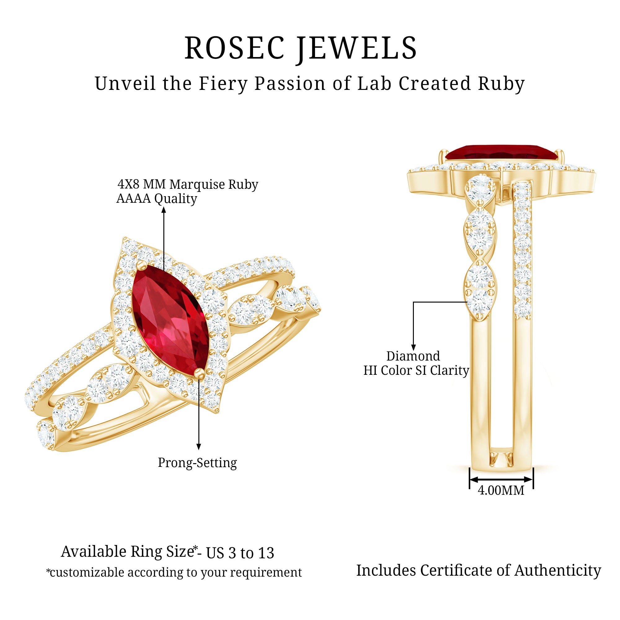 Give your special woman a ring that speaks of love, elegance, and timeless beauty. The Vintage Inspired Engagement Ring from Rosec Jewels is handcrafted with care and features a stunning 4X8 MM marquise shaped lab created ruby at its center. The ruby sits securely in a 2-prong setting, surrounded by a halo of real diamonds arranged in a lovely flower shape. The sparkling diamonds enhance the ruby’s glow, creating a perfect balance between vintage charm and modern brilliance. Every detail is designed to make the Marquise Engagement Ring stand out beautifully while still feeling comfortable to wear every day. Adding to its charm, the double band is finely studded with shimmering diamonds, giving the Vintage Ruby Ring extra sparkle and sophistication. The smooth and secure design ensures a comfortable fit, while the overall look stays elegant and classy. Crafted in premium precious metal, you can choose from different color and purity options to match your taste. Presented in our signature luxury box, this Double Band Ring is a heartfelt promise of love, crafted to be treasured for a lifetime.