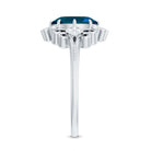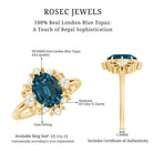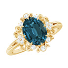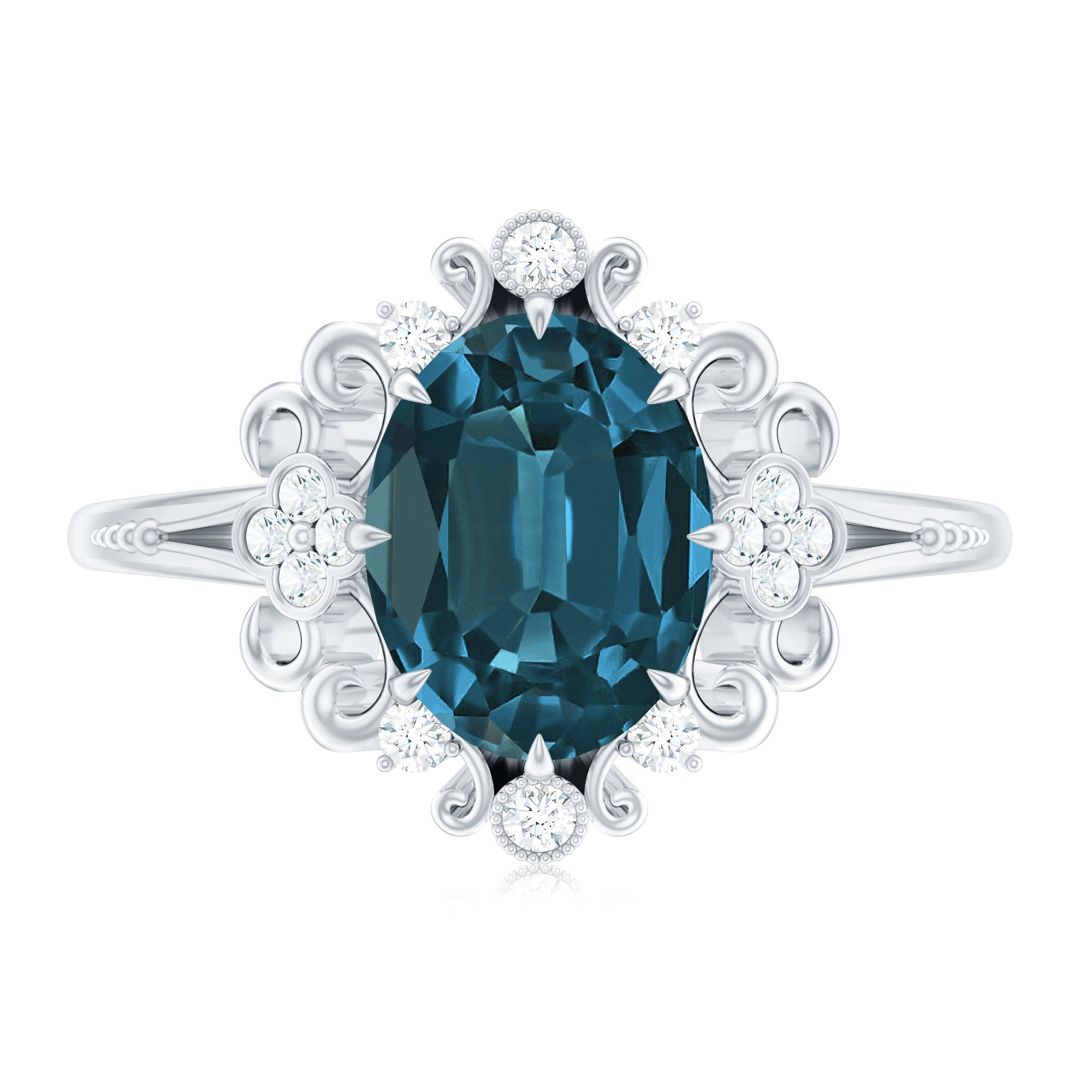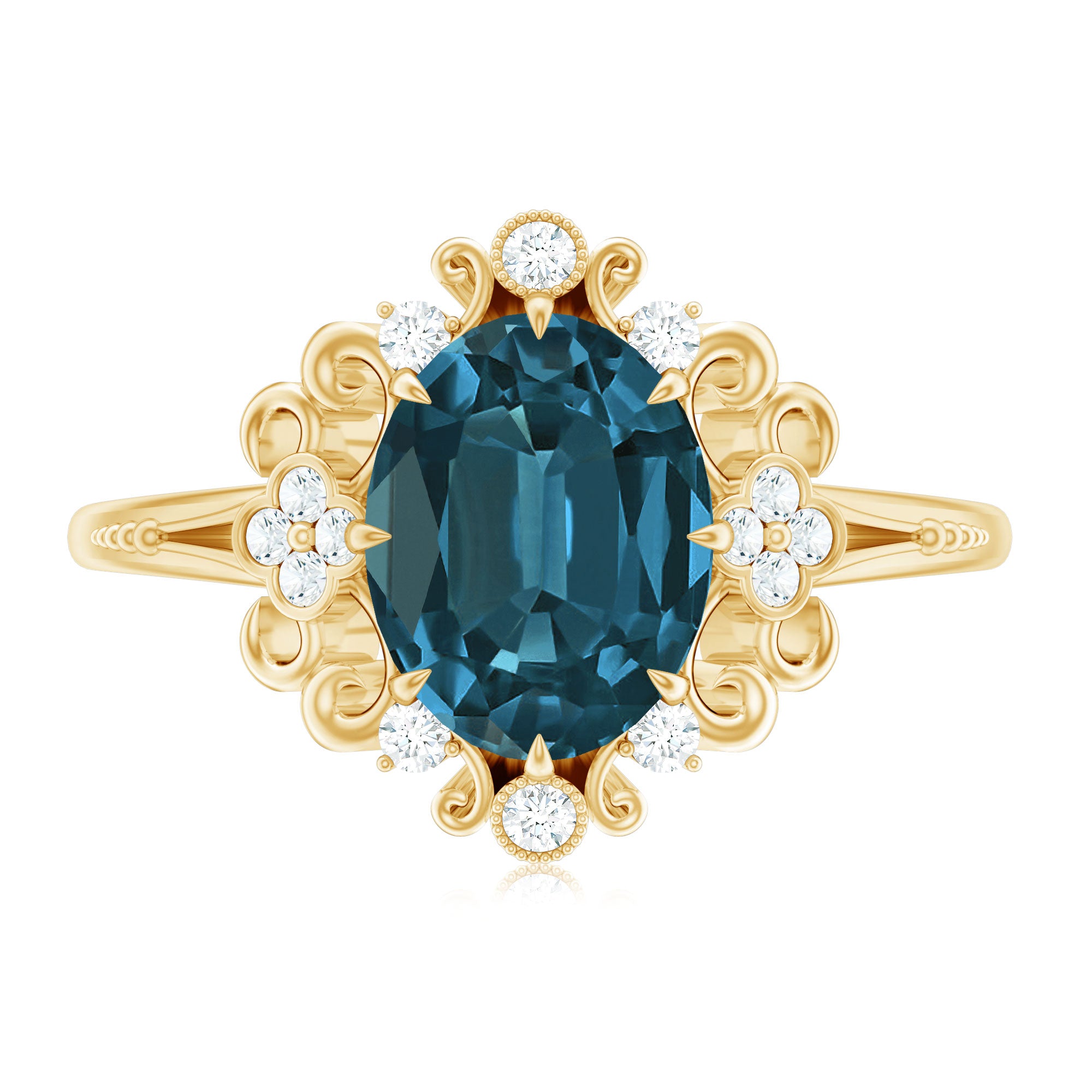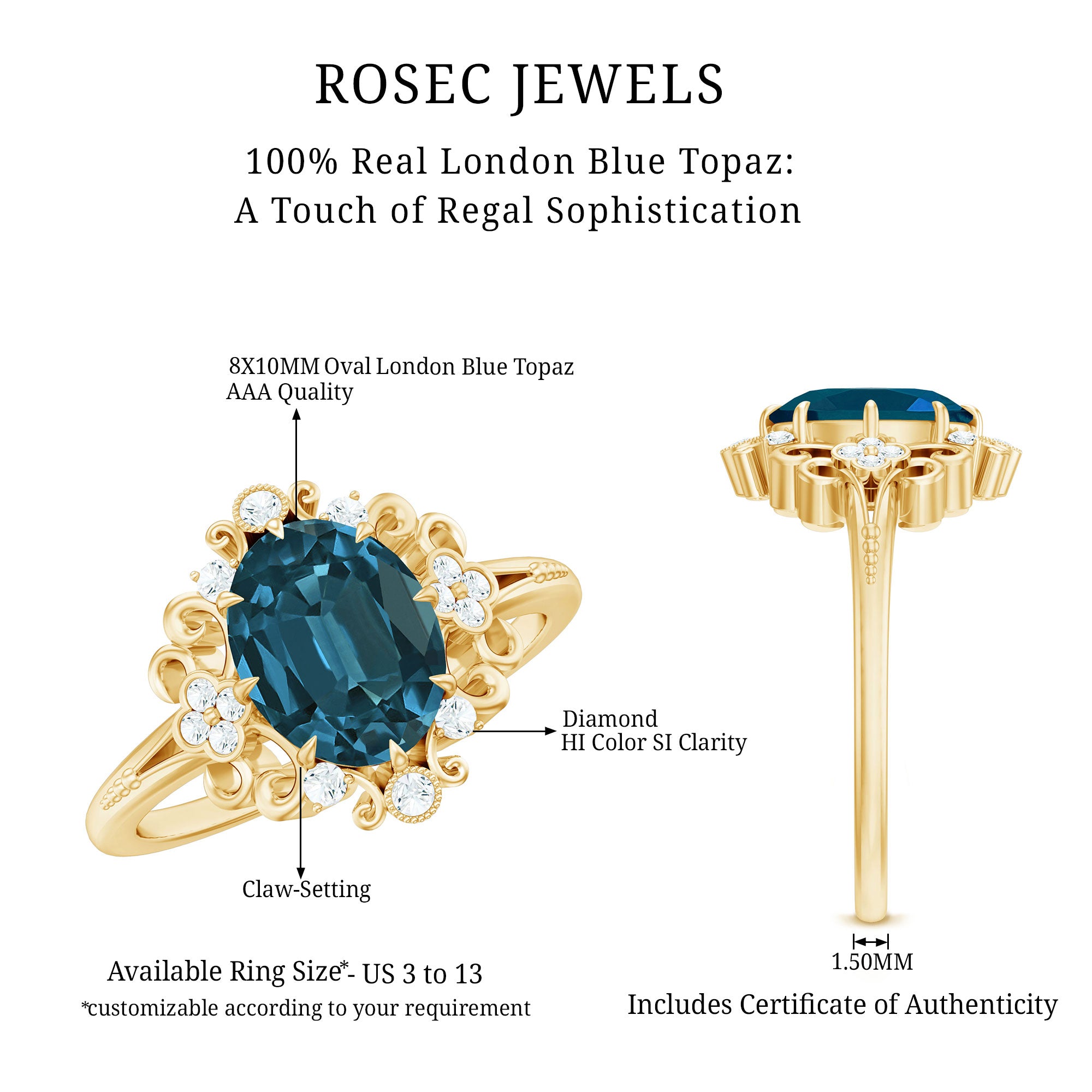 This exquisite Vintage Inspired Engagement Ring merges timeless elegance with a hint of modern allure. At its core, a stunning 8X10 MM oval cut london blue topaz radiates, securely held in claw setting. Surrounding the centerpiece are dazzling diamond stones, artfully arranged within elaborated vintage-style motifs that enhance the design character. The meticulous craftsmanship imparts a graceful and antique essence to the Oval Cut Engagement Ring while preserving a contemporary aesthetic. Each component, from the intricate metalwork to the precisely set diamonds, is crafted to accentuate the vibrant hue and brilliance of blue topaz. Ideal for the bride who cherishes tradition yet values uniqueness, this piece harmonizes old-world romance with modern elegance. It is adaptable enough to enhance both classic and contemporary bridal fashions, making it a significant choice for a lifetime of love. Meticulously crafted with attention to detail, this Real Blue Topaz and Diamond Engagement Ring is designed to endure and shine for many years. It comes presented in a lovely jewelry box, ready for gifting, and includes a Certificate of Authenticity to guarantee the quality and craftsmanship of your piece. With its deep color, shimmering details, and thoughtful design, this Vintage Blue Topaz Ring is a genuine tribute to love and everlasting beauty.