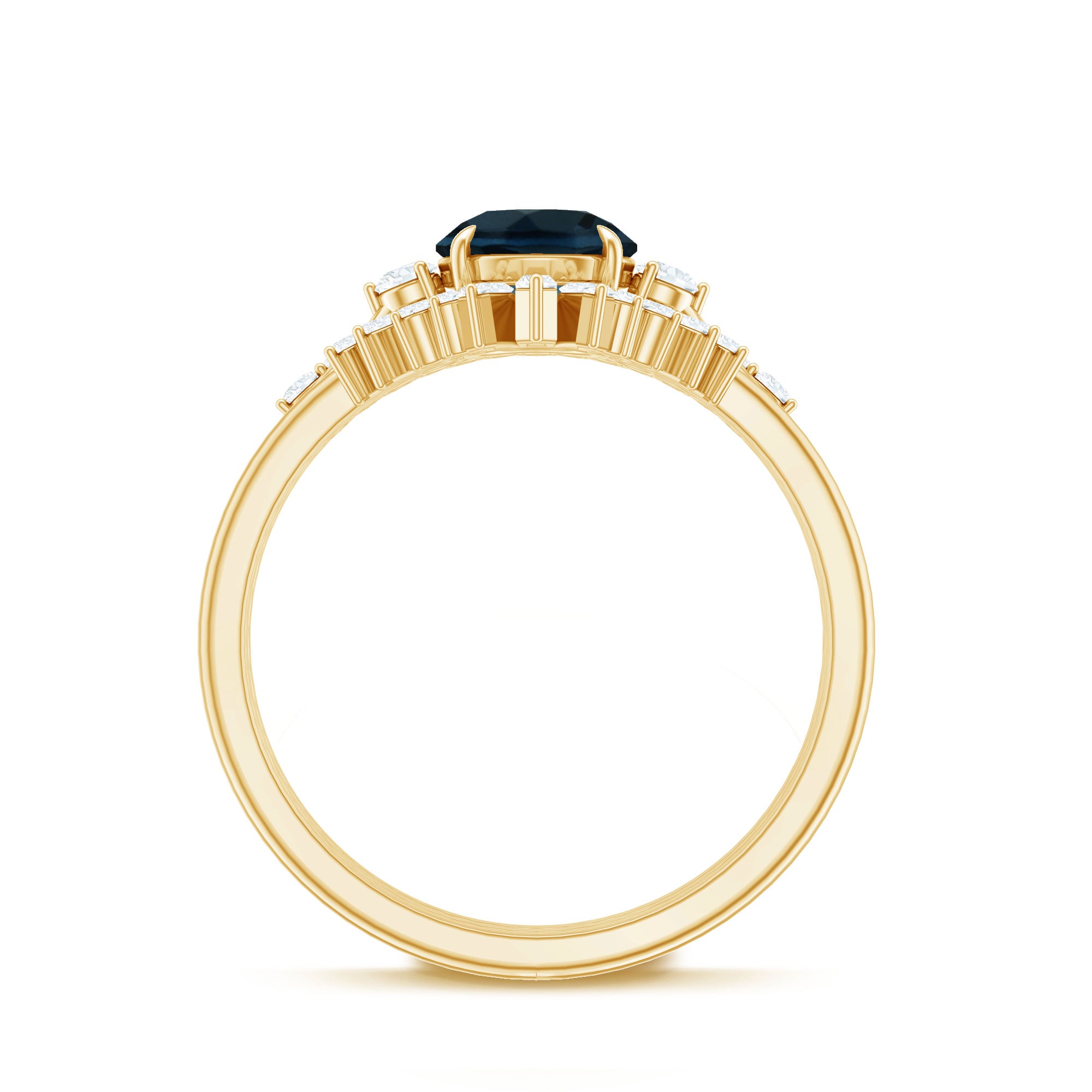Resembling a relic from bygone days, this London Blue Topaz Bridal Ring Set narrates a tale of everlasting love and beauty. It features a 7 MM round cut London Blue Topaz, securely held in a claw setting. Flanking each side, a radiant diamond contributes the ideal amount of sparkle, enhancing the balance and elegance of the engagement ring. What distinguishes this Blue Topaz Wedding Ring Set is the inclusion of two enhancer bands. One band showcases a combination of round and baguette diamonds, exuding a striking sparkle that is both bold and timeless. The other band is adorned with round diamonds, adding a touch of grace. Collectively, they beautifully frame the central blue topaz ring, creating a stacked appearance that is both dramatic and romantic. This Trio Bridal Ring Set is designed for brides who appreciate a vintage aesthetic while desiring a hint of modernity. Whether you cherish heirloom details or simply seek a ring that makes a statement, this Engagement Ring with Enhancers offers an exquisite fusion of classic elegance and contemporary sparkle. A genuine testament to love, style, and enduring beauty.