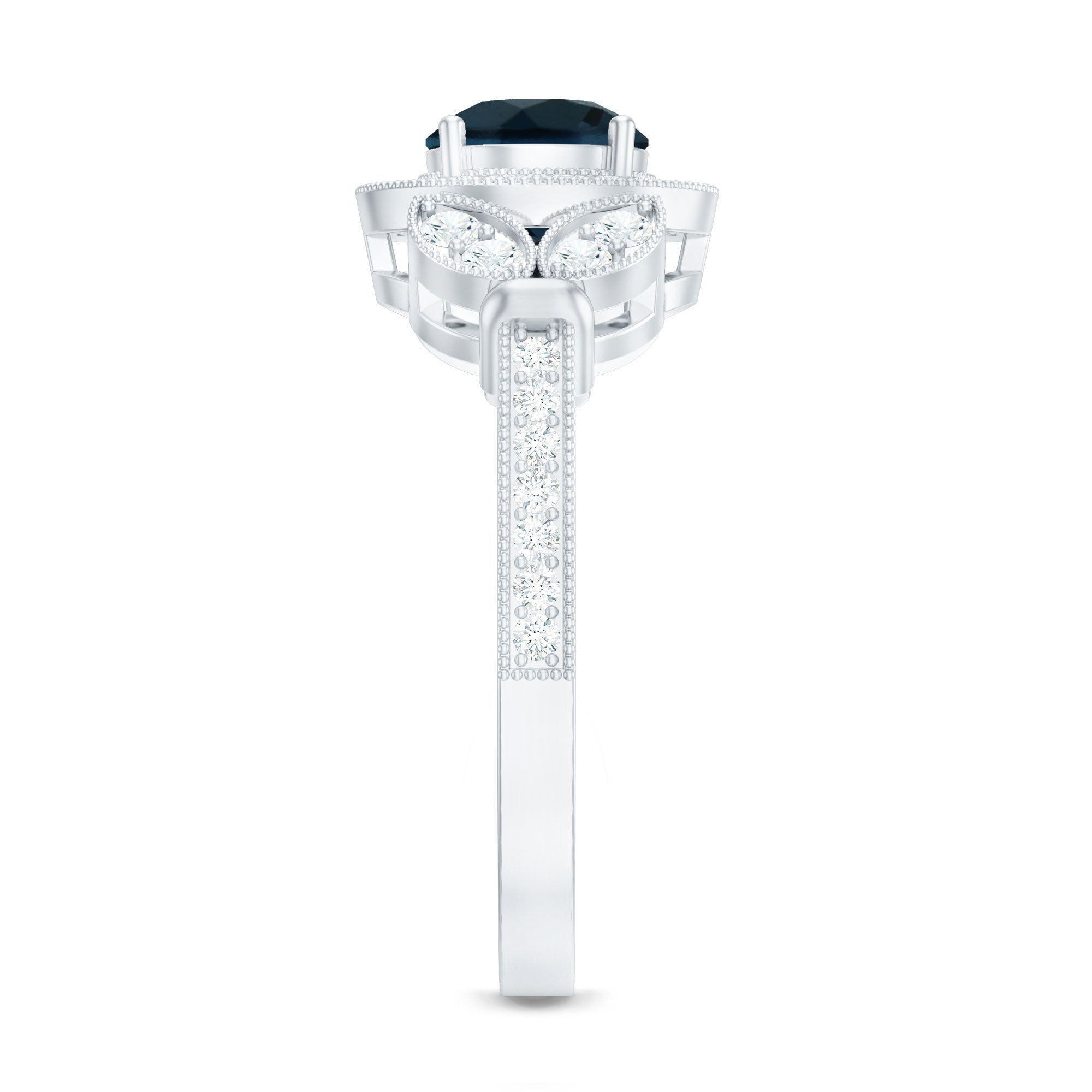 Enter a realm where everlasting love and timeless elegance unite in flawless harmony. This Vintage Inspired Engagement Ring showcases a breathtaking 7 MM round shape London Blue Topaz at its core. The blue topaz is securely held in prong setting, making it the focal point of the design. Encircling the central stone is a dazzling halo of diamonds that reflect light from every direction, enhancing its brilliance and sophistication. The band itself is a masterpiece, adorned with intricate beaded details and petite diamonds that impart a vintage charm. This Blue Topaz and Diamond Engagement Ring embodies the allure and romance of traditional craftsmanship while still feeling contemporary and unique for today’s bride. Ideal for those who appreciate vintage-inspired jewelry, this London Blue Topaz Ring narrates a story of eternity. It is available in various sizes to ensure a perfect fit and is elegantly packaged in a refined jewelry box, ready to become a treasured keepsake. With its AAA quality blue topaz, radiant HI-SI quality diamonds, and vintage-inspired design, this Retro Engagement Ring is a piece of your love story poised to be worn daily.